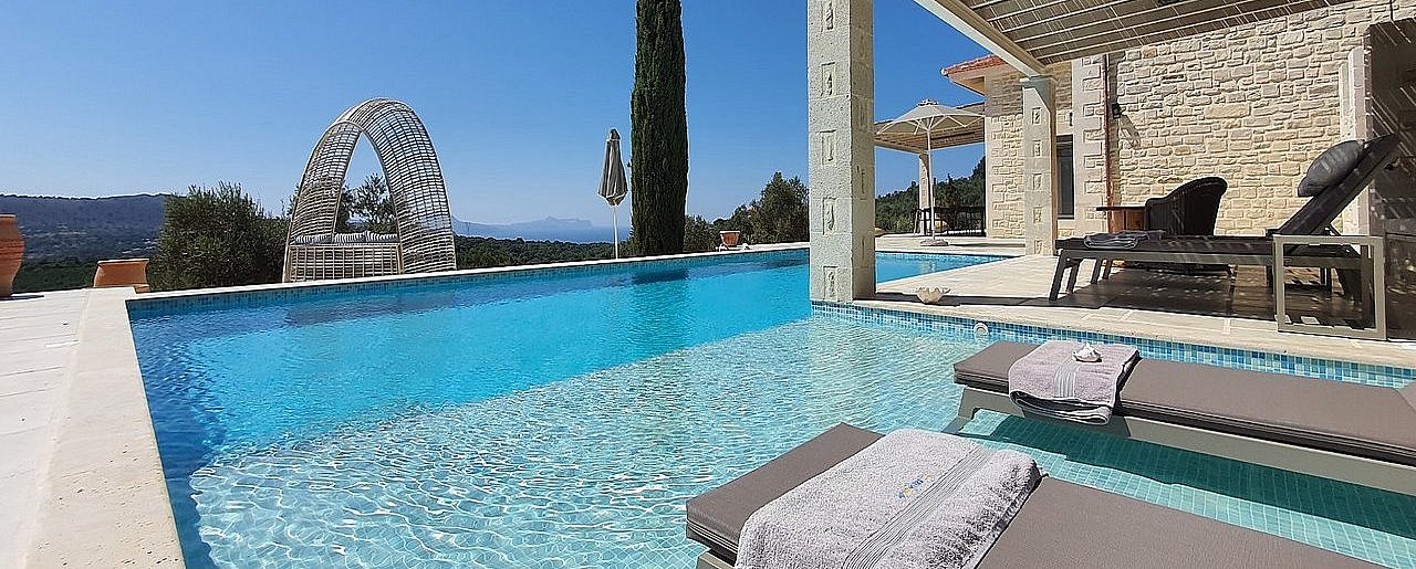 Villa Kali Zoi ("Good Life") is a new villa built of natural stone, Has just been completed and is located in a dreamlike olive grove on a plot of approx. 4,700 square meters between Prines and Gonia. The view extends from the White Mountains, over the hinterland, the sea, and the Akrotiri peninsula, with fantastic sunsets. Here you can enjoy the "good life". The village of Gonia, with taverns, and mini market is also within walking distance. It is about 5 minutes to Prines and a good 10 minutes to Rethymnon. The "Kali Zoi" is a spacious villa of approx. 190 square meters and has 2 large bedrooms, each with an en-suite bathroom and an additional approx. 4x4 m outdoor shower and also with the heated pool. In the large living and dining area you will find the cpl. equipped kitchen with cooking island and counter, as well as a comfortable corner sofa that invites you to relax. There is also a guest toilet with storage space and washer/dryer. The terrace on the other side can also be reached from the living-dining area, where you can also eat comfortably. The first bedroom has a double bed 200 x 210 cm. The second bedroom has a double bed 180 x 200 cm, which can also be divided into two single beds 90 x 200 cm. If it is used as a double bed, it has a topper, so you have a continuous lying surface. The mattresses are very comfortable and back-friendly. We have furnished our villa in a modern, comfortable and high-quality manner with many wooden elements. So you can feel completely at home and relax. The windows are fitted with fly screens. The bedrooms can be darkened with roller blinds and blackout curtains. The bedrooms and the living-dining area are equipped with air conditioning and smart TVs. She also has an Astra satellite system with almost all free German channels. The villa has unlimited WiFi throughout the house and in the pool area. Each bedroom has a safe. Underfloor heating throughout the house (payment on site) provides additional comfort, which also makes the house interesting for long-term vacationers in the colder months. There is also a modern wood stove. In addition, the villa is of course equipped with towels, bath towels, pool towels and bed linen. (Baby cot and high chair available if required) A washing machine, ironing board and iron are of course at your disposal. The house is cleaned once a week, twice on request. The whole house and the pool area are designed at ground level. The terrace is equipped with comfortable loungers with cushions and a lounge area on the pool deck. In addition, there is a comfortable lounger island and parasols on the terrace. The garden is Mediterranean. Enjoy your morning exercise on the large terrace. The villa is equipped with a yoga mat. If desired, Mira, the yoga teacher, can be booked and will be happy to come to your villa. Or book a massage directly in the villa. Enjoy the great view while having dinner on the terrace facing the sea. Or chill out on the pool deck. Thepool has approx. 65 square meters, is approx. 11 m long and has an additional shallow water zone. If you wish, a pool heater is also available. Here is also the approx. 7x 4 m large pool deck and the pool terrace. Part of the terraces and the pool deck are shaded with bamboo. There is an additional outdoor shower by the pool. You can show off your cooking skills on the gas grill. You can park your car under the shady carport. Enjoy the most beautiful days of the year in this dreamy villa. The village of Gonia can also be reached on foot. There is a mini market, a very good taverna and a coffee ion. You can reach the nearest beach after about 7 km. Normal move-in time is 2:00 p.m. and move-out time is 10:00 a.m. Interior: Kitchen island, Nespresso machine, filter coffee machine, toaster, kettle, electric juicer, elevated dishwasher, elevated oven, stove, microwave, washer/dryer, vacuum cleaner, iron, ironing board, towels, bath towels, pool towels, tea towels, hair dryer, Make-Up Mirror lighted, bathroom scales , music system with Blue-Tooth, WiFi throughout the house and in the pool area without data limitation, small library, board games, 5 showers, 2 bathrooms (each bathroom has access to its own outdoor shower) guest toilet, a safe in each bedroom, storage room.... Exterior equipment: Garden, gas grill, shaded pool deck, Heated Pool (with fees) comfortable loungers with cushions, sunbathing island, parasols, shaded dining areas on both sides of the villa, shaded carport... Technology: Satellite system (Astra satellite dish), many German channels, radio, television, free WiFi without data limitation. Extras: shaded carport, Info: For stays of more than 7 nights, an intermediate cleaning in the middle of the booked period is included. If desired, several intermediate cleanings, or intermediate cleanings for shorter stays can be organsied, please aks Us.