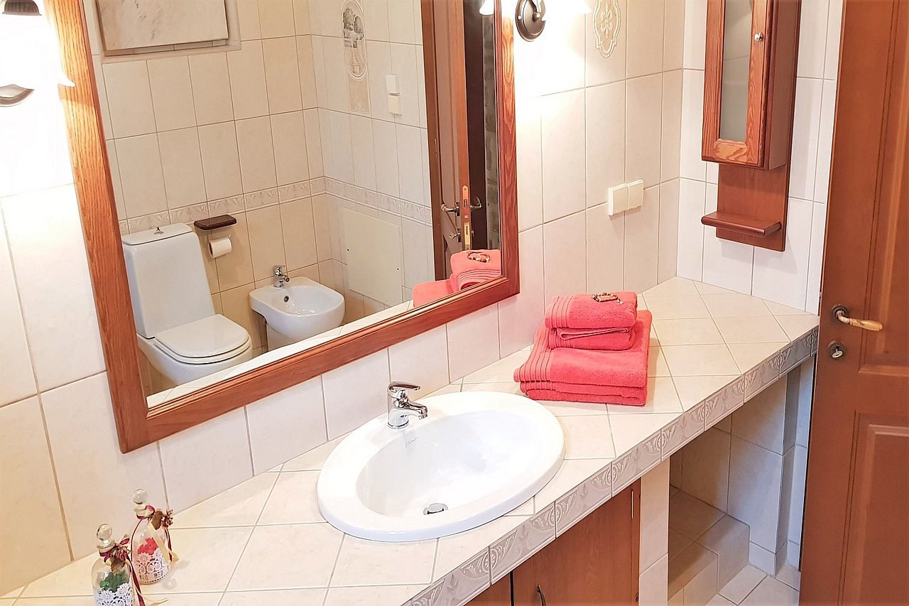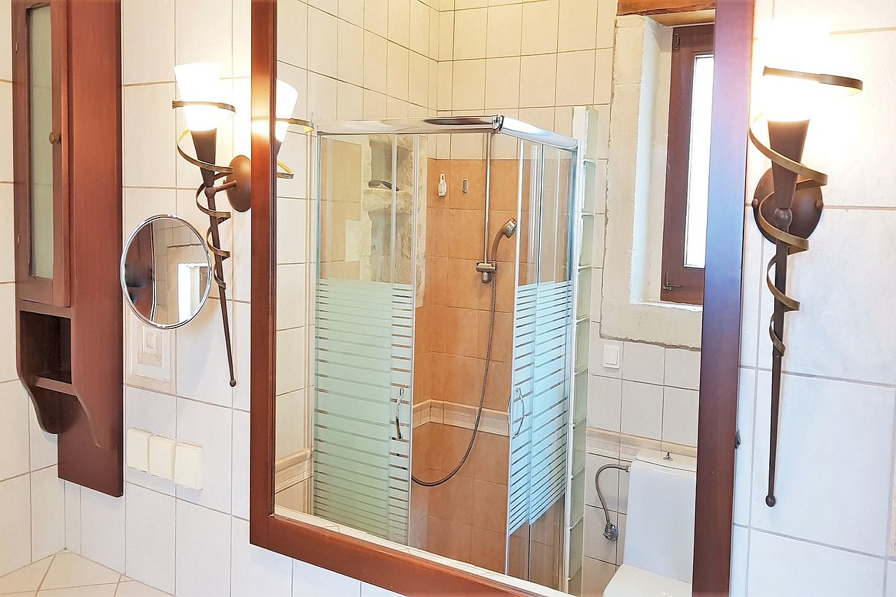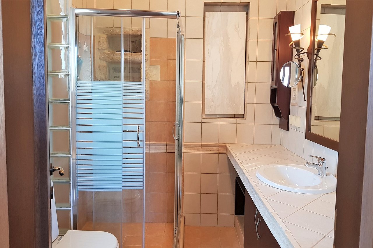 Das Schlafzimmer im Obergeschoß verfügt über ein en Suite-Bad mit großer Dusche, Waschtisch, Toilette und Bidet. Auf dieser Ebene befindet sich die kleinere Dachterrasse (ca. 4x4 m).