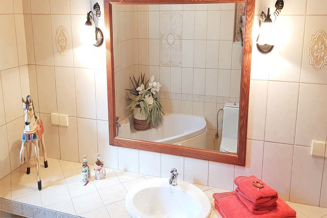 Sie hat 3 Schlafzimmer für 6 Personen und 3 Bäder. Auf der Empore gibt es die Möglichkeit bequem 2 weitere Personen unterzubringen. Jedes der Schlafzimmer im Erdgeschoß hat eine eigene Terrasse. Ein Bad mit Dusche liegt zwischen den beiden Schlafzimmern. Hier ist auch die Waschmaschine untergebracht. Das zweite Bad ist am Wohnbereich angeschlossen und verfügt über eine Eckbadewanne, sowie Wachtisch, Toilette und Bidet. Alle Bäder sind Tageslichtbäder.
