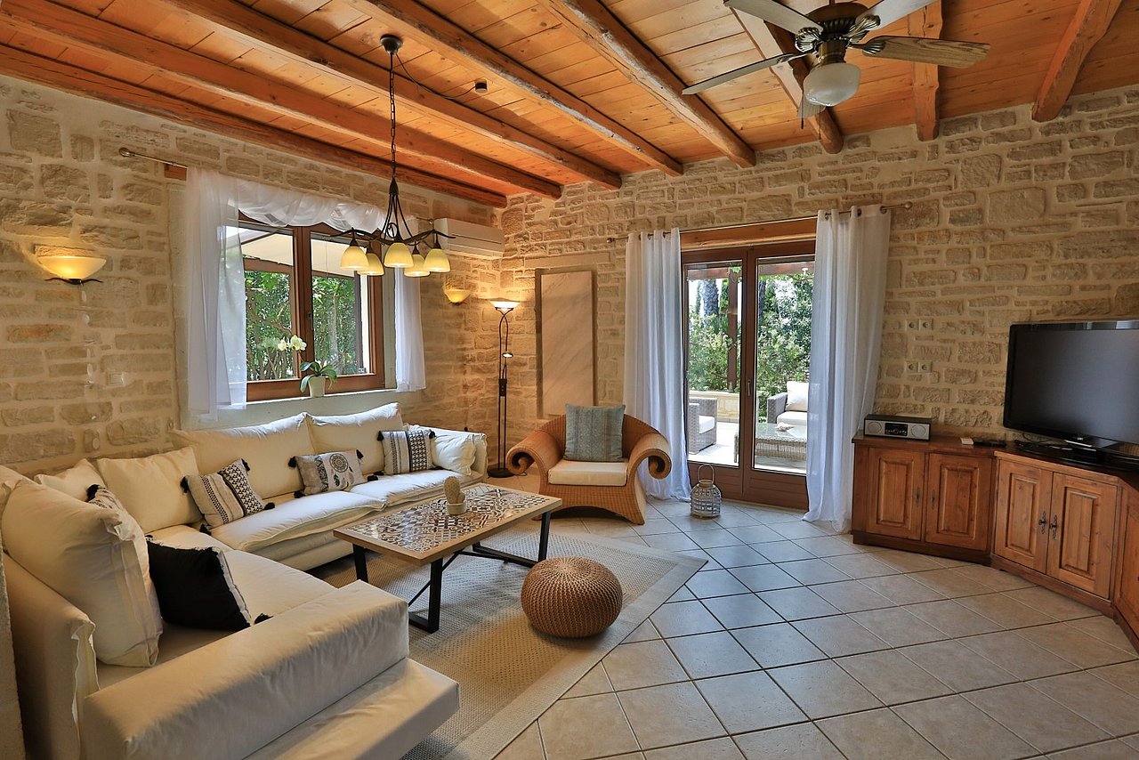 Im Wohnzimmer befindet sich der große TV und eine Stereoanlage mit Bluetooth. Außerdem verfügt die Villa über einen festen Internetanschluss mit Flatrate und W-Lan, auch auf den Terrassen.
