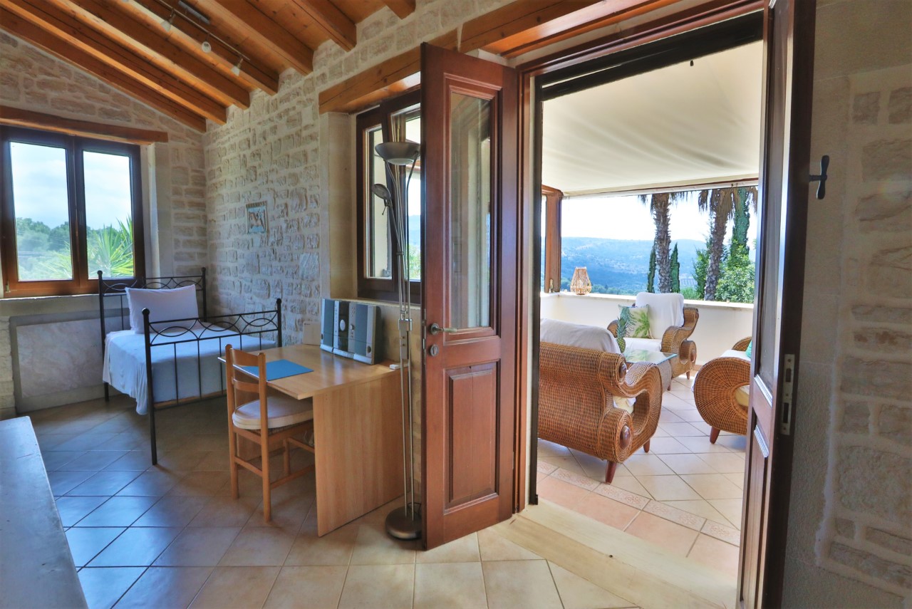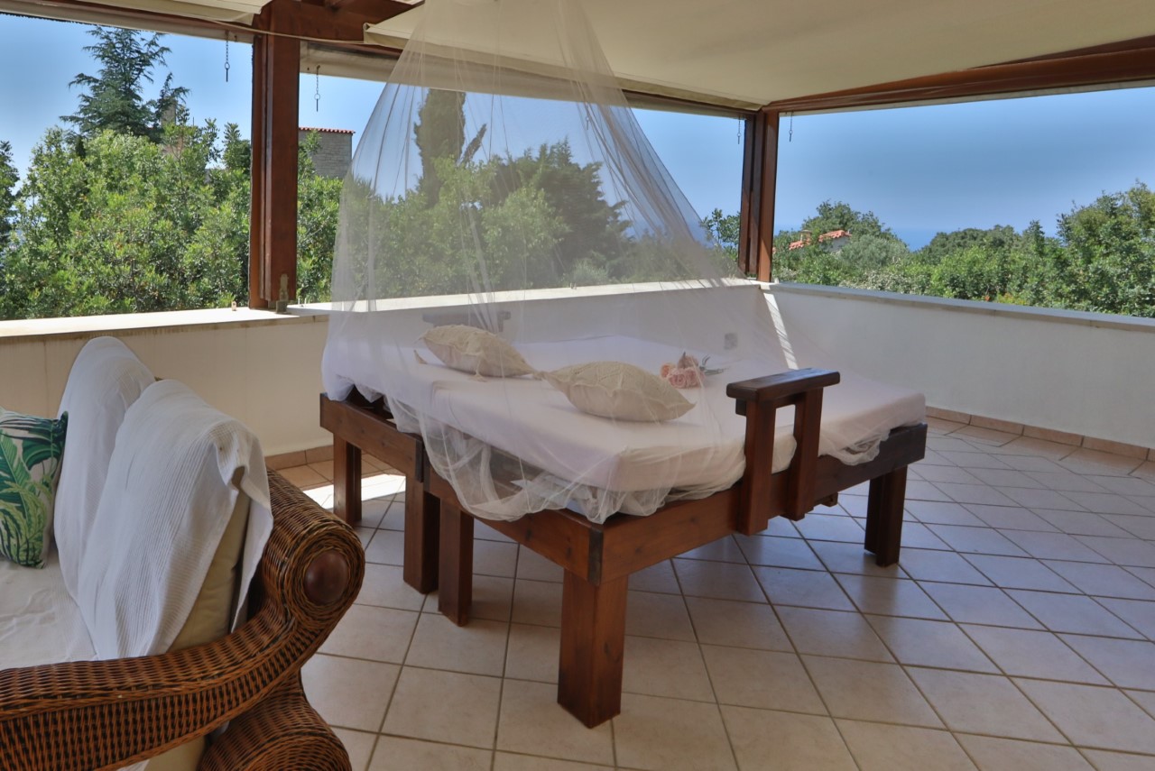 Von hier haben Sie Zugang zur großen beschatteten Dachterrasse (10x4 m) mit traumhaft weitem Blick und einem außen Bett das zum entspannen einlädt.