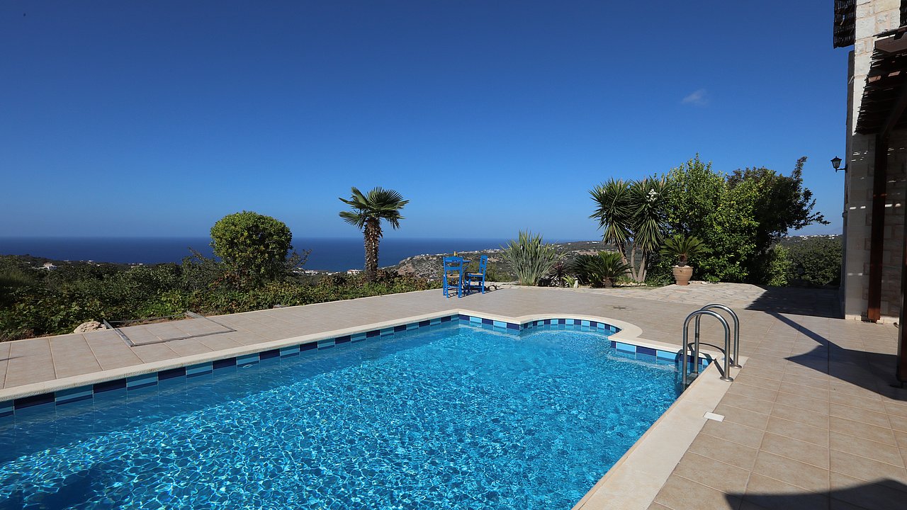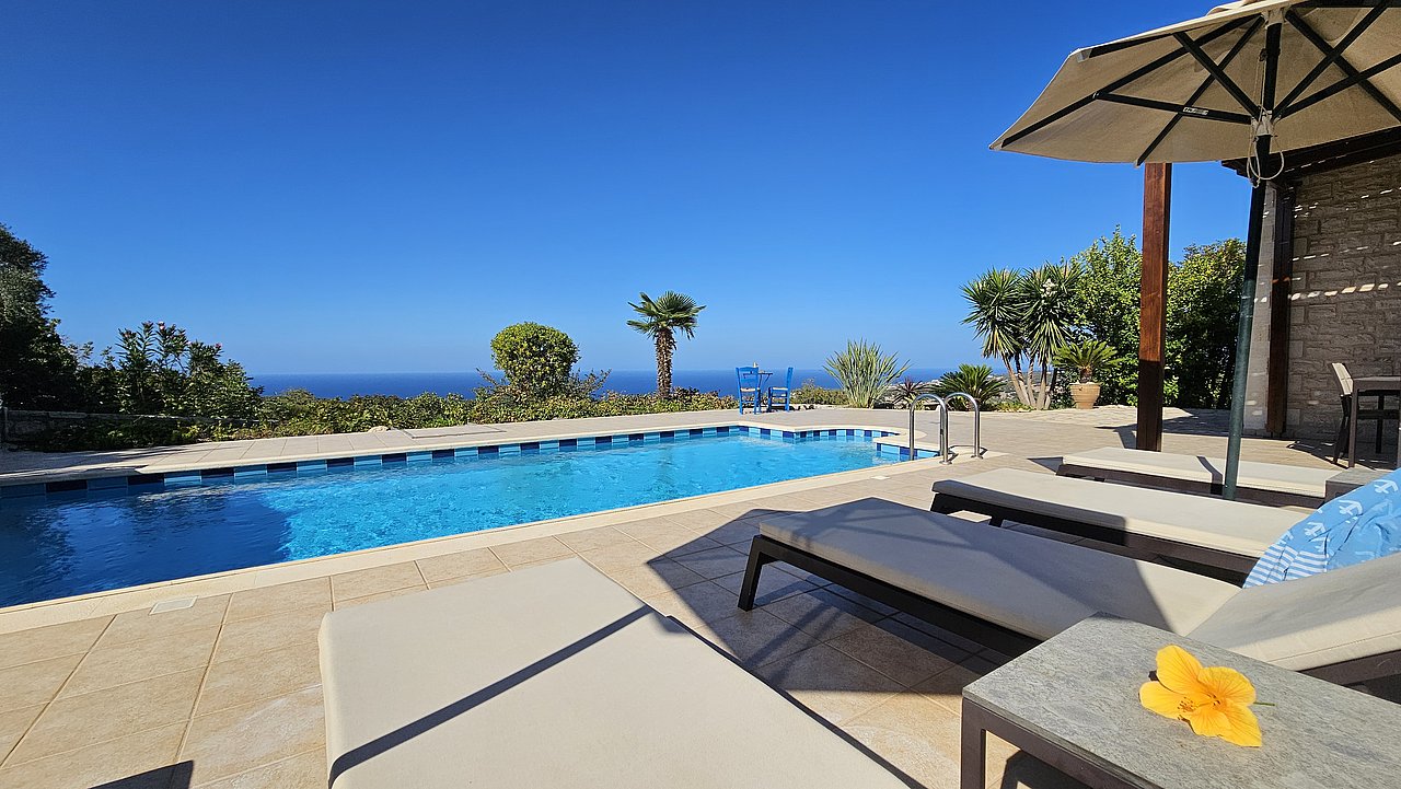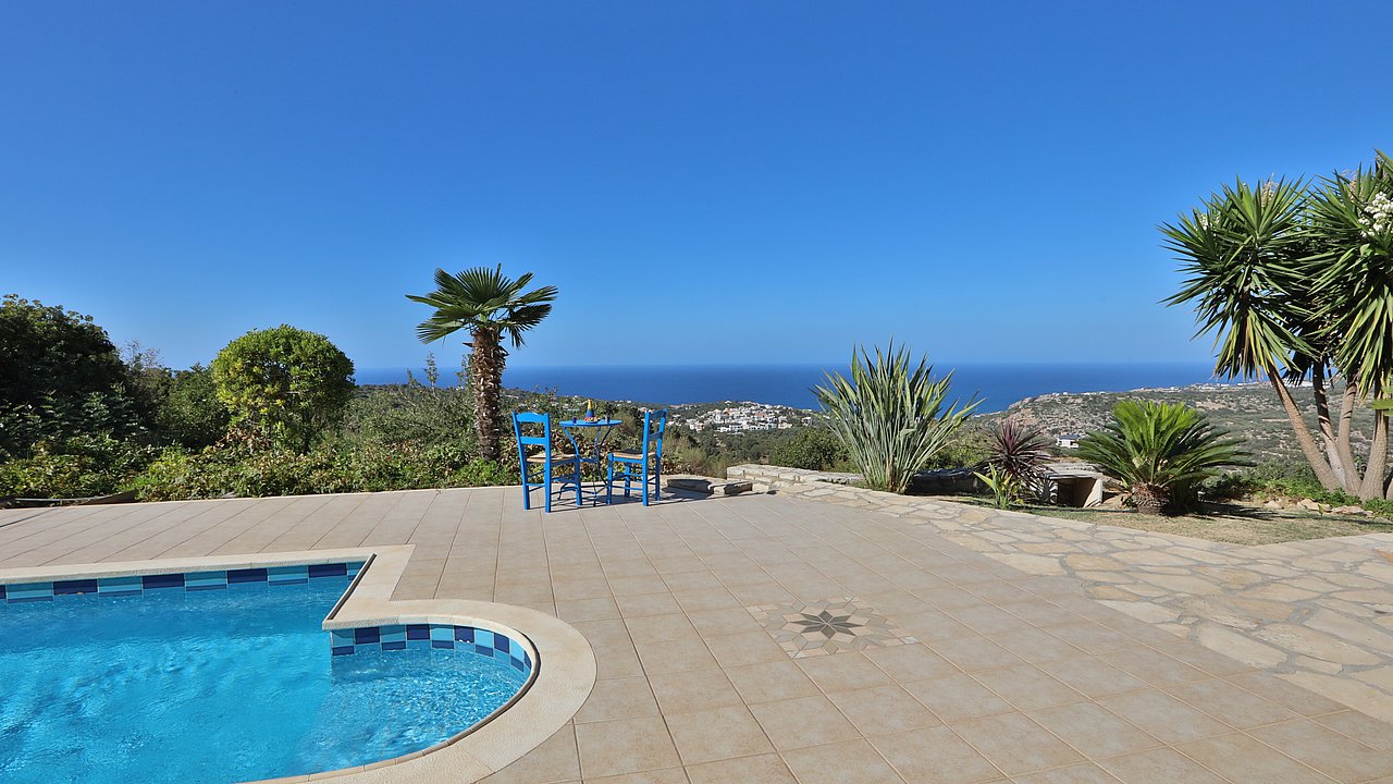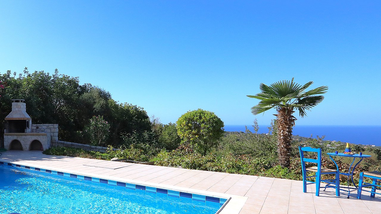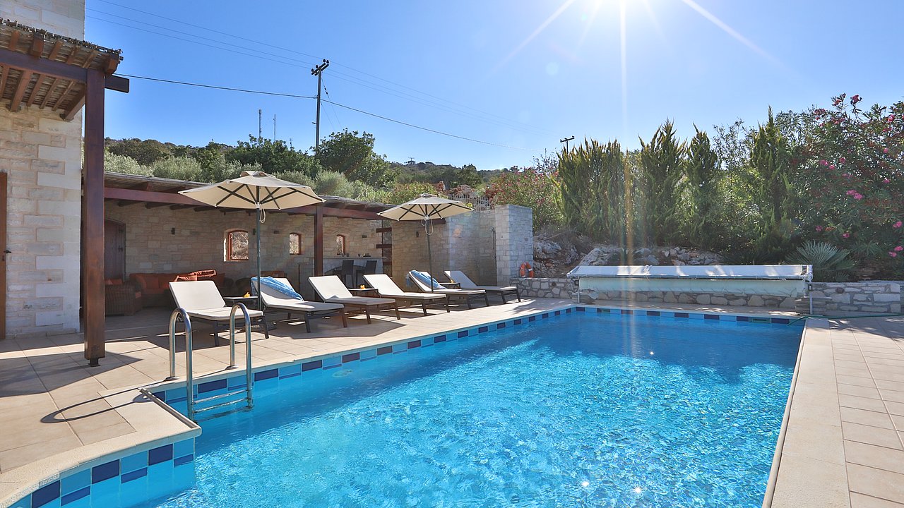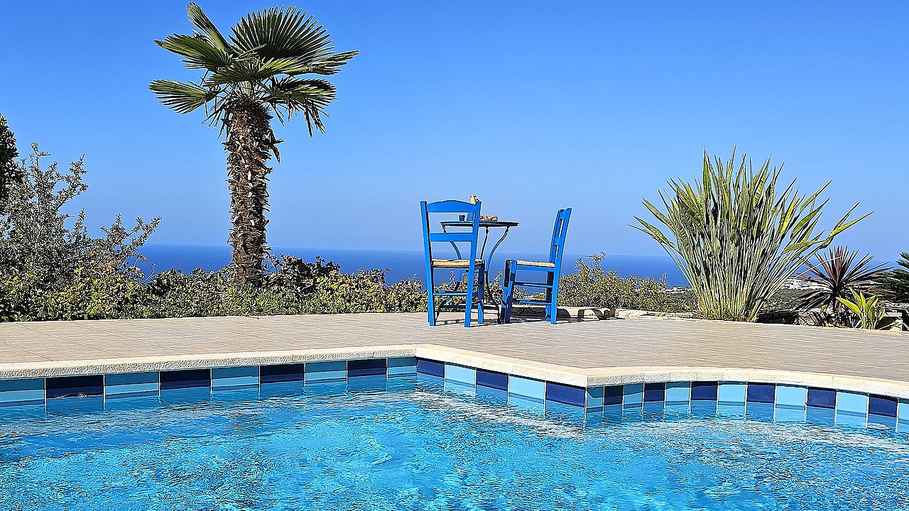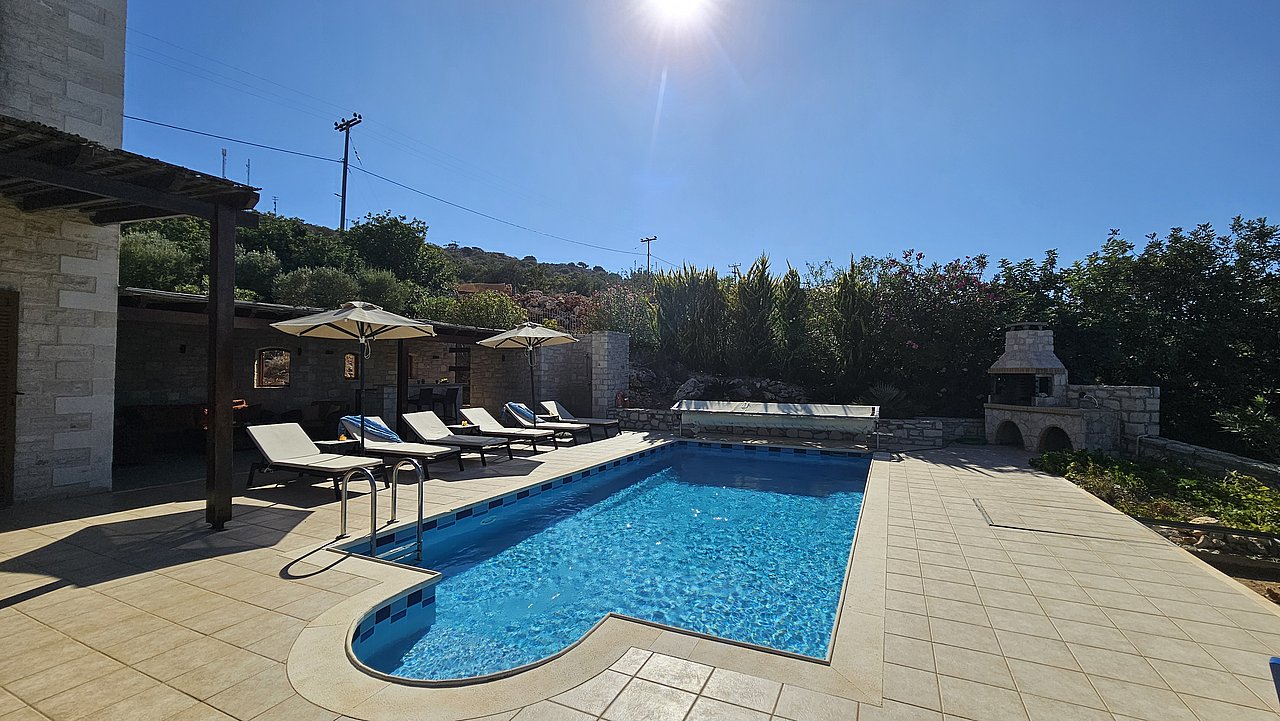 Der Garten ist mit einheimischen Pflanzen und Palmen bepflanzt. Der geflieste Pool misst ca. 8x4 m. Um den beheizbaren Pool (in der kälteren Jahreszeit, wenn das Wetter es zuläßt) ist eine große geflieste Liegeterrasse. Es stehen Ihnen bequeme Liegen und Sonnenschirme zur Verfügung. Im Poolbereich befindet sich auch eine Aussendusche. Geniesen Sie hier bei einem Glas Wein die traumhaften Sonnenuntergänge Kretas! Wenige Meter vor dem Schlafzimmer befindet sich der Pool. Auch von hier haben Sie einen ausgezeichneten Blick auf das Meer und nach Gerani.
