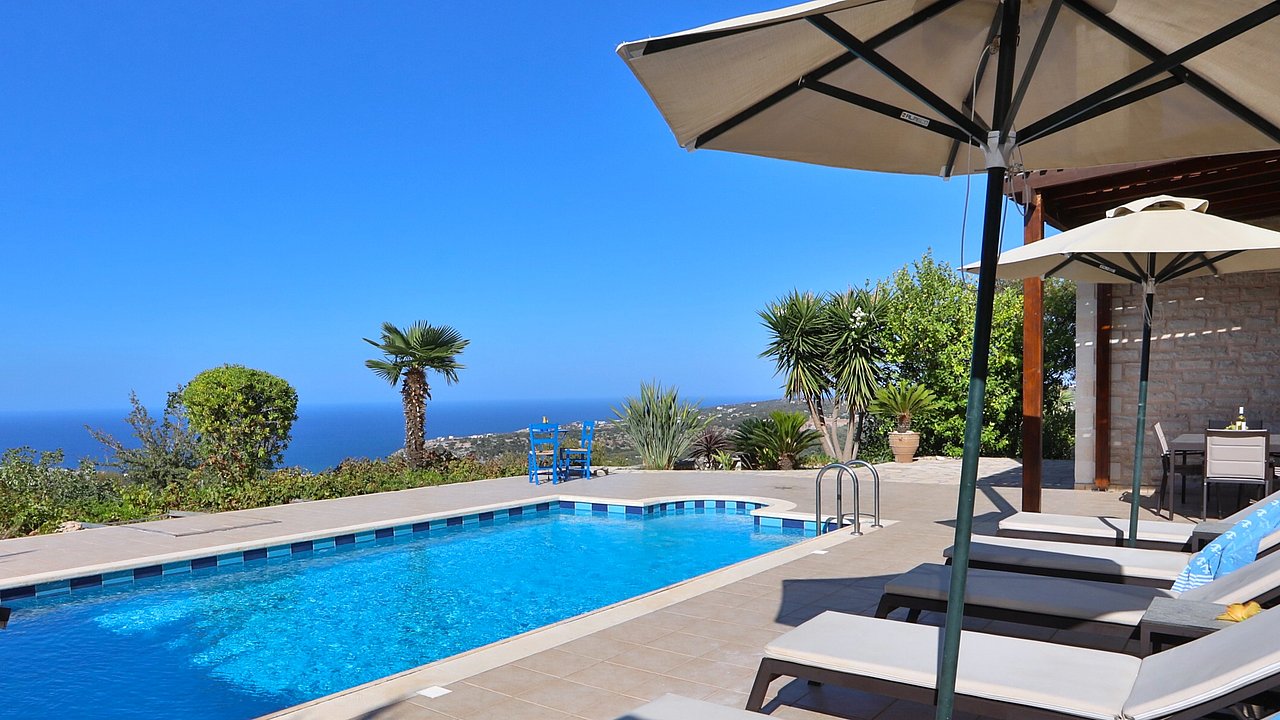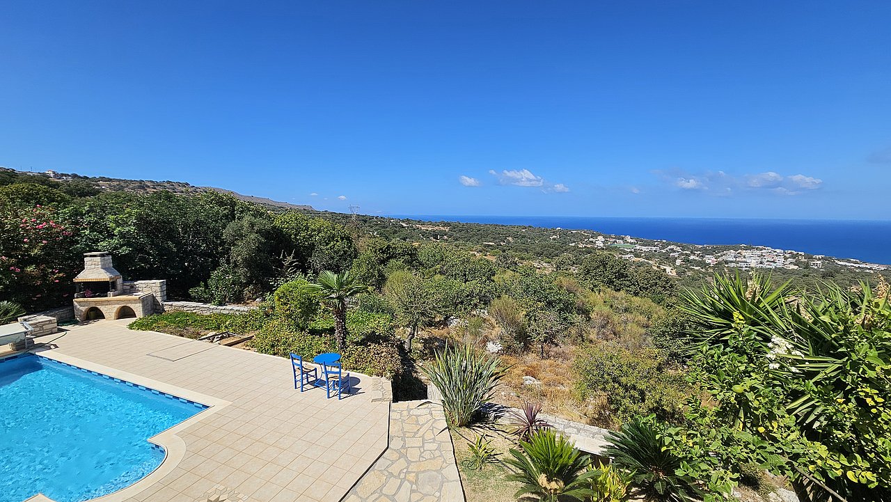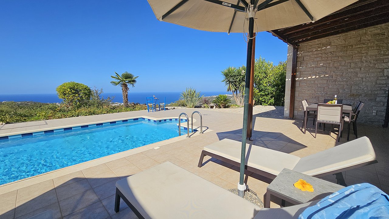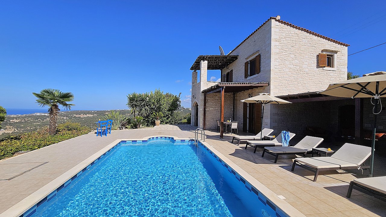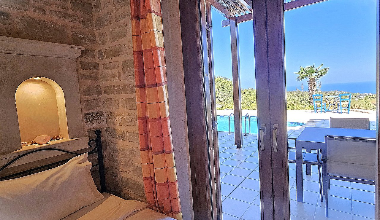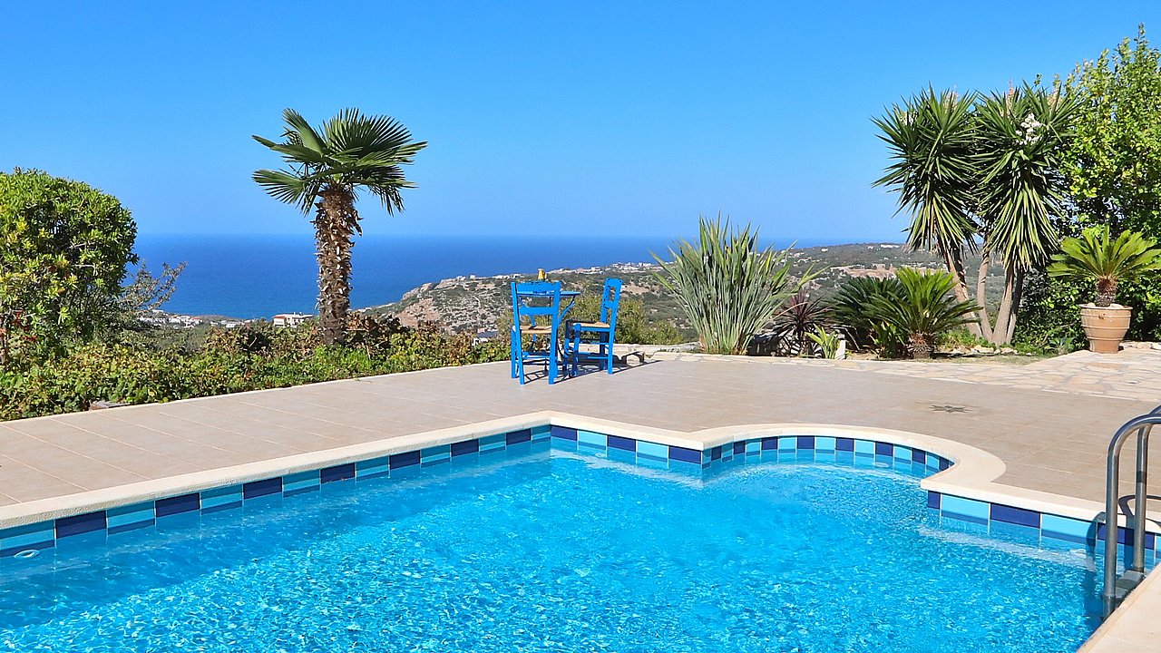 Der Garten ist mit einheimischen Pflanzen und Palmen bepflanzt. Der geflieste Pool misst ca. 8x4 m. Um den beheizbaren Pool (in der kälteren Jahreszeit, wenn das Wetter es zuläßt) ist eine große geflieste Liegeterrasse. Es stehen Ihnen bequeme Liegen und Sonnenschirme zur Verfügung. Im Poolbereich befindet sich auch eine Aussendusche. Geniesen Sie hier bei einem Glas Wein die traumhaften Sonnenuntergänge Kretas! Wenige Meter vor dem Schlafzimmer befindet sich der Pool. Auch von hier haben Sie einen ausgezeichneten Blick auf das Meer und nach Gerani.