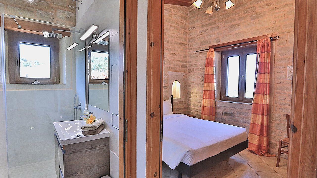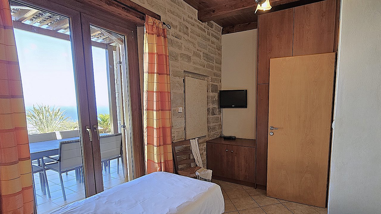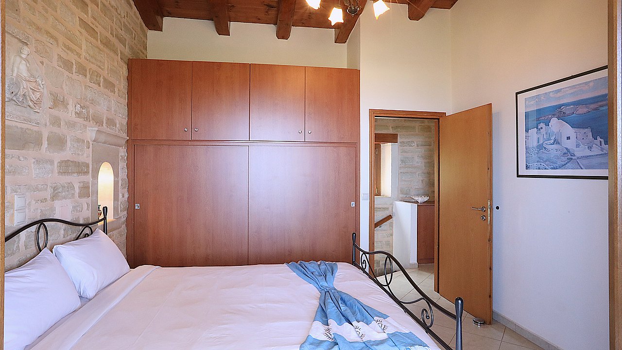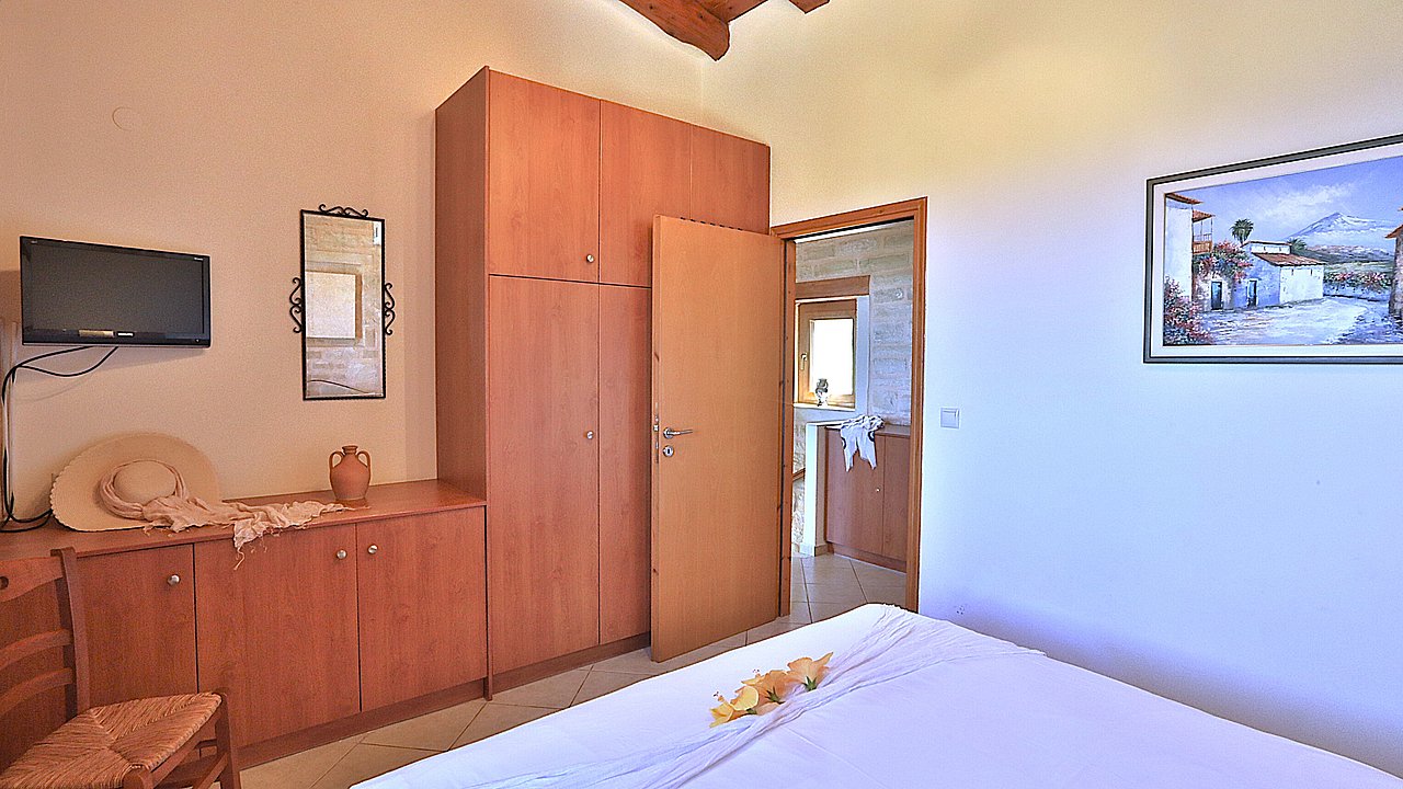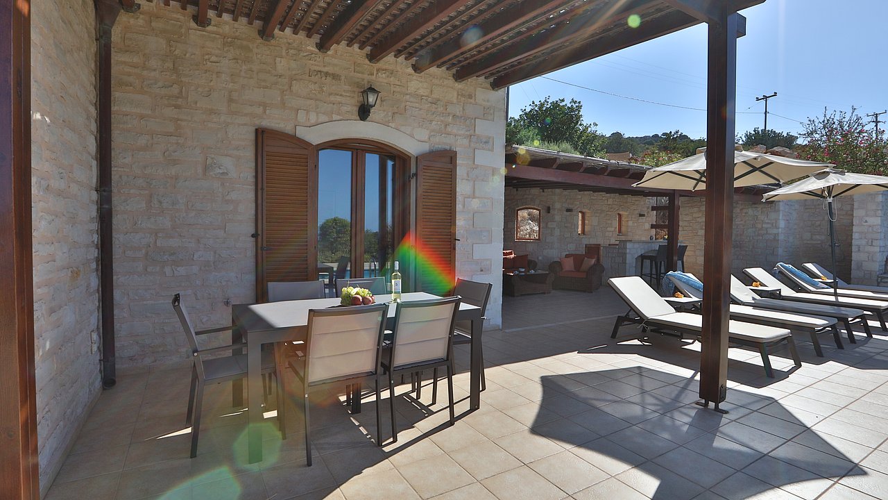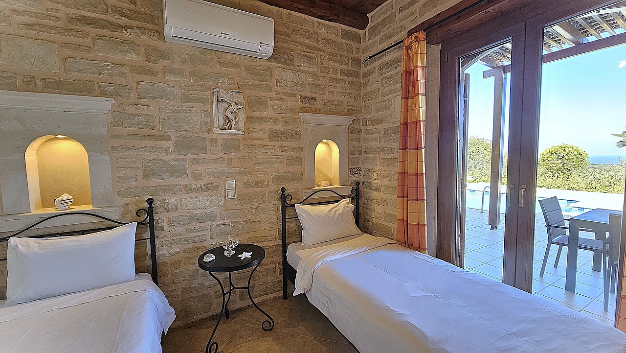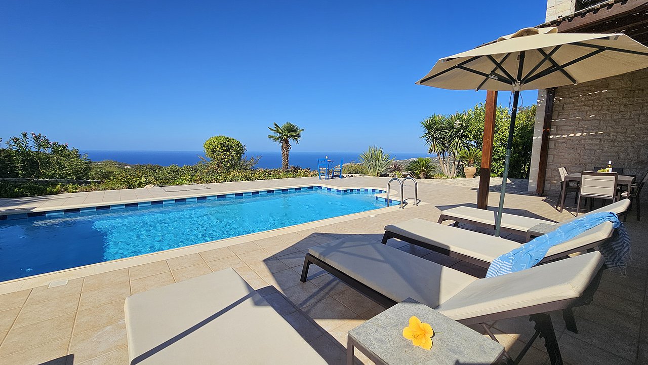 Der Garten ist mit einheimischen Pflanzen und Palmen bepflanzt. Der geflieste Pool misst ca. 8x4 m. Um den beheizbaren Pool (in der kälteren Jahreszeit, wenn das Wetter es zuläßt) ist eine große geflieste Liegeterrasse. Es stehen Ihnen bequeme Liegen und Sonnenschirme zur Verfügung. Im Poolbereich befindet sich auch eine Aussendusche. Geniesen Sie hier bei einem Glas Wein die traumhaften Sonnenuntergänge Kretas! Wenige Meter vor dem Schlafzimmer befindet sich der Pool. Auch von hier haben Sie einen ausgezeichneten Blick auf das Meer und nach Gerani.