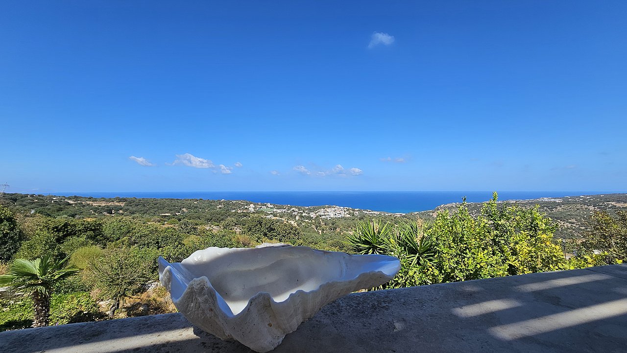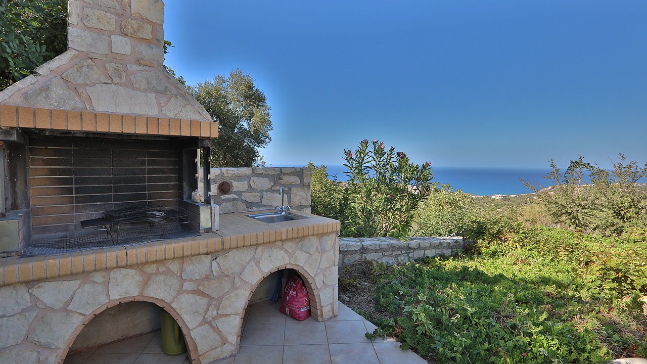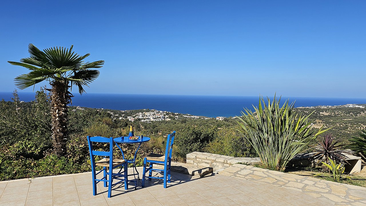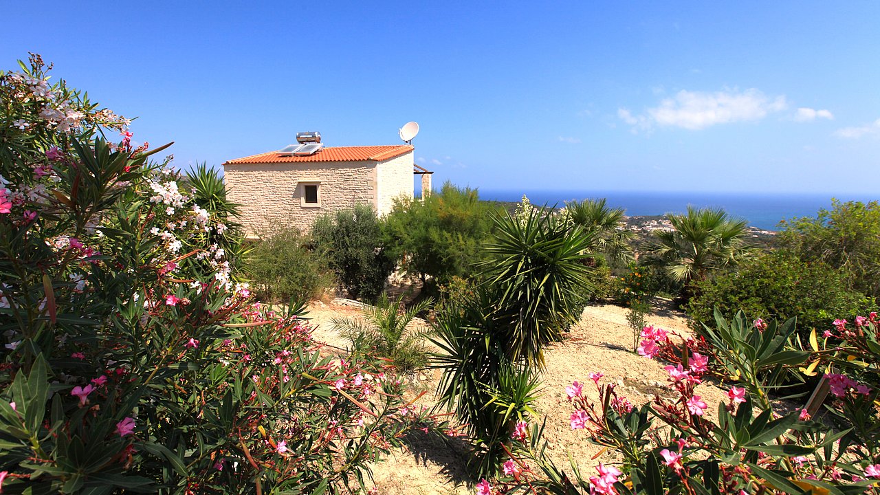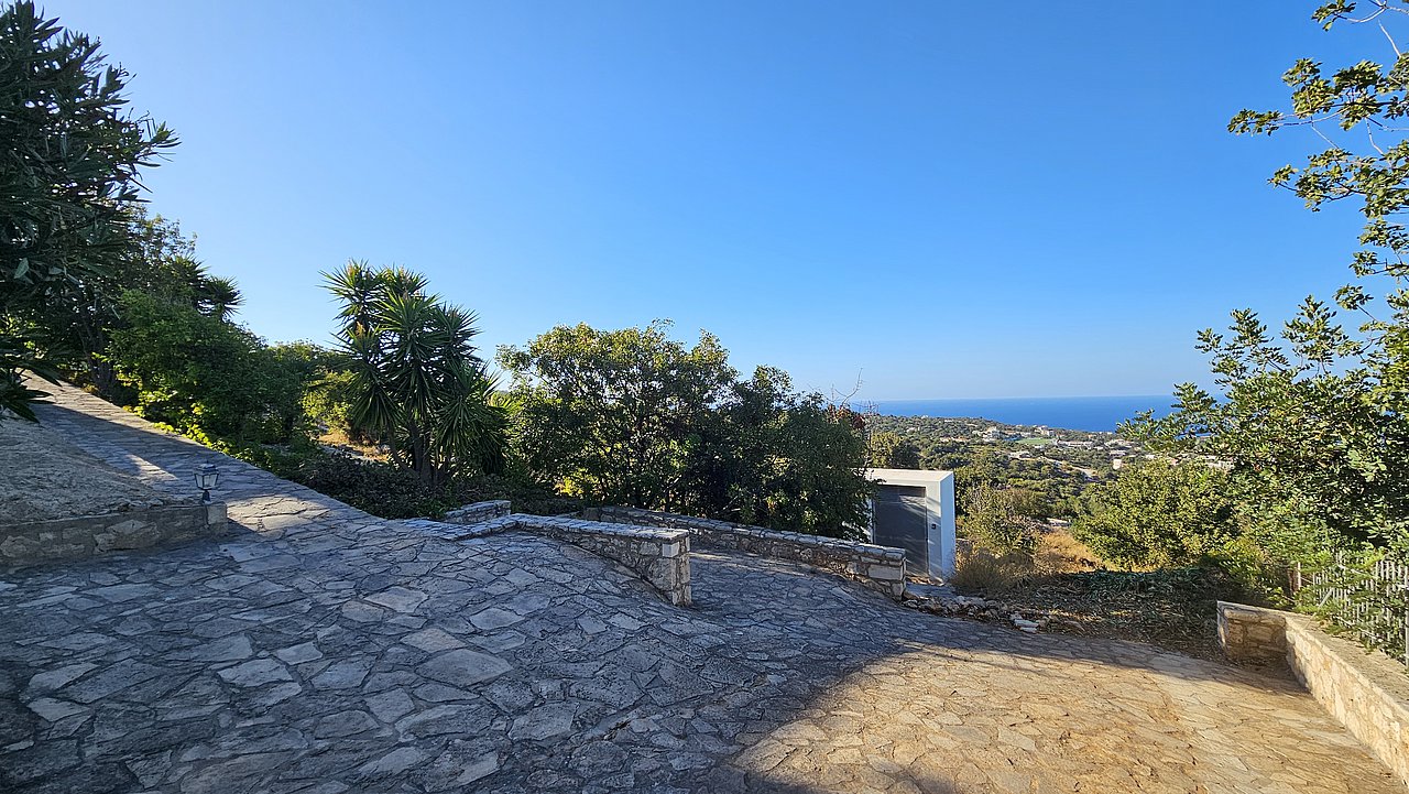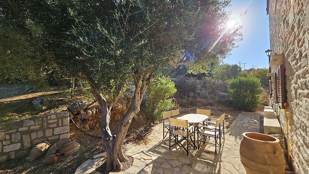 Ein Teil des Grundstückes ist naturbelassen. Über eine Steintreppe erreichen Sie den unteren Teil des Grundstückes. Hier gibt es viele einheimische Kräuter. Sie haben einen herrlichen Blick über das Meer bis zur Halbinsel Akrotiri.