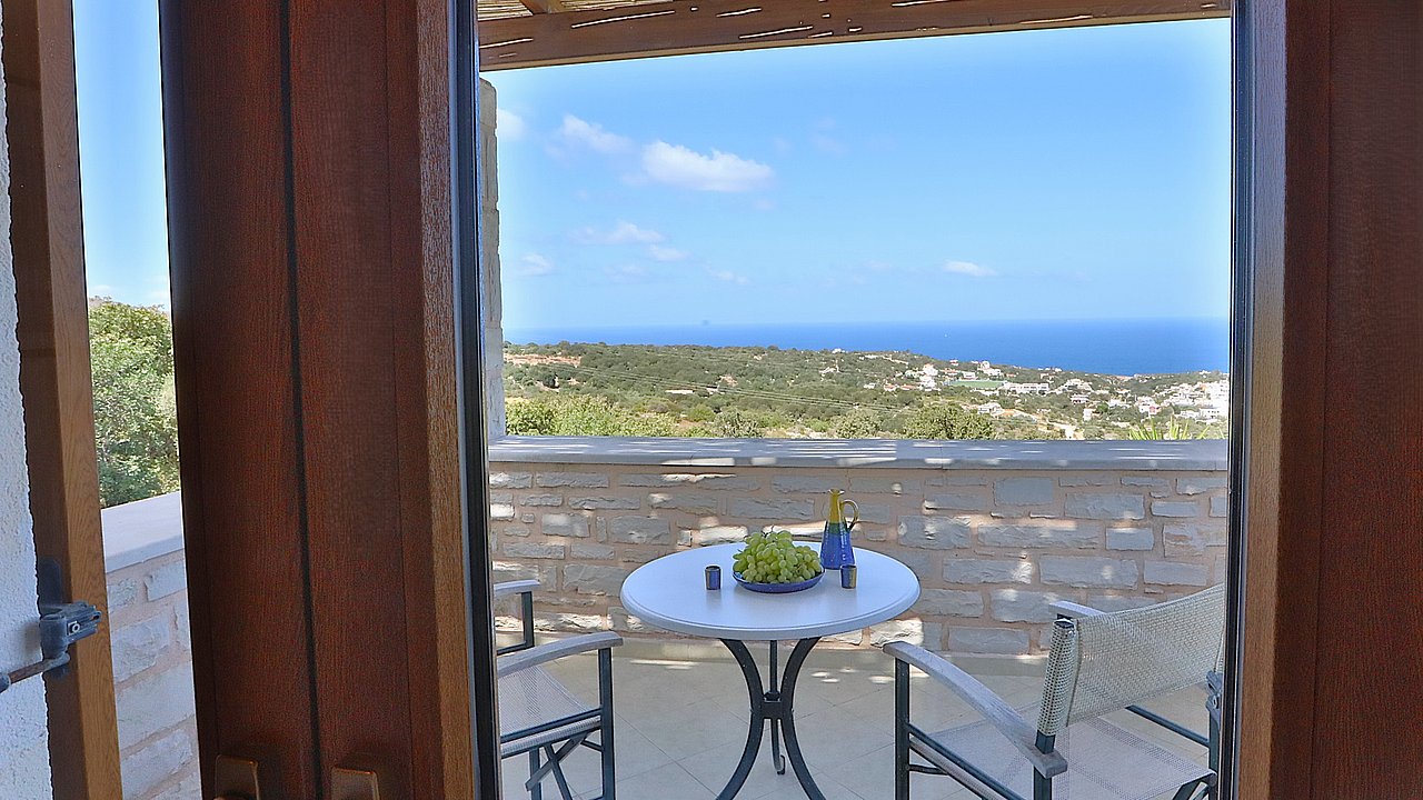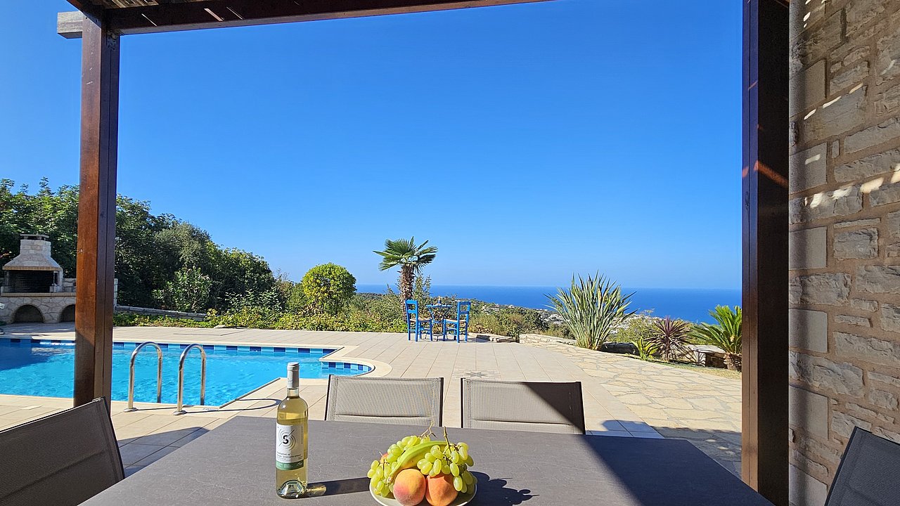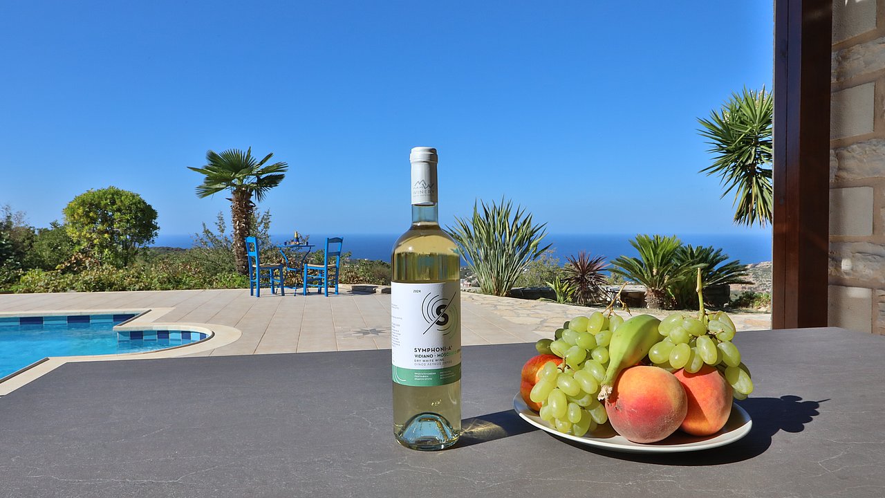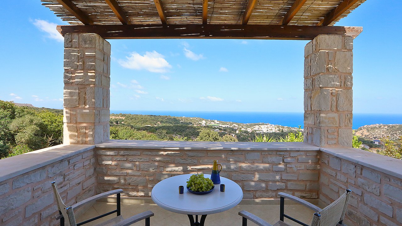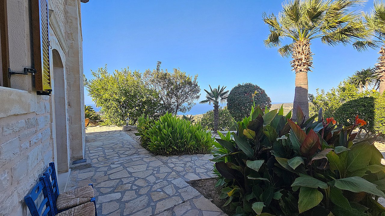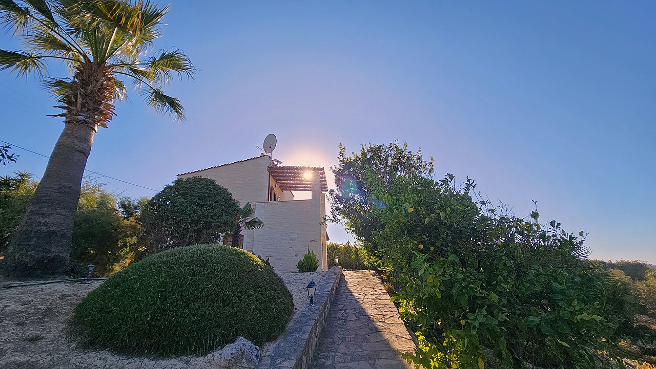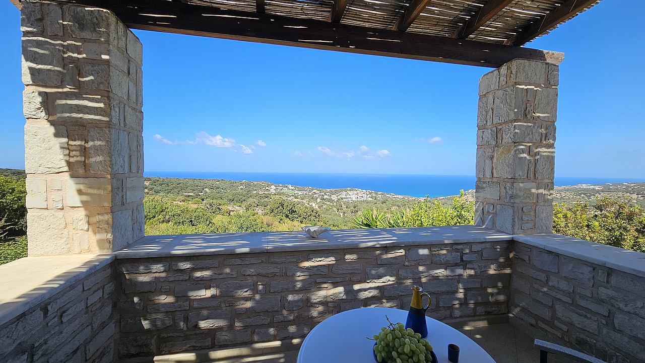 Ein Teil des Grundstückes ist naturbelassen. Über eine Steintreppe erreichen Sie den unteren Teil des Grundstückes. Hier gibt es viele einheimische Kräuter. Sie haben einen herrlichen Blick über das Meer bis zur Halbinsel Akrotiri.