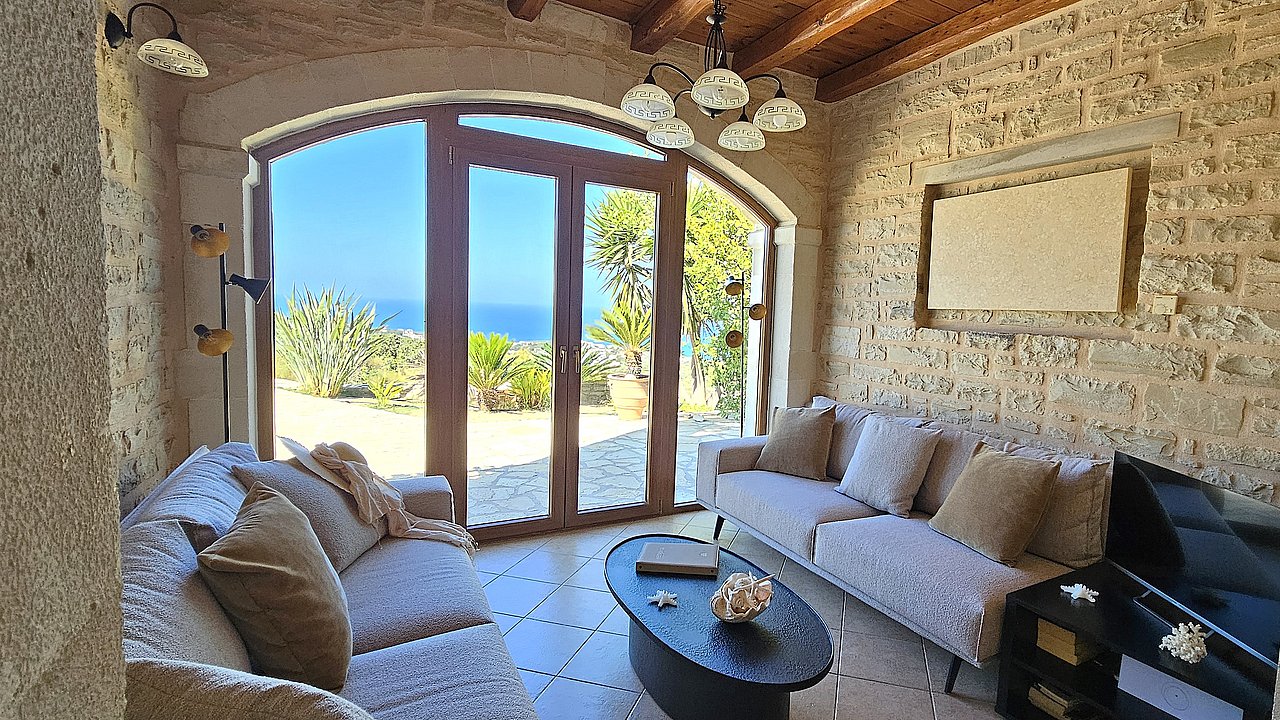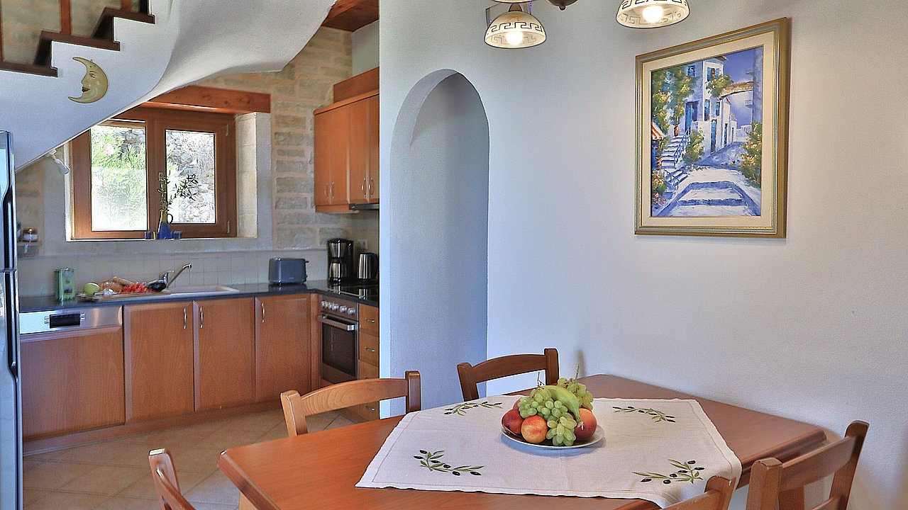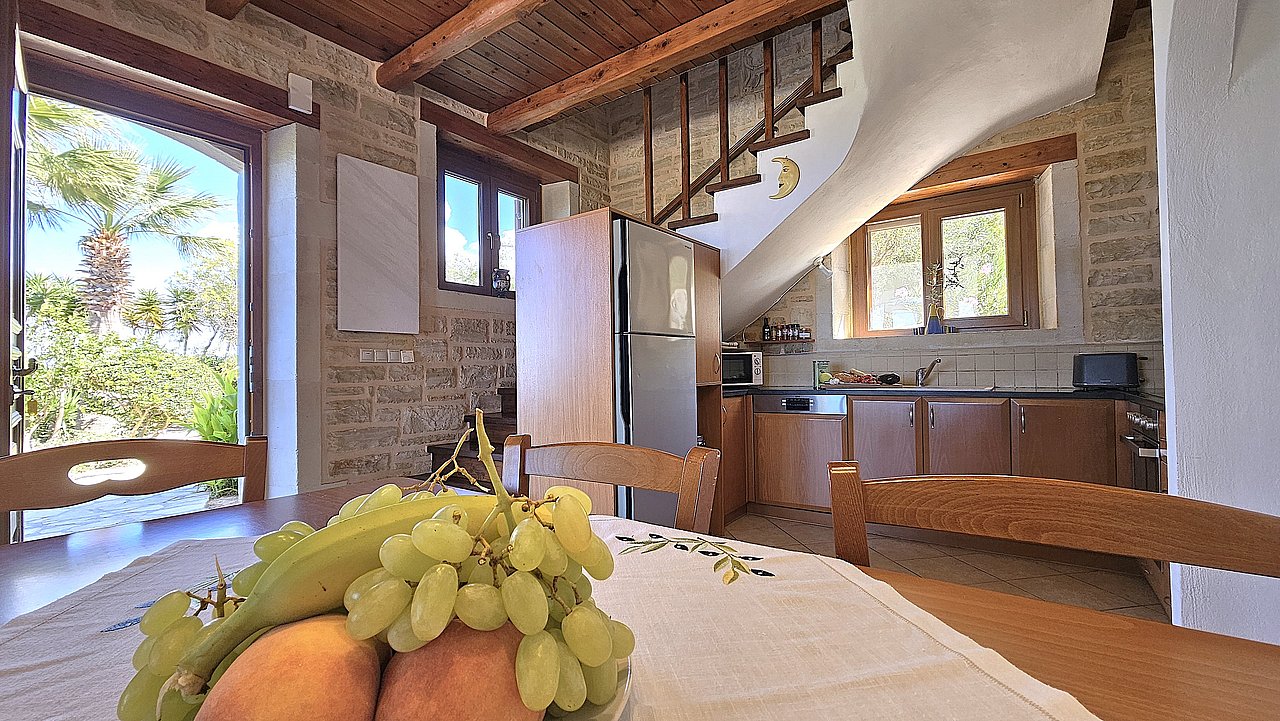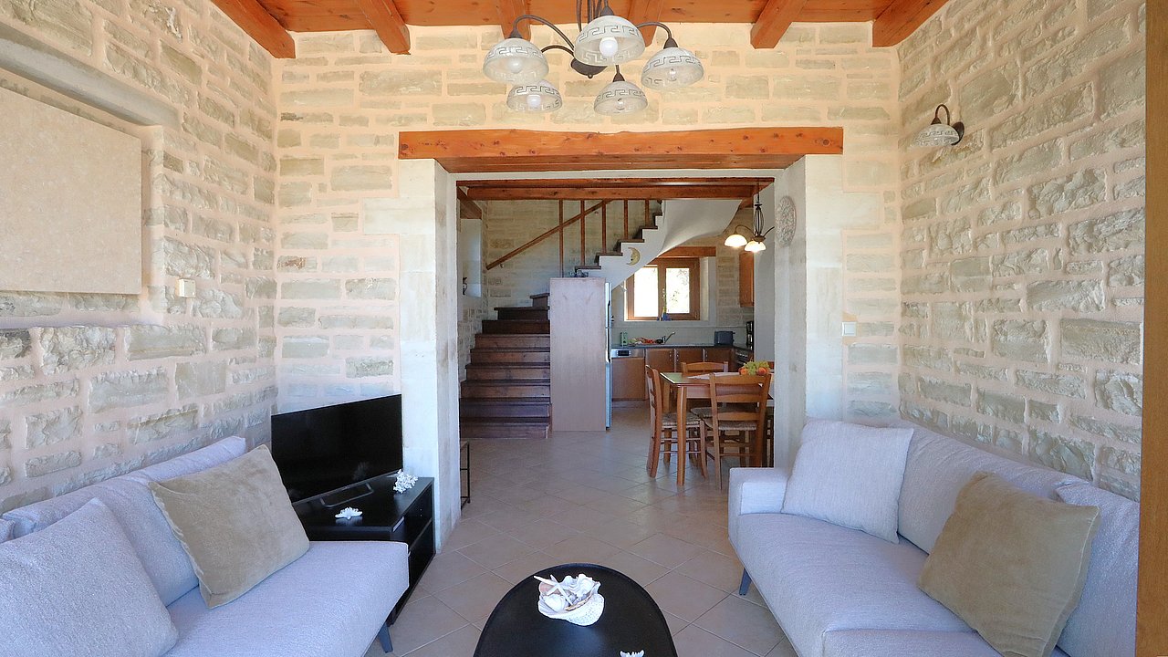 Die Villa ist mit viel Liebe zum Detail eingerichtet und garantiert für einen hohen Wohnkomfort. Alle Räume sind mit Holz-Balkendecken ausgestattet und in den Wänden sind teilweise Steinbilder und Steinnieschen integriert. Sie hat eine komplett ausgestattete Küche. Sie verfügt über drei Schlafzimmer und zwei Bäder