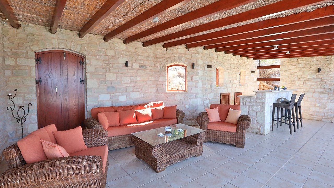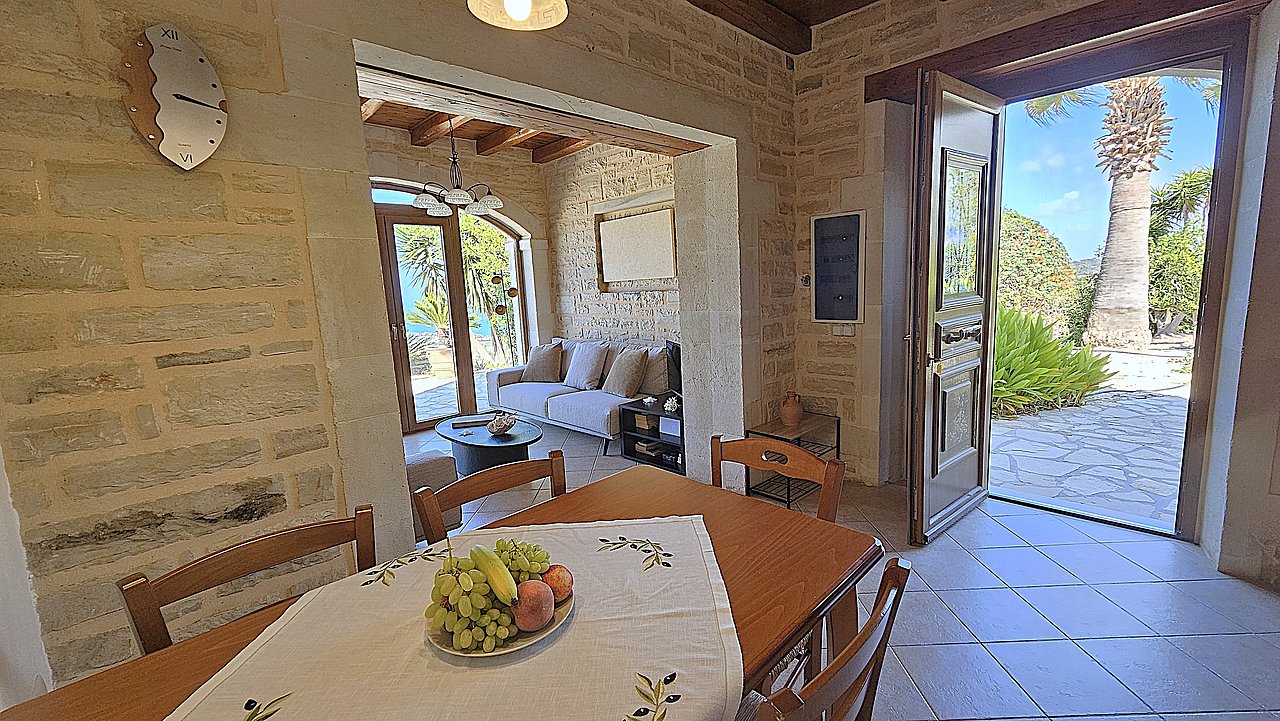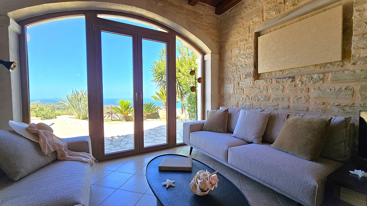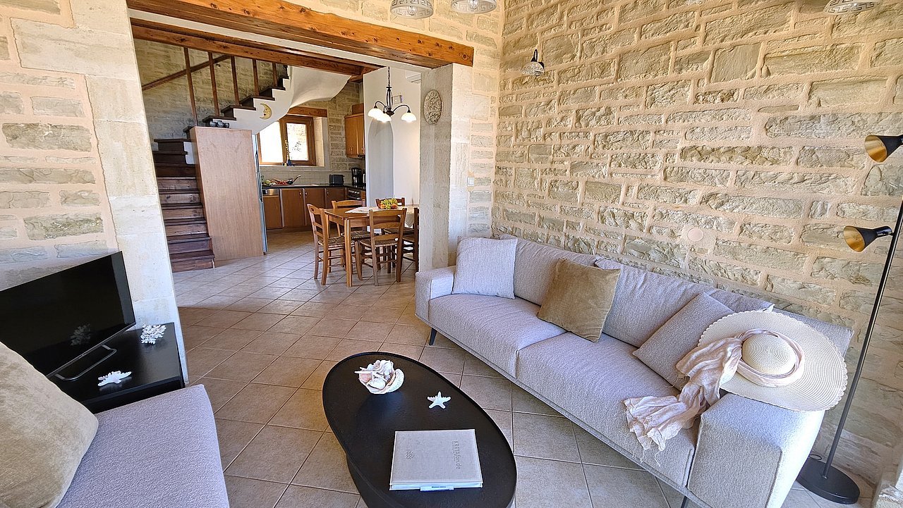 Die Villa ist mit viel Liebe zum Detail eingerichtet und garantiert für einen hohen Wohnkomfort. Alle Räume sind mit Holz-Balkendecken ausgestattet und in den Wänden sind teilweise Steinbilder und Steinnieschen integriert. Sie hat eine komplett ausgestattete Küche. Sie verfügt über drei Schlafzimmer und zwei Bäder