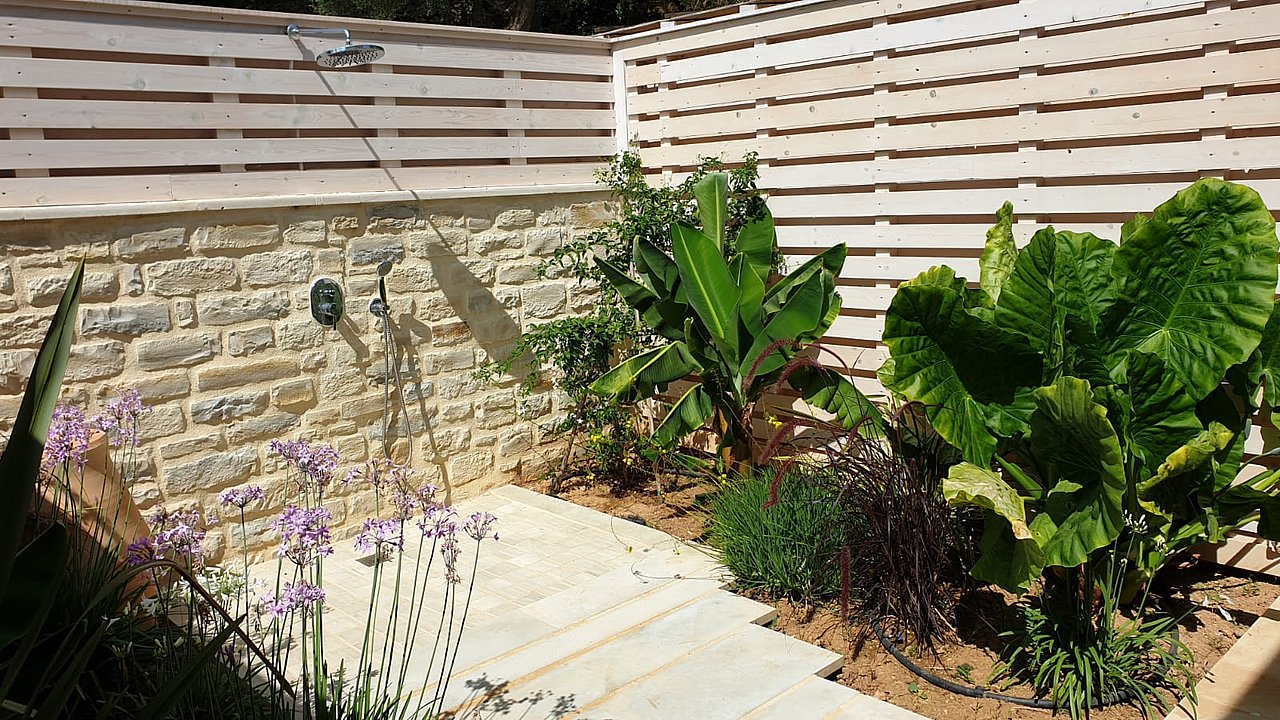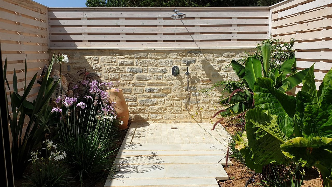 Eine zusätzliche Außendusche sorgt für noch mehr Abkühlung direkt am Pool.