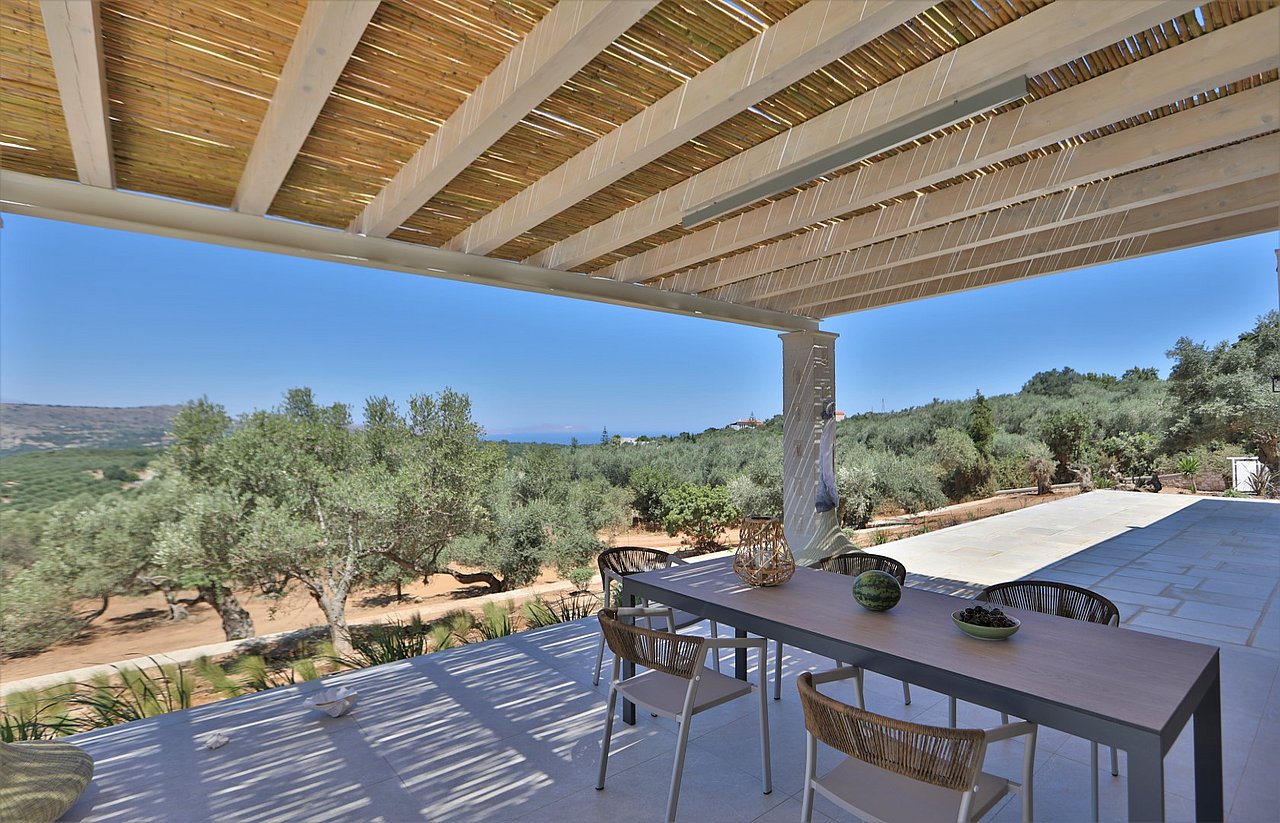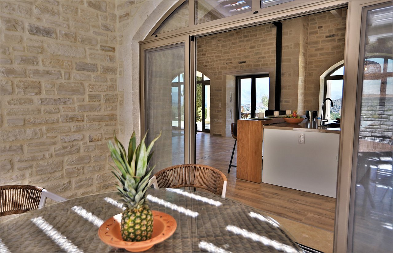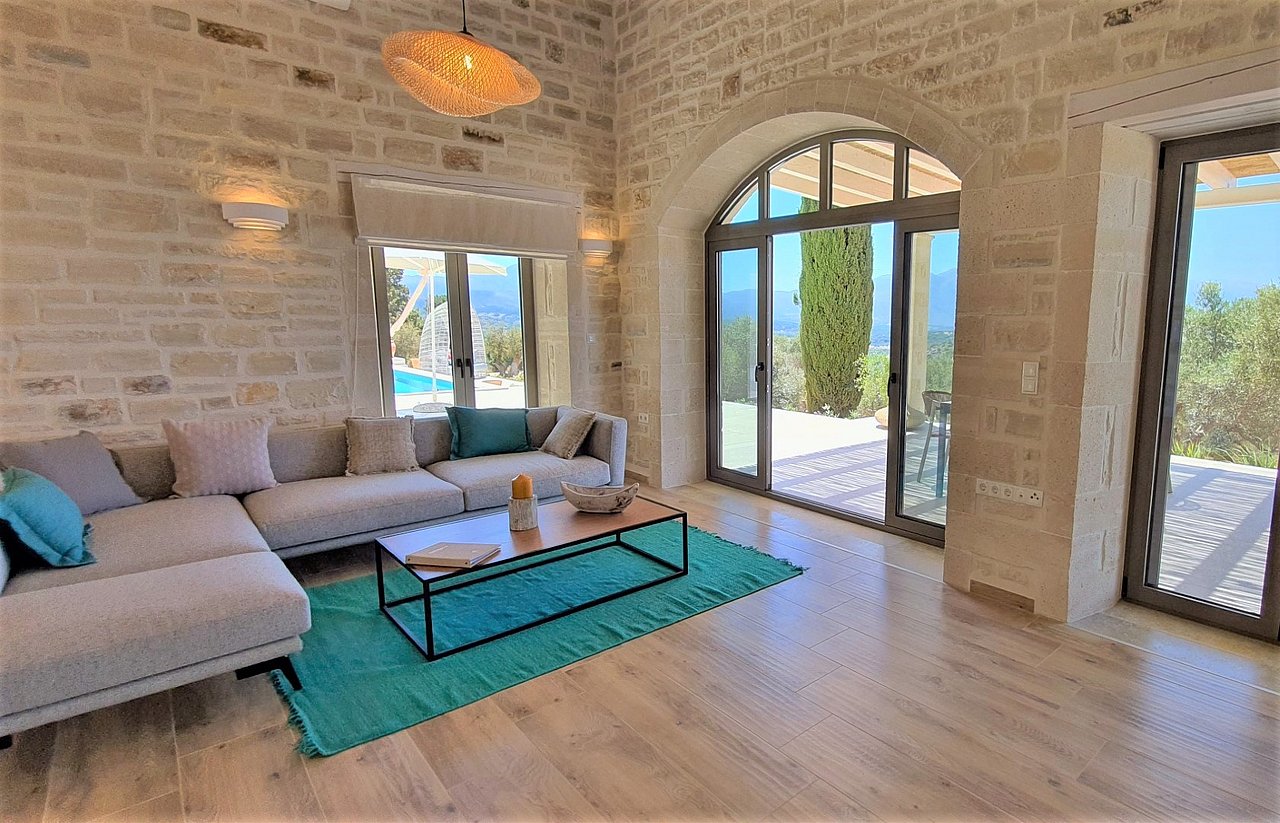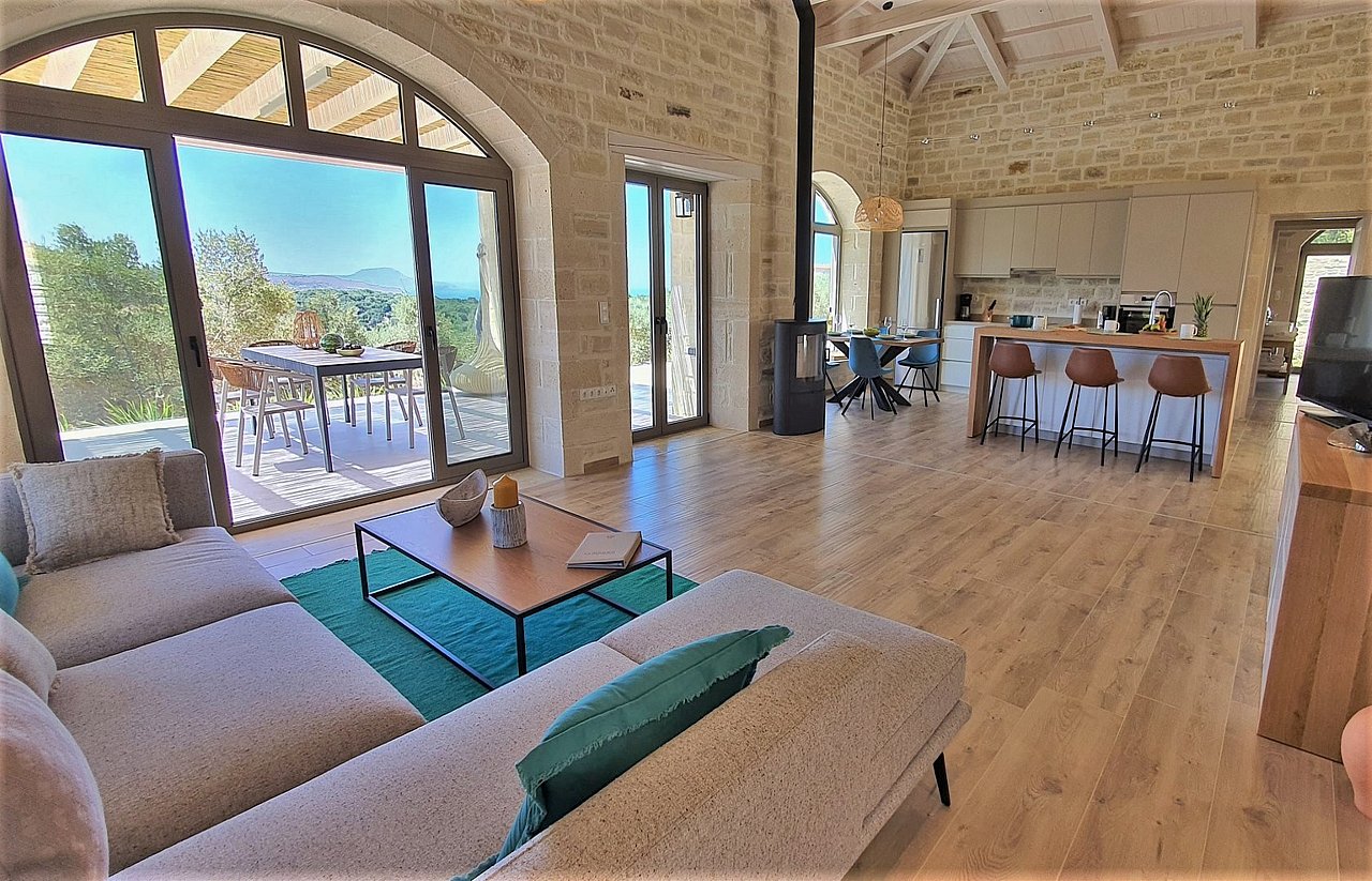 Direkt angrenzend öffnet sich der lichtdurchflutete Wohn-und Essbereich zur stilvollen Terasse, von der Sie Ihre Mahlzeiten genießen- oder die Seele baumeln lassen können- mit herrlichem Blick über das weite Olivenland bis hin zum Meer und den weißen Bergen.