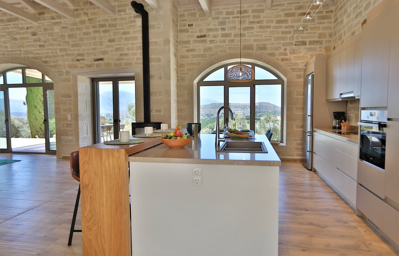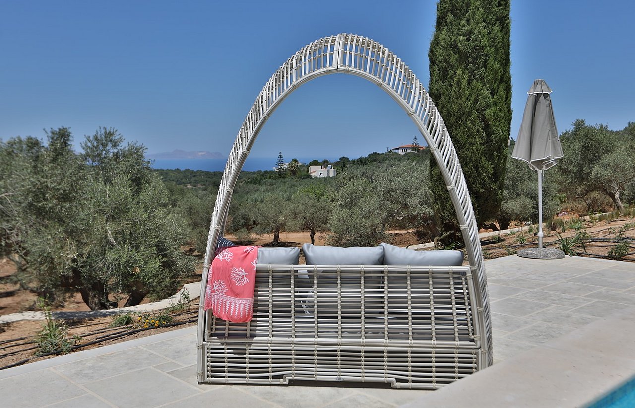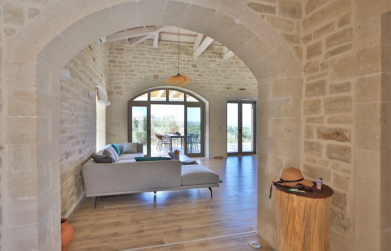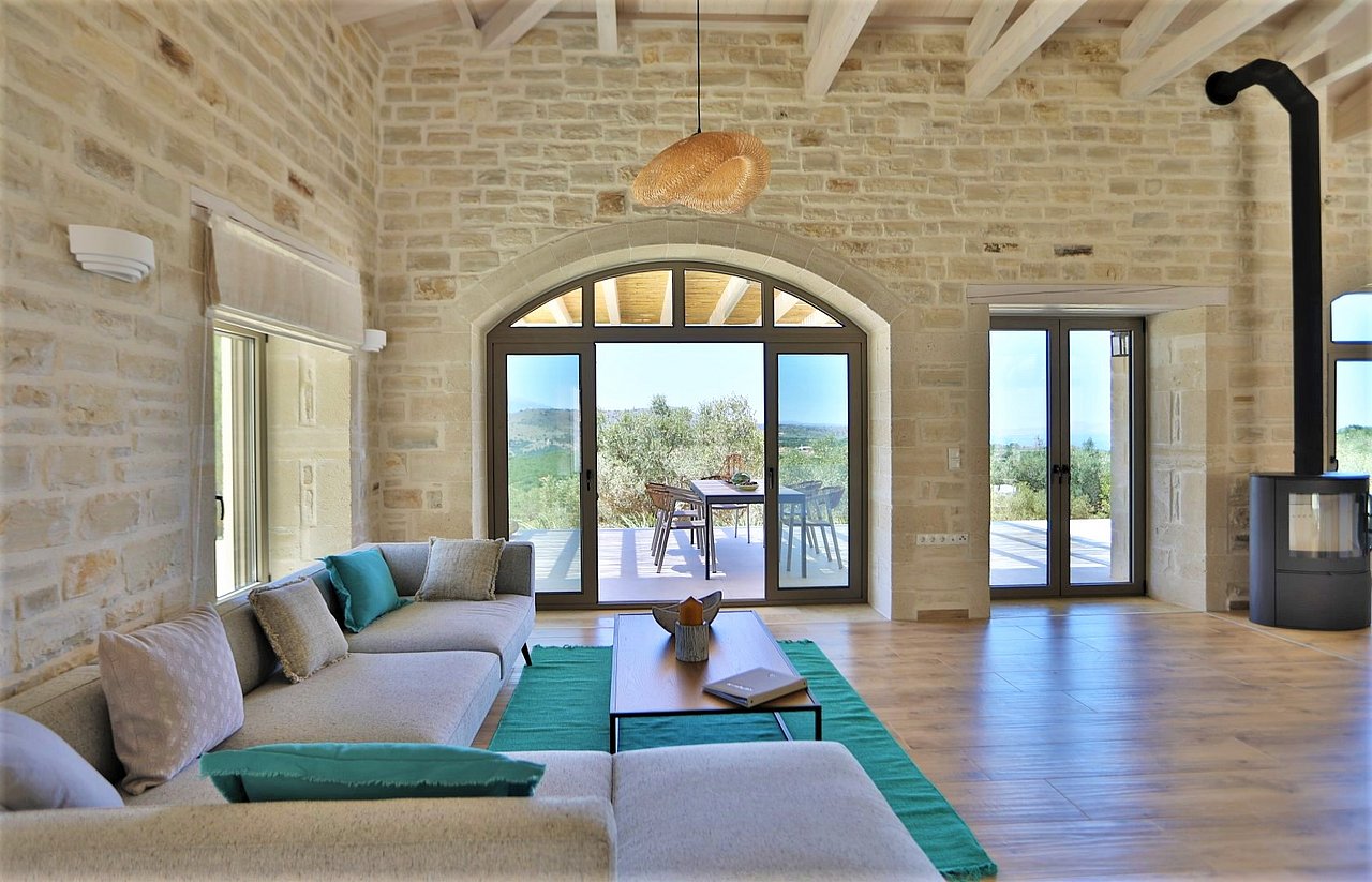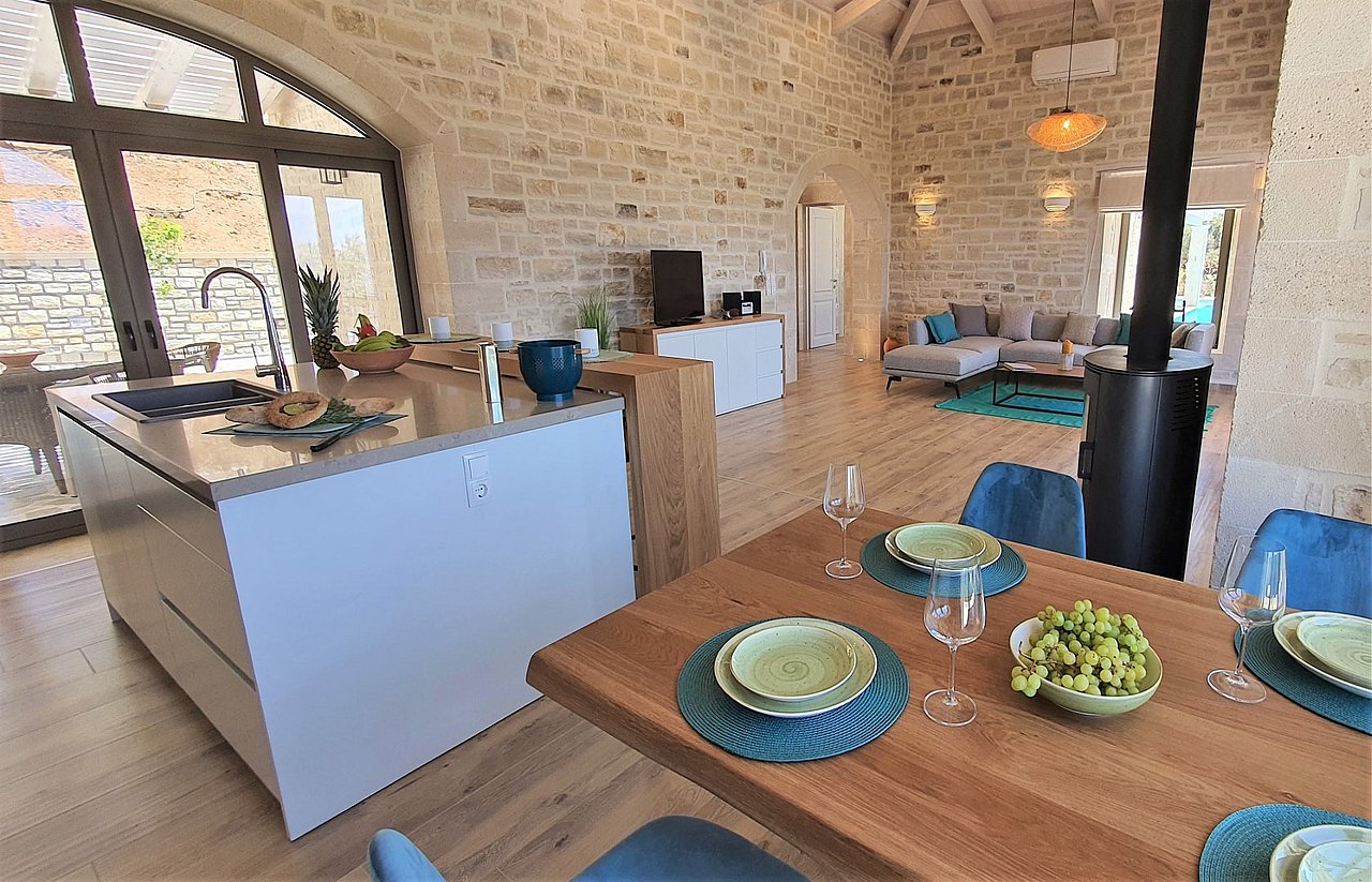 Direkt angrenzend öffnet sich der lichtdurchflutete Wohn-und Essbereich zur stilvollen Terasse, von der Sie Ihre Mahlzeiten genießen- oder die Seele baumeln lassen können- mit herrlichem Blick über das weite Olivenland bis hin zum Meer und den weißen Bergen.