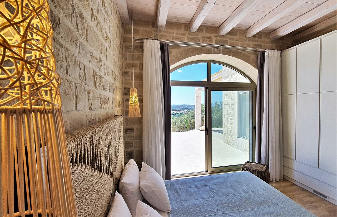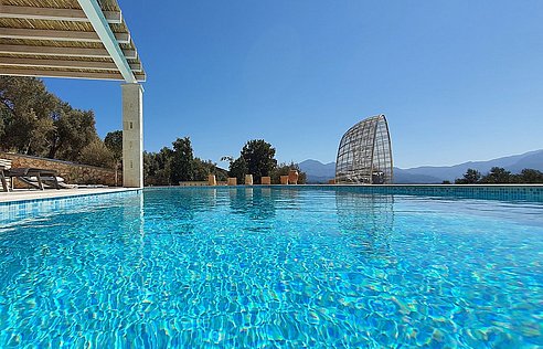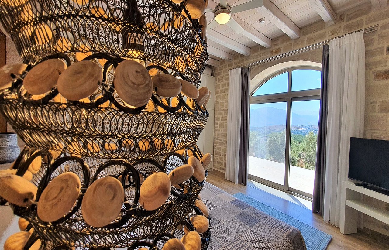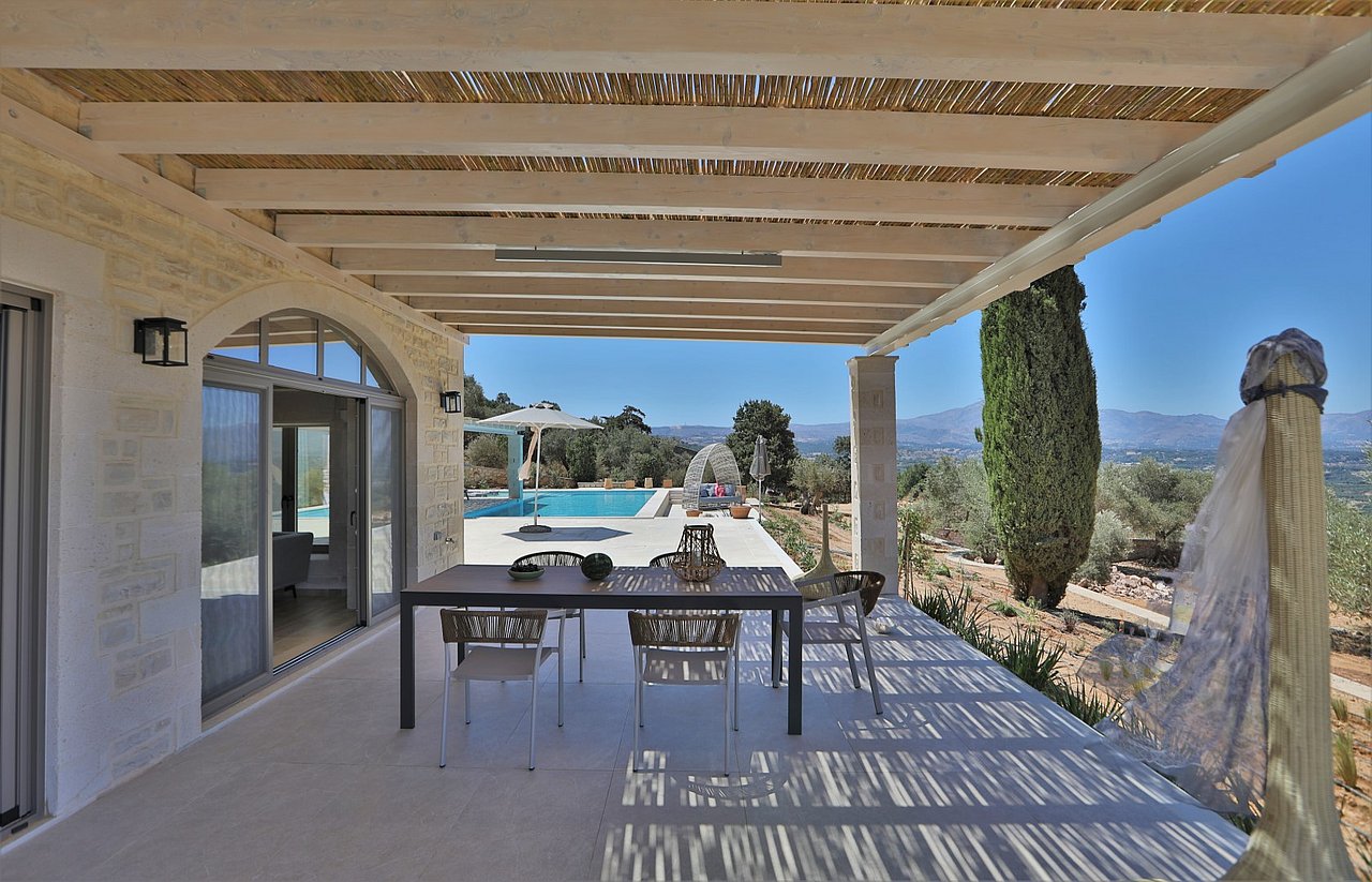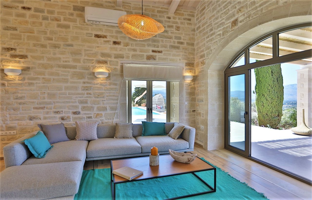 Direkt angrenzend öffnet sich der lichtdurchflutete Wohn-und Essbereich zur stilvollen Terasse, von der Sie Ihre Mahlzeiten genießen- oder die Seele baumeln lassen können- mit herrlichem Blick über das weite Olivenland bis hin zum Meer und den weißen Bergen.