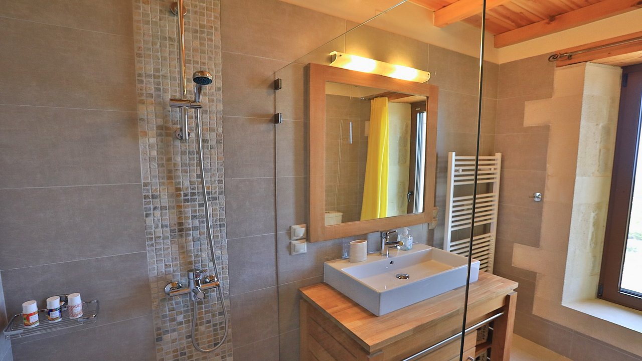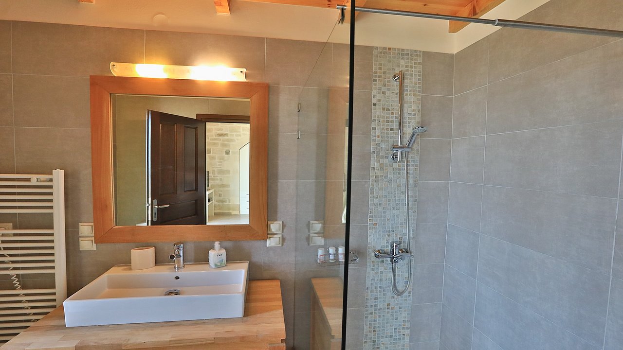 Im ersten Stock befinden sich zwei Schlafzimmer mit zwei Tageslichtbädern (En-suite). Das erste Schlafzimmer ist mit einem Doppelbett, das zweite mit zwei Einzelbetten, die man auf Wunsch zusammenstellen kann, ausgestattet. Die dazugehörigen Tageslichtbäder sind jeweils mit einer großen barrierefreien Dusche ausgestattet. Beide Schlafzimmer haben einen Balkon, bzw. eine Terrasse. Genießen Sie sogar vom Bett aus den traumhaften Blick auf das blaue Mittelmeer. Vor der Küche ist eine fest überdachte Terrasse mit Sitzmöbeln. Vor dem Wohnzimmer befindet sich die ca. 19 m lange Pergola. Frühstücken Sie auf dieser, mit bequemen Möbeln ausgestatteten Terrasse, bei einem unübertrefflichen Meerblick!