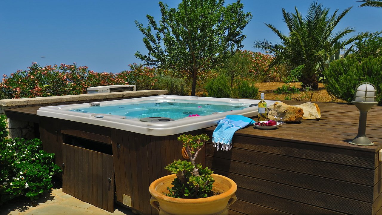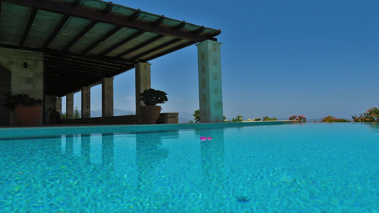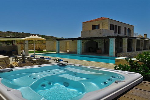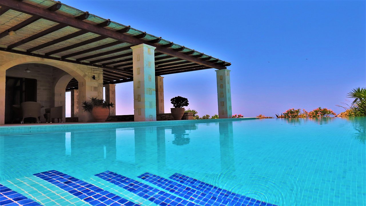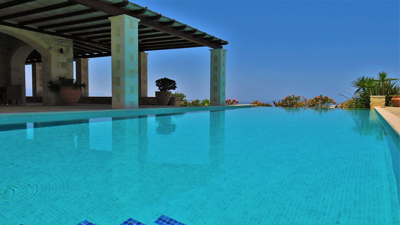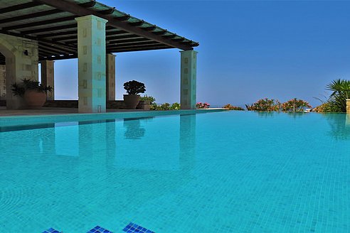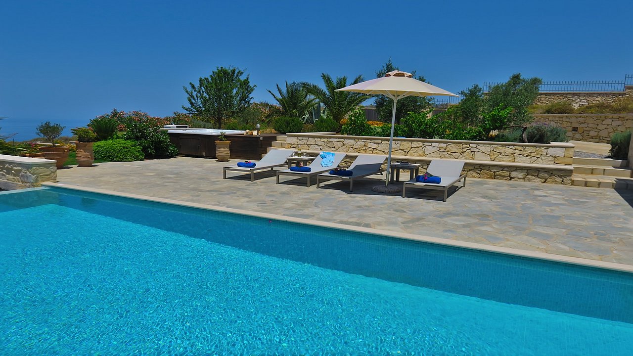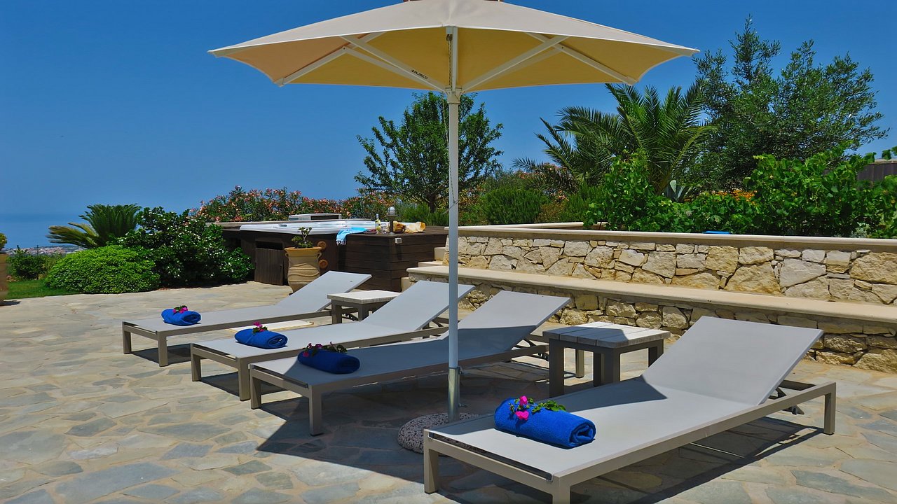 Relaxen Sie auf der großzügigen Terrasse, die den ca. 50 qm großen Infinitypool umgibt. Hier ist auch das beschattete Pooldeck mit bequemen Loungemöbeln und Sonnenliegen! Neben dem Pool befindet sich der exklusive Whirlpool mit atemberaubendem Blick auf das Meer. Am gemauerten Außengrill können Sie Ihre Grillkünste zeigen.