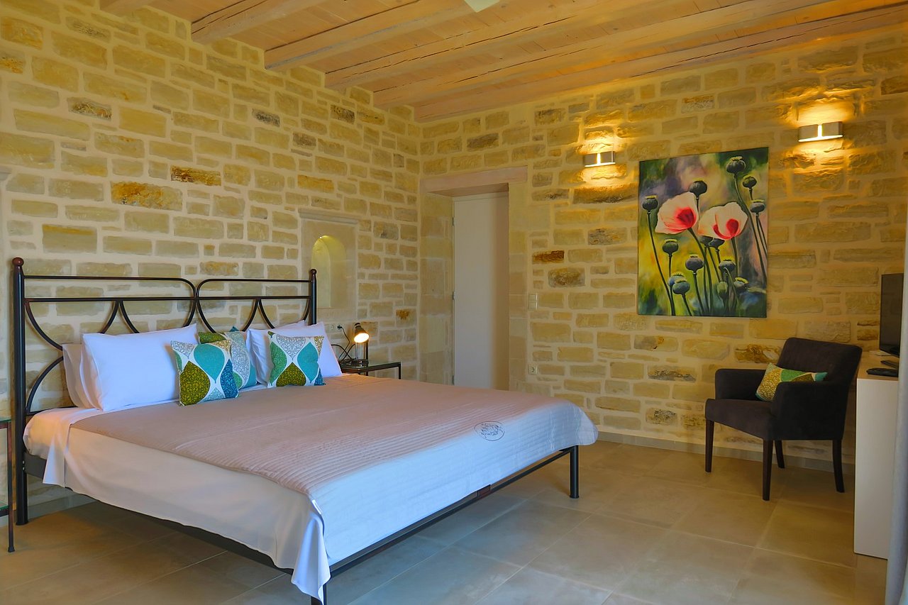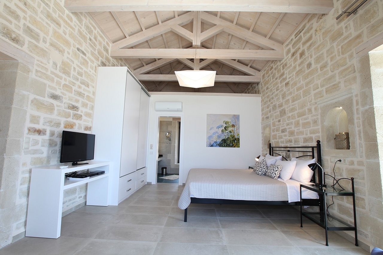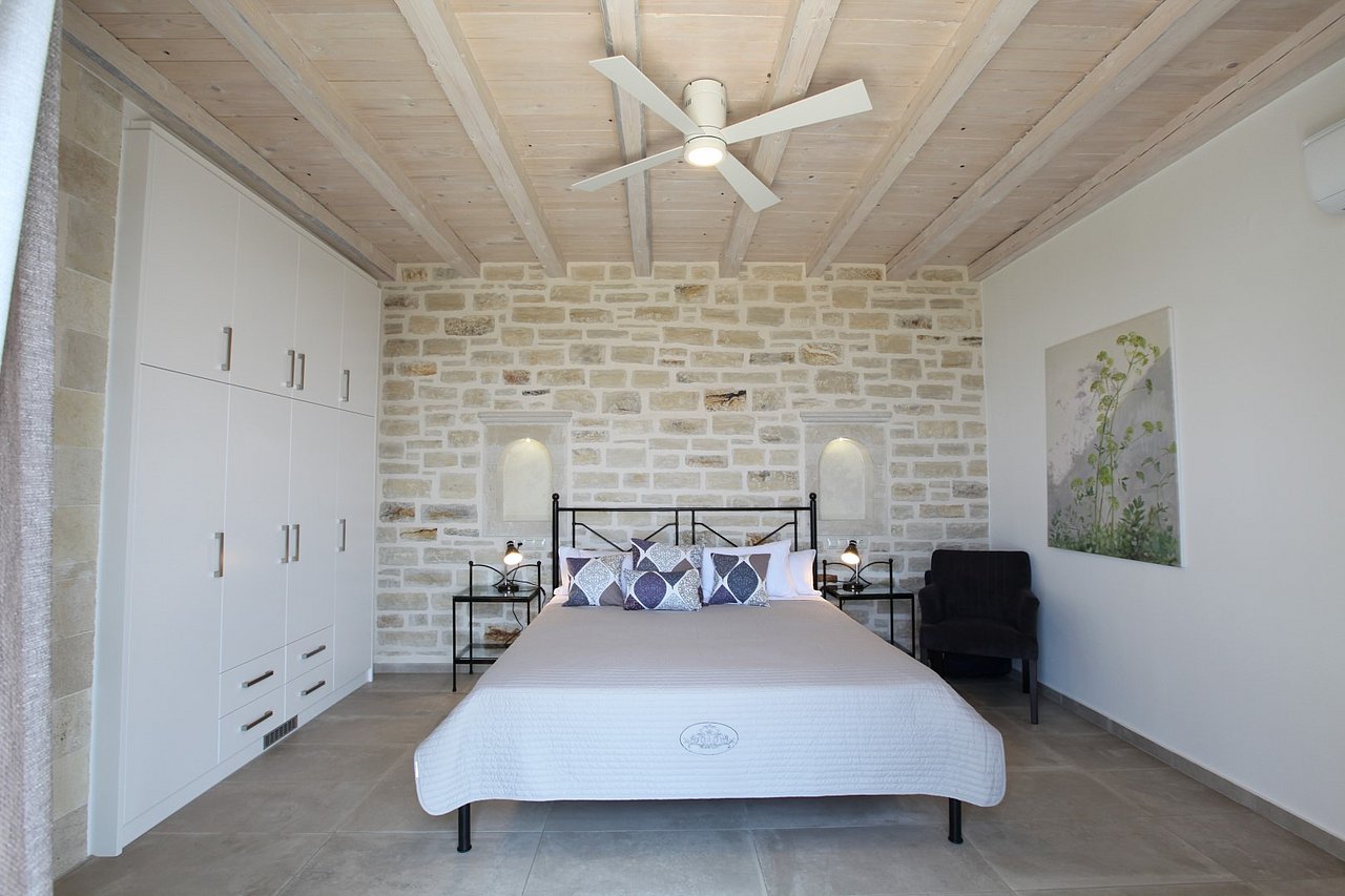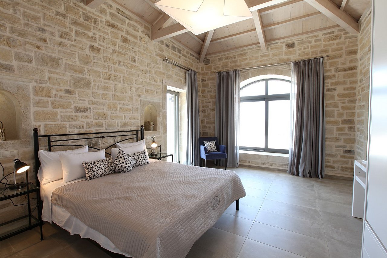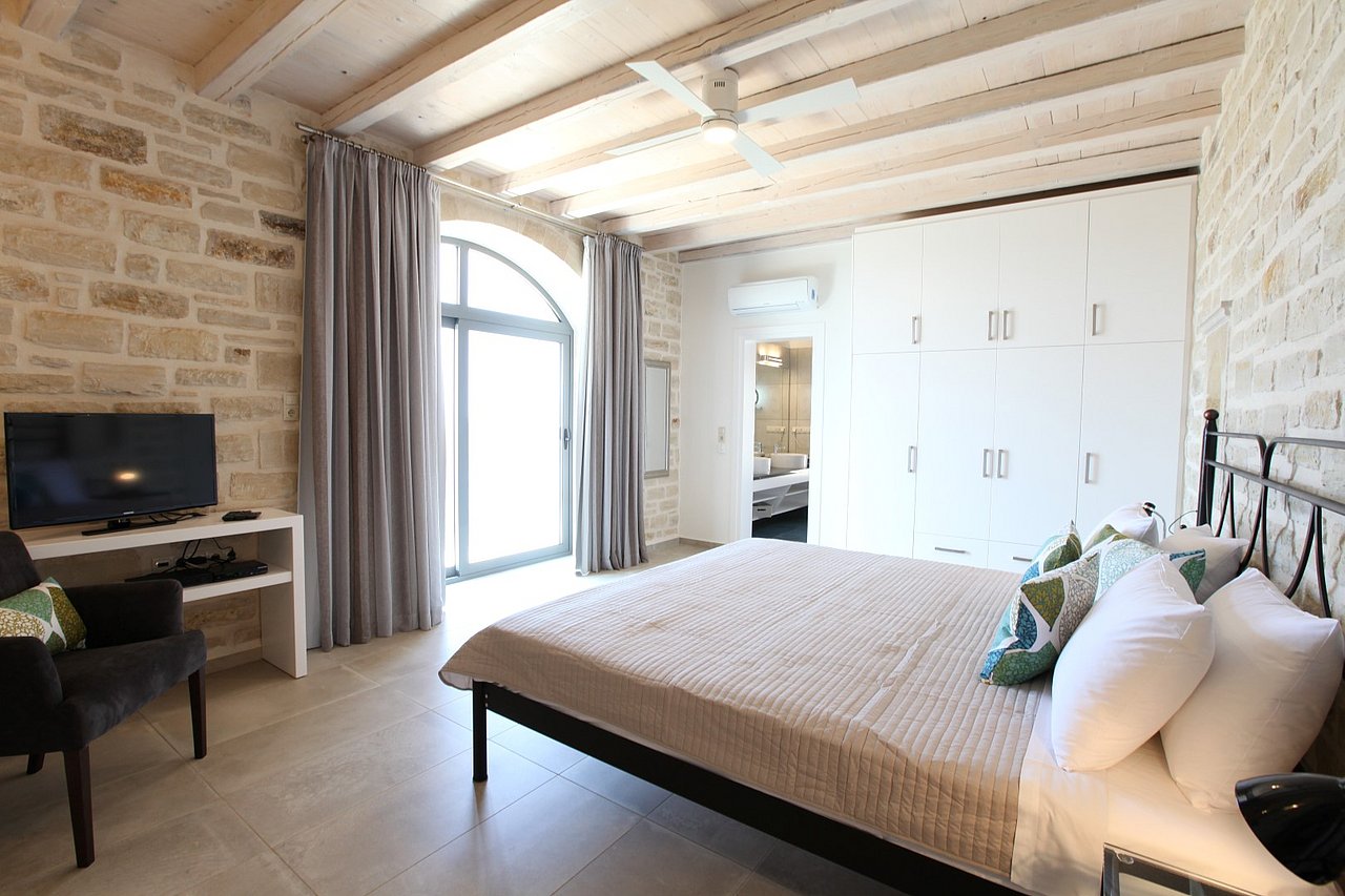 Durch die Lage am Hang befinden sich alle 3 Schlafzimmer auf verschiedenen Ebenen und bieten somit eine höchstmögliche Privatsphäre. Jedes der Schlafzimmer hat durch großzügige Panoramafenster einen grandiosen Ausblick auf das Meer, die Weißen-Berge und die Halbinsel Akrotiri. Die Ausstattung mit hochwertigen Matratzen und handgeschmiedeten, landestypischen Betten garantierten hohen Schlafkomfort. Zwei der Betten besitzen die Größe 180 cm x 200 cm, für Menschen mit etwas mehr Platzbedarf steht in einem der Schlafzimmer ein Bett in Größe 200 cm x 210 cm zur Verfügung.