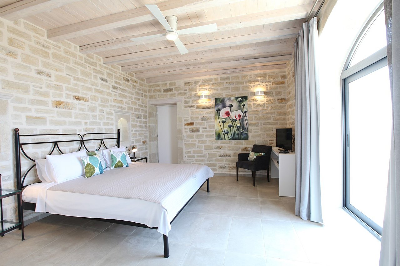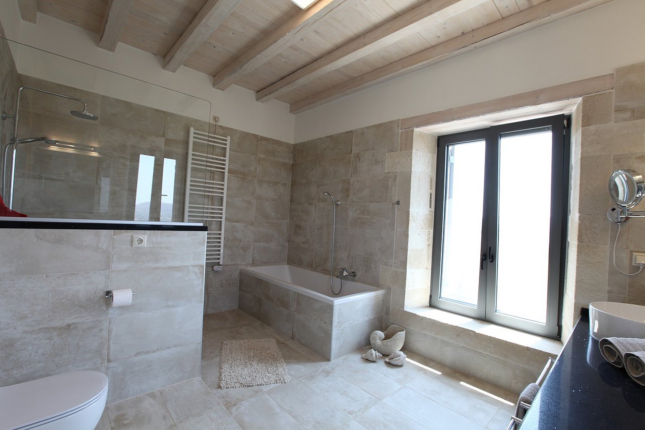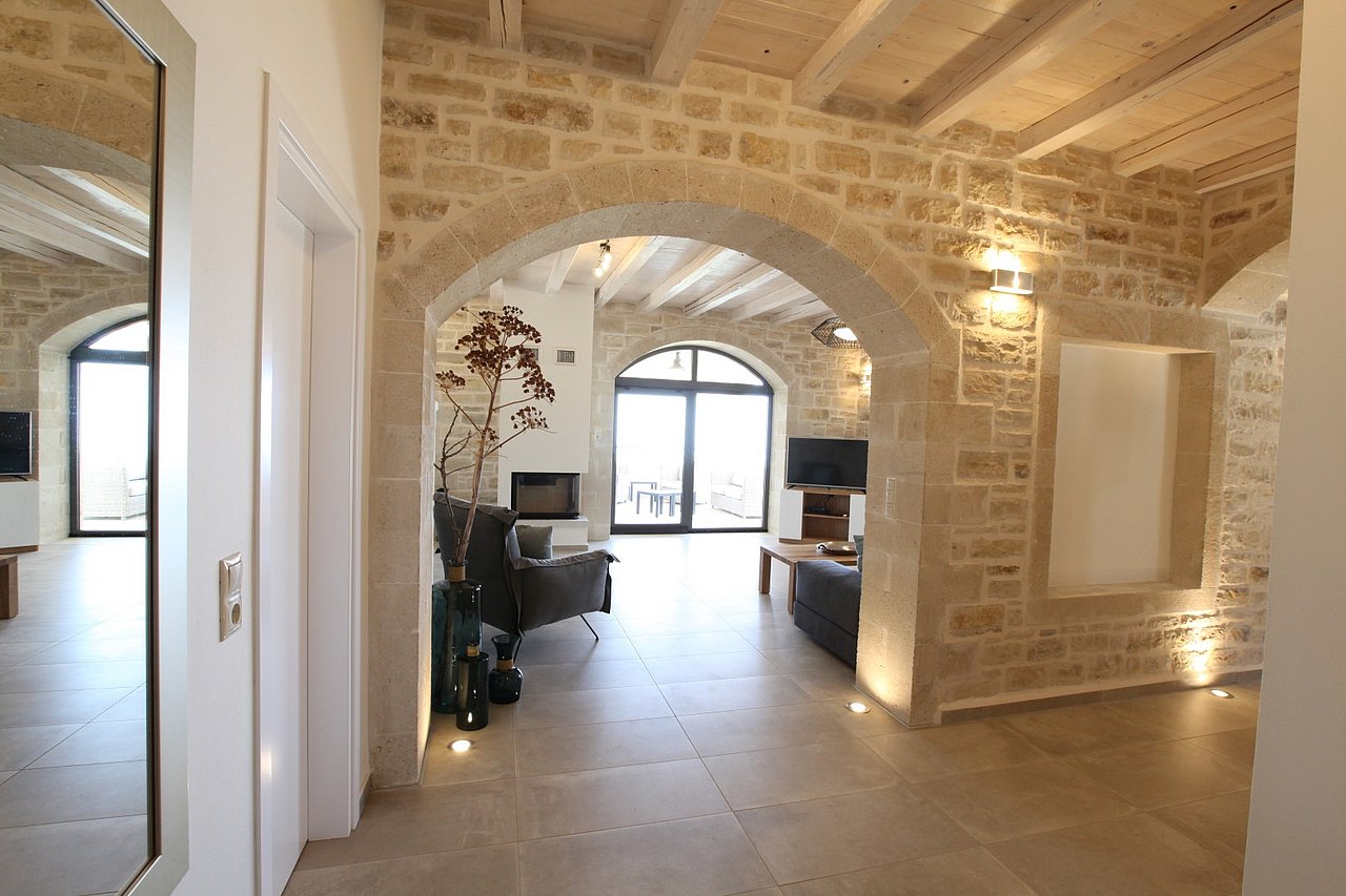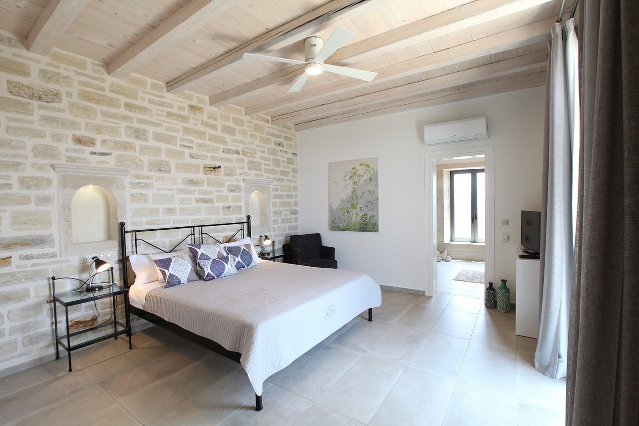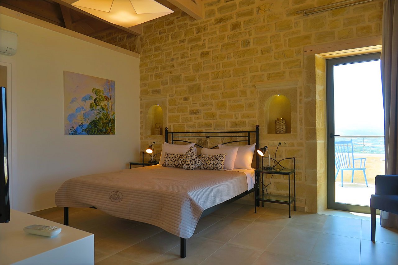 Durch die Lage am Hang befinden sich alle 3 Schlafzimmer auf verschiedenen Ebenen und bieten somit eine höchstmögliche Privatsphäre. Jedes der Schlafzimmer hat durch großzügige Panoramafenster einen grandiosen Ausblick auf das Meer, die Weißen-Berge und die Halbinsel Akrotiri. Die Ausstattung mit hochwertigen Matratzen und handgeschmiedeten, landestypischen Betten garantierten hohen Schlafkomfort. Zwei der Betten besitzen die Größe 180 cm x 200 cm, für Menschen mit etwas mehr Platzbedarf steht in einem der Schlafzimmer ein Bett in Größe 200 cm x 210 cm zur Verfügung.