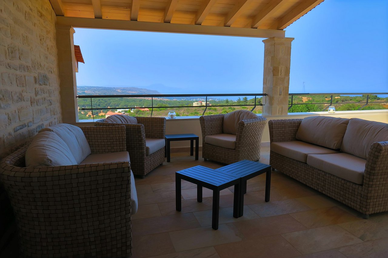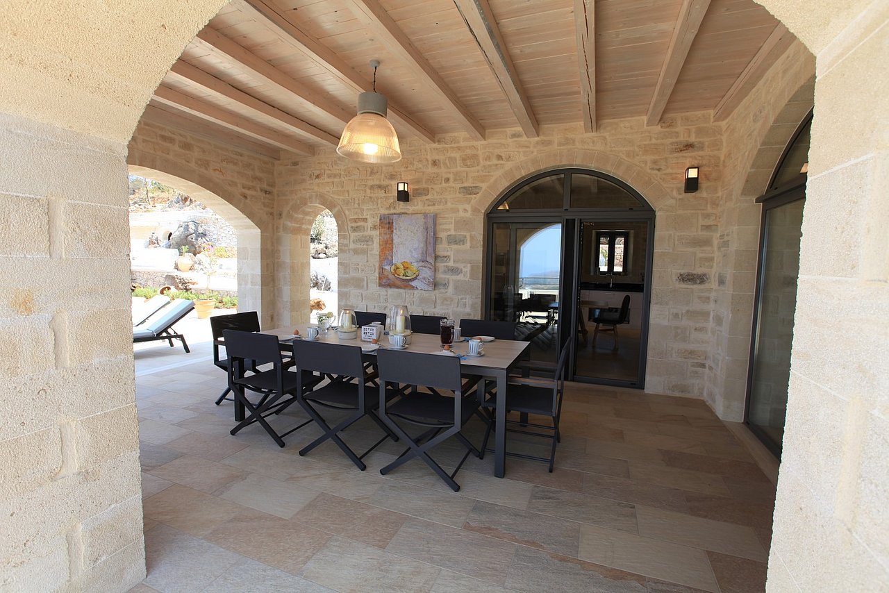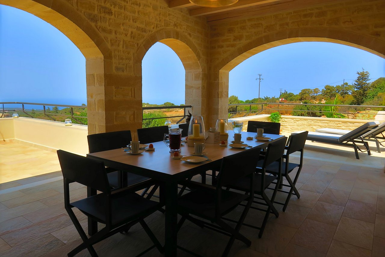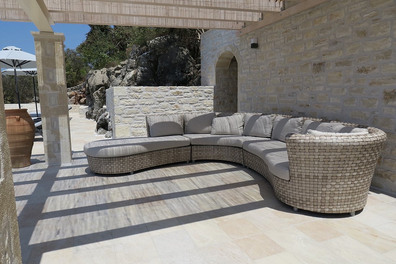 Nehmen Sie Platz auf den bequemen Lounge-Möbeln auf der großen, fest überdachten Außenterrasse und genießen Sie bei einem Glas Wein den Panoramablick und die spektakulären Sonnenuntergänge über dem Ägäischen Meer.