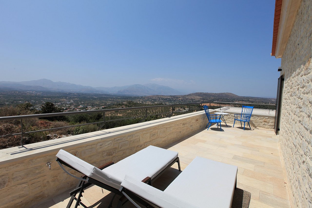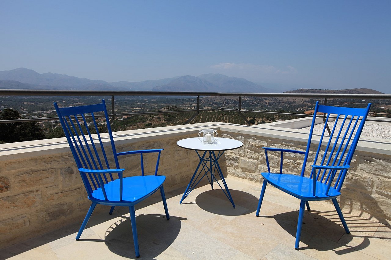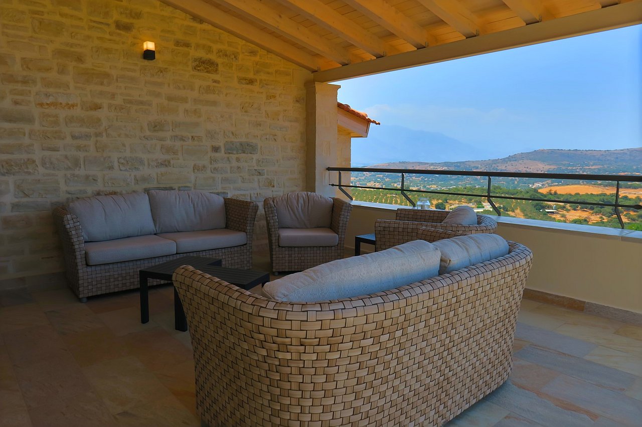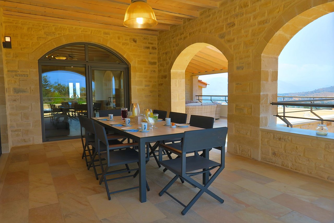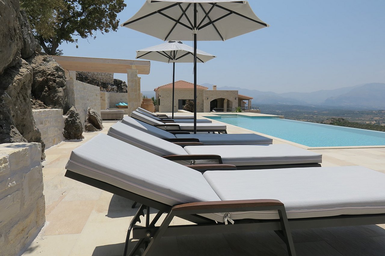 Nehmen Sie Platz auf den bequemen Lounge-Möbeln auf der großen, fest überdachten Außenterrasse und genießen Sie bei einem Glas Wein den Panoramablick und die spektakulären Sonnenuntergänge über dem Ägäischen Meer.