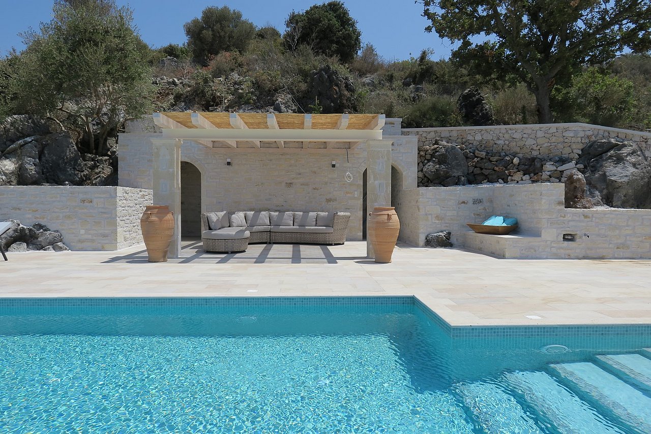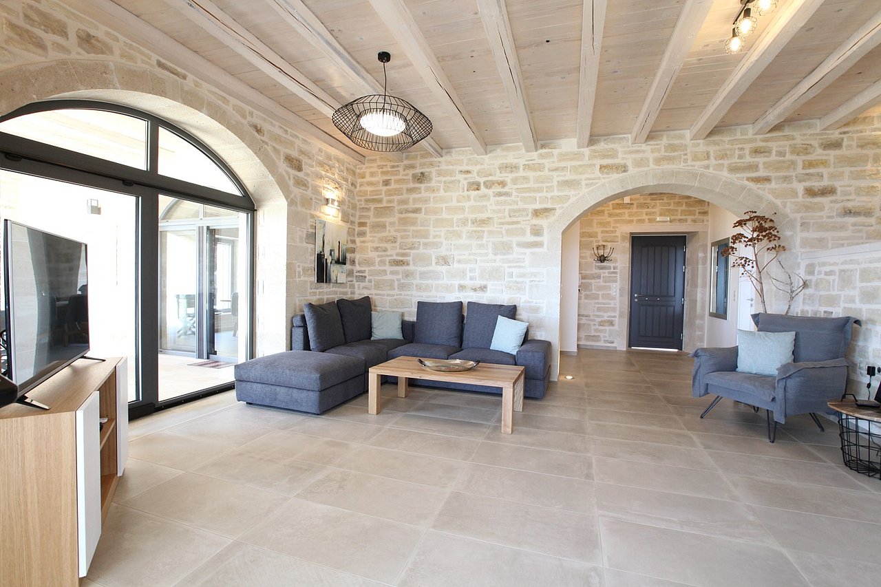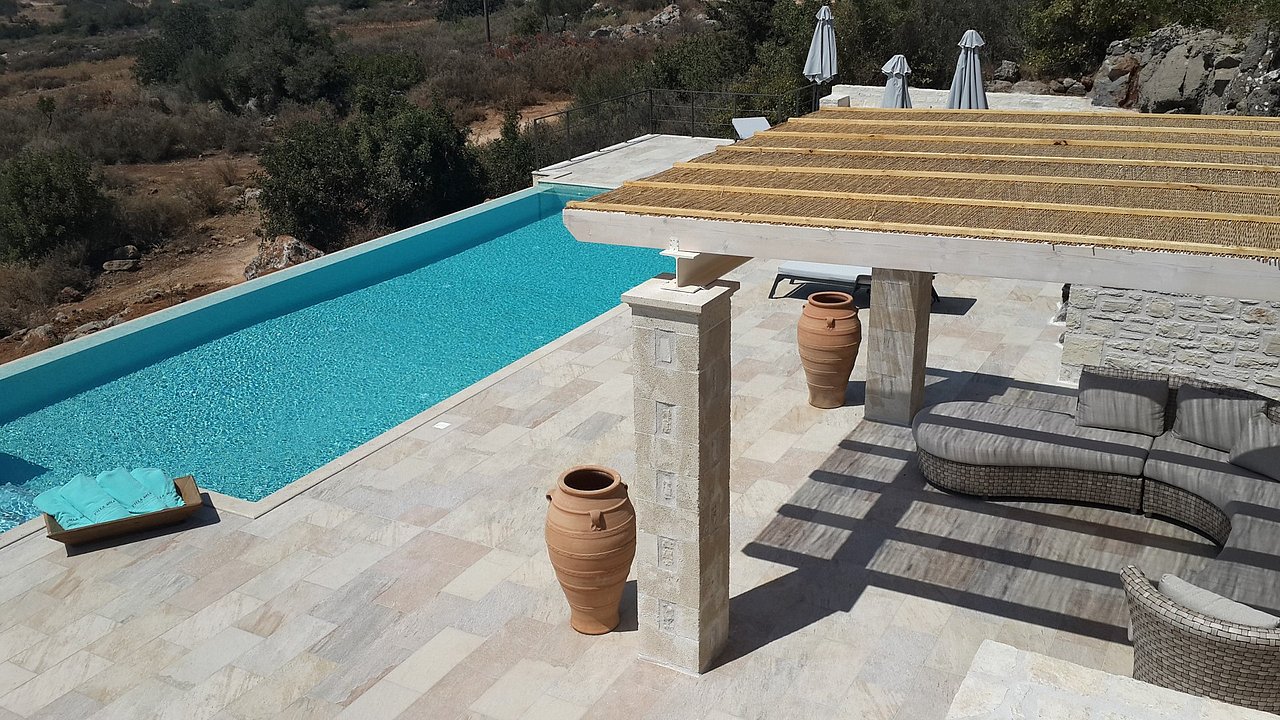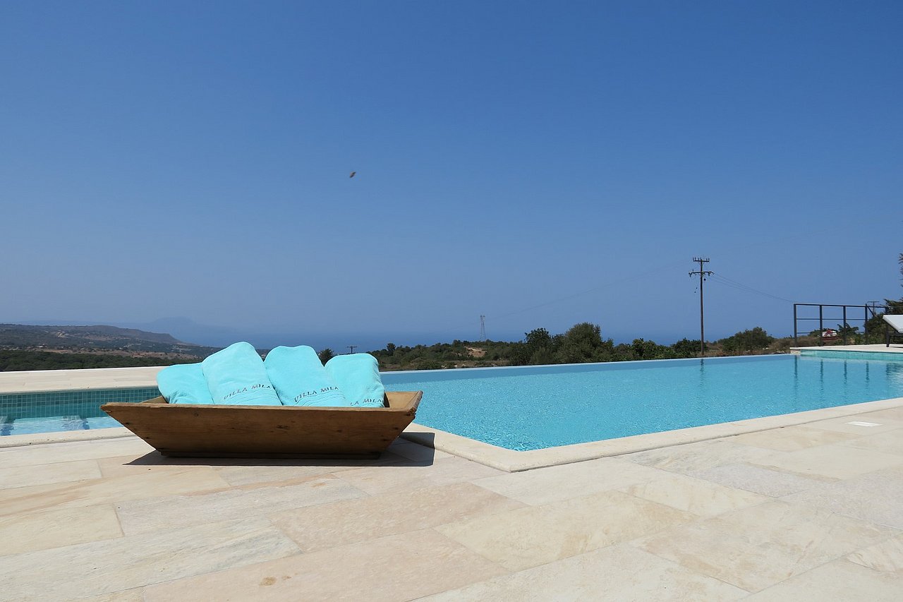 Nehmen Sie Platz auf den bequemen Lounge-Möbeln auf der großen, fest überdachten Außenterrasse und genießen Sie bei einem Glas Wein den Panoramablick und die spektakulären Sonnenuntergänge über dem Ägäischen Meer.