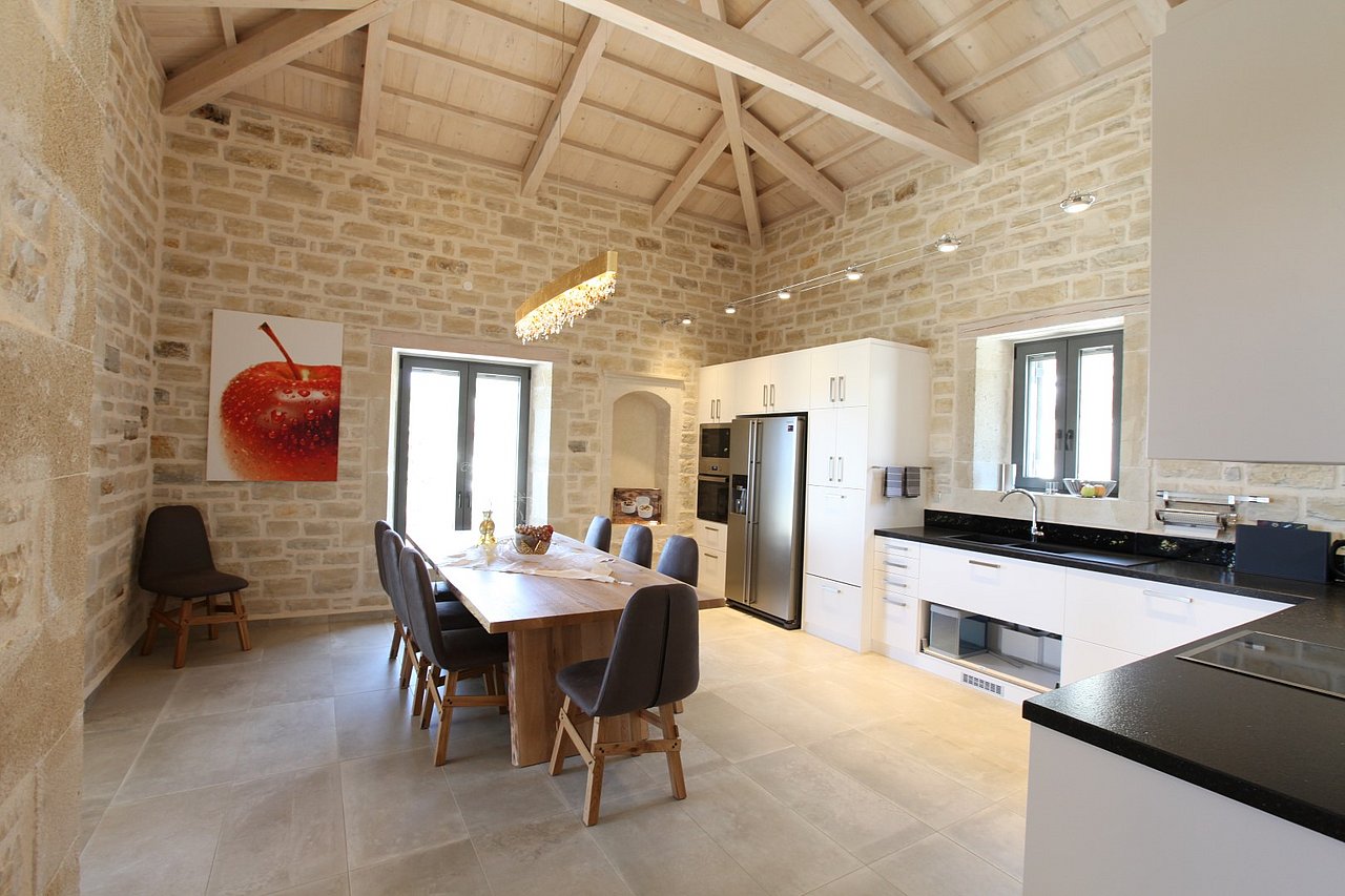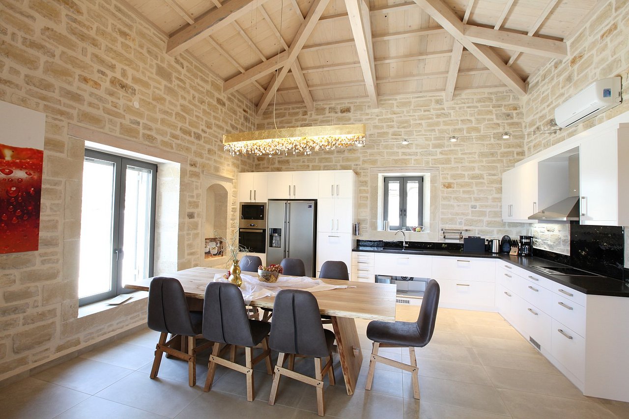 In der offenen Küche erwartet Sie ein großzügiger Essplatz mit bequem gepolsterten Stühlen und einem handgefertigten Massivholztisch.