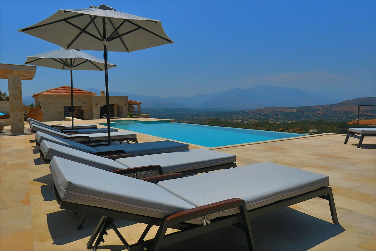 50 m² Infinity-Pool, auf Wunsch beheizbar (nach Gebühr), bequeme Liegen und Sonnenschirme,
