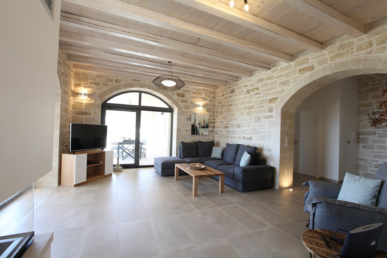 Das elegant gestaltete Wohnzimmer mit bequemer Sitzgarnitur, TV-Flatscreen, Blue-Ray-Player und Stereoanlage lädt zum gemütlichen Beisammensein ein. An kühleren Tagen sorgt ein Umluftkamin für angenehme zusätzliche Wärme.