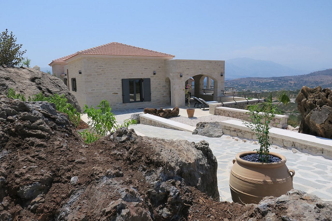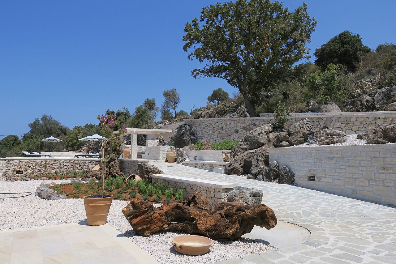 Ein großer Carport spendet Schatten für Ihr Fahrzeug.Es wurde bewusst darauf geachtet, die ursprüngliche, kretische Landschaft mit Felsen, Steinen und Sträuchern zu erhalten.