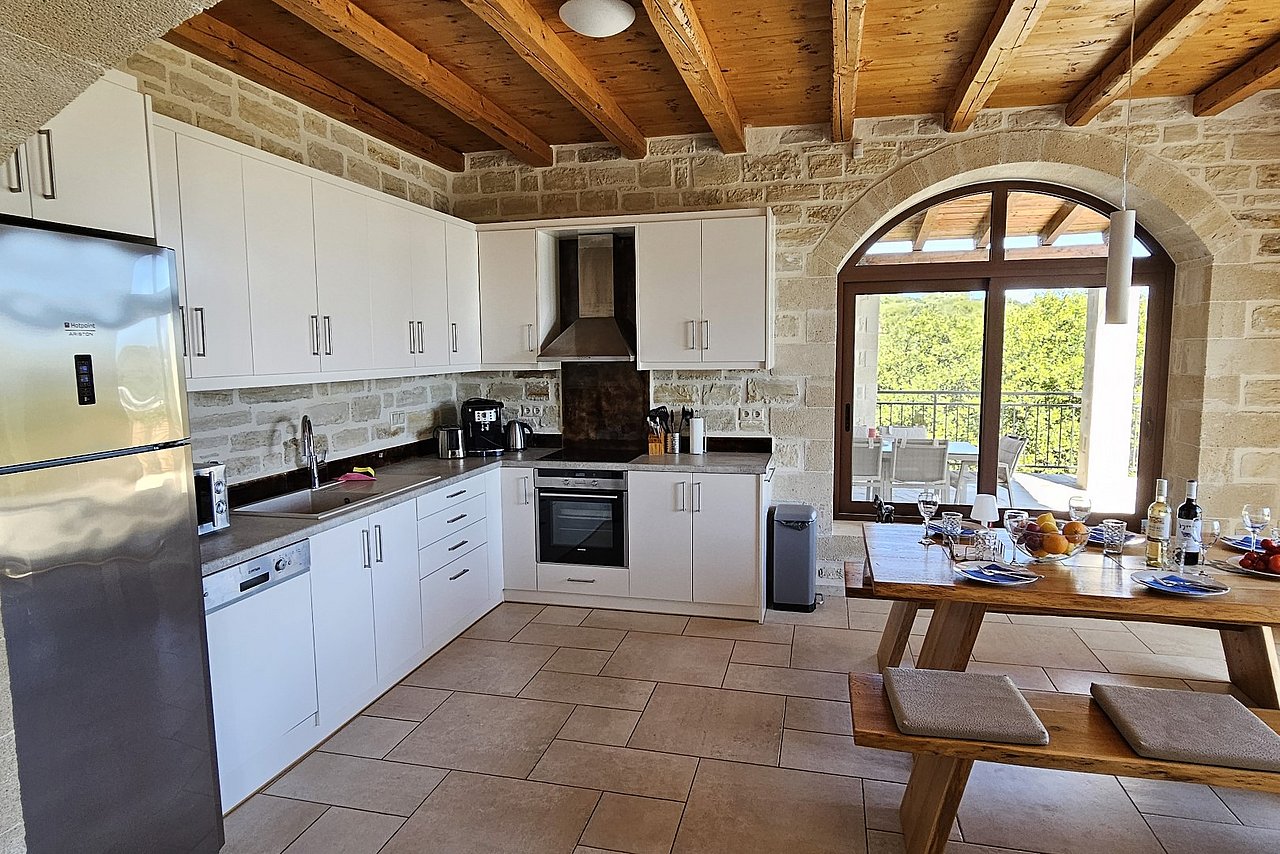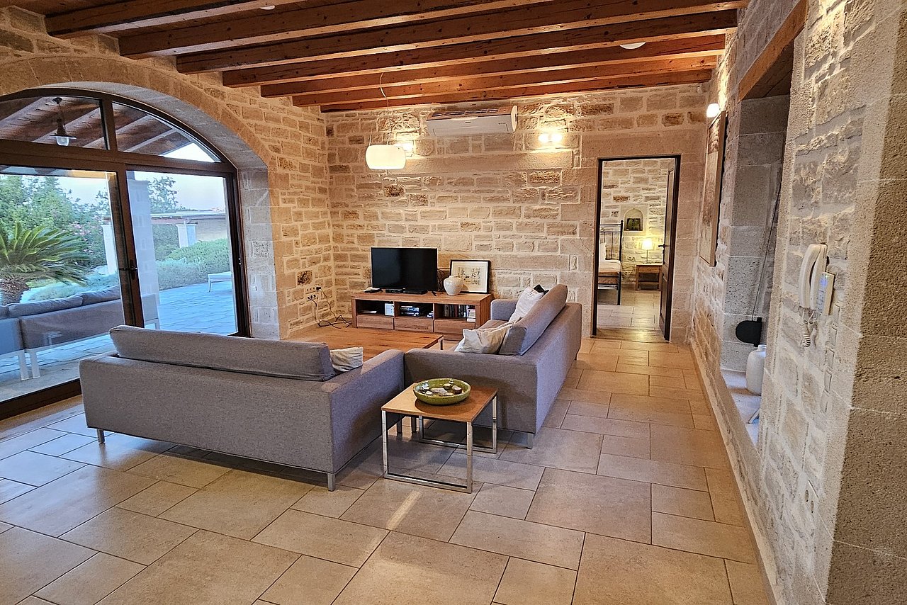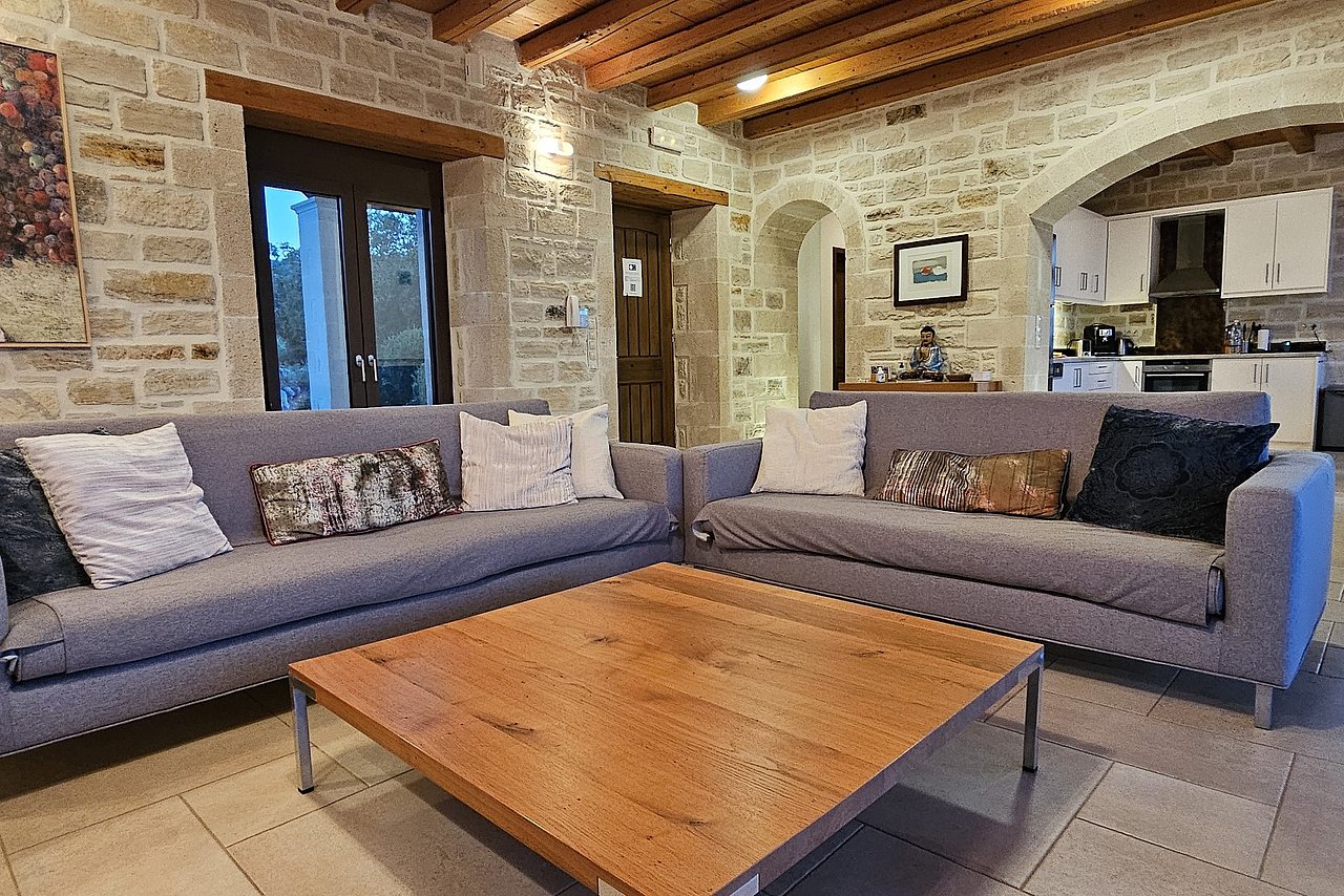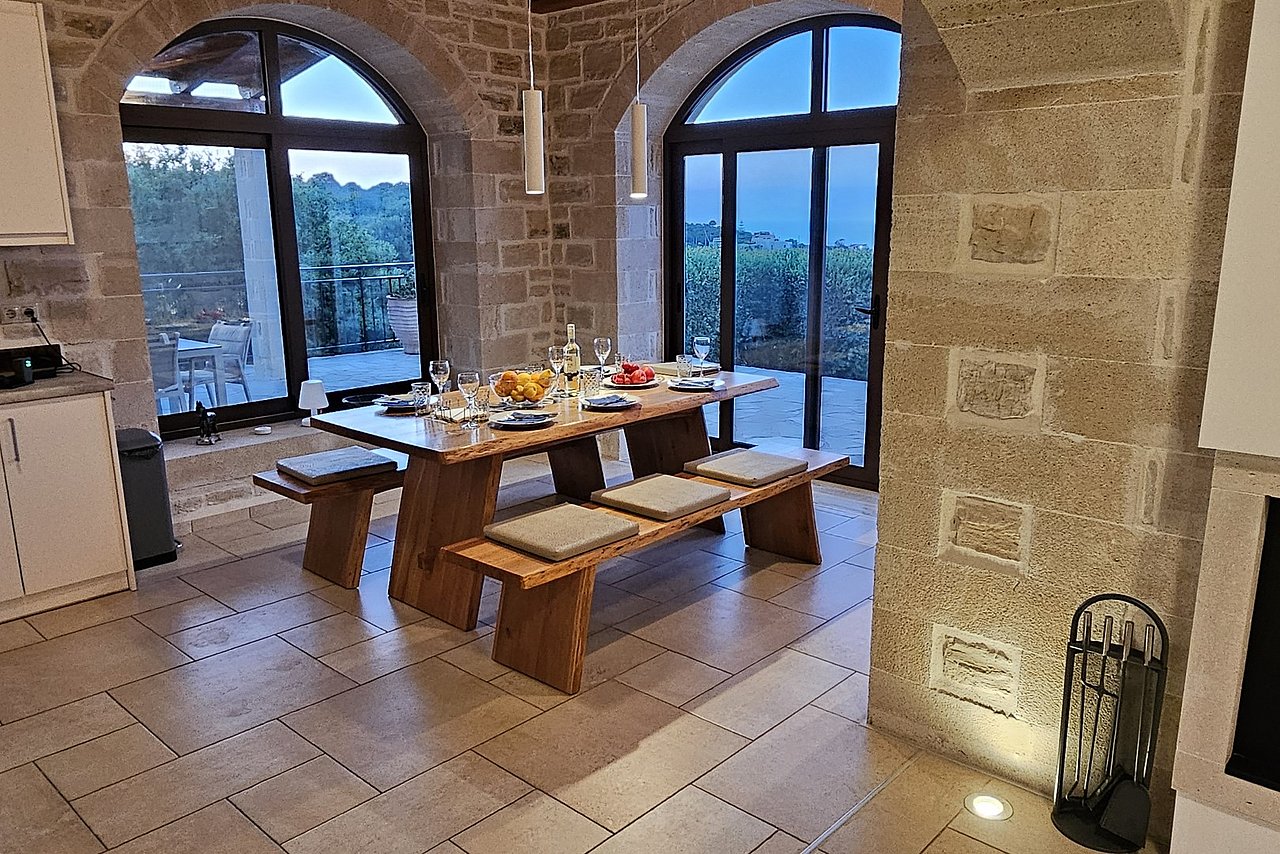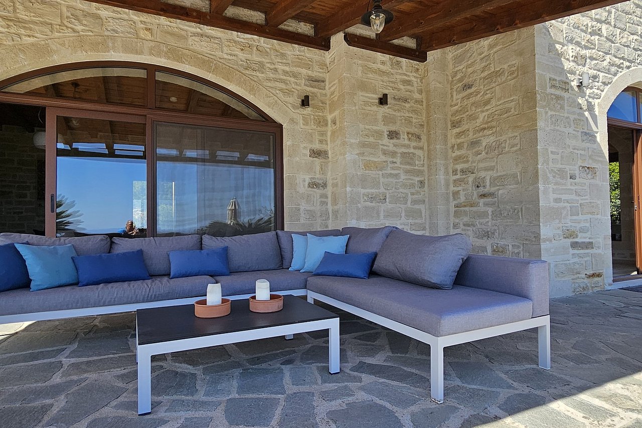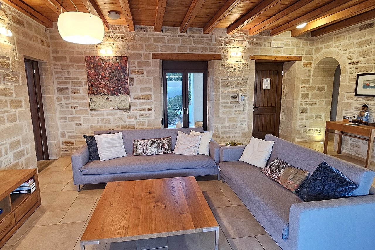 Beim Betreten der Villa gelangen Sie in den großen, lichtdurchfluteten Wohnbereich. Liebevolle Details und hochwertige Möbel erzeugen eine harmonische Mischung aus Moderne und Tradition und laden ein zum Wohlfühlen. Der offene Kamin mit Ventilationsheizung sorgt auch an kühleren Tagen für Gemütlichkeit und der 40 Zoll große internetfähige Ultra-HD-Smart-TV verspricht entspannte Fernsehabende.Von dem Wohnbereich aus gelangen Sie direkt in den Essbereich. In der offen gestalteten, voll ausgestatteten Küche macht ein langer traditioneller Holztisch mit viel Platz für alle Gäste Lust auf ausgiebige Dinner. Auch von hier aus können Sie den schönen Blick auf das Meer genießen.Im oberen Bereich der Villa befinden sich zwei Schlafzimmer. Das eine Zimmer verfügt über ein extralanges Kingsize-Bett mit 180x210cm, das andere Schlafzimmer hat zwei Einzelbetten (90x200cm). Im unteren Bereich befinden sich ebenfalls zwei Schlafzimmer. Davon ist das eine mit einem Kingsize-Bett (180x200cm) und das andere mit zwei Einzelbetten (90x200cm) ausgestattet. Zu jedem Zimmer gehört eine eigene, mit gemütlichen Sitz- und Liegemöglichkeiten möblierte Veranda bzw. Dachterrasse, die den Gästen Rückzugsmöglichkeiten und Entspannung pur garantieren. Die Schlafzimmer sind alle mit eigenem Ensuite-Bad, großen Panoramafenstern, internetfähigem Full-HD-Smart-TV und Klimaanlage ausgestattet, damit keine Wünsche offen bleiben.