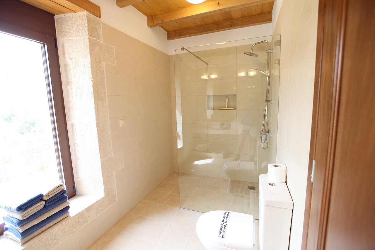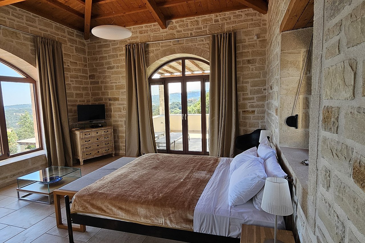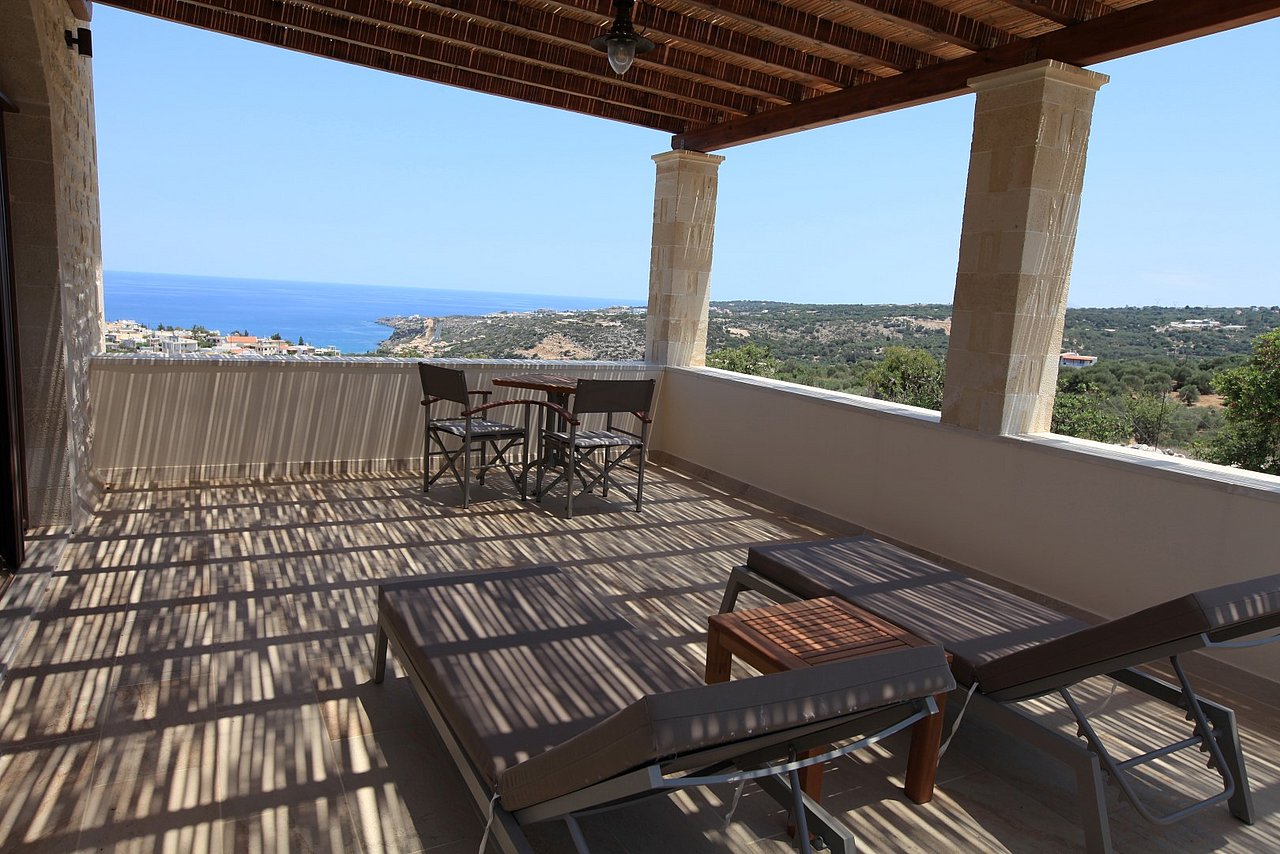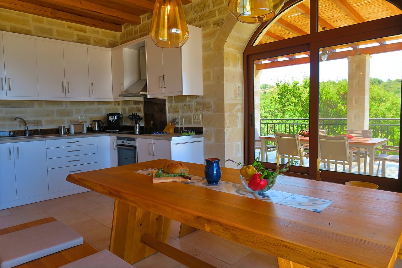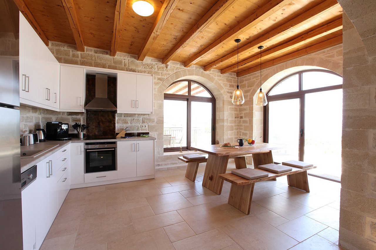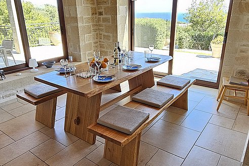 Beim Betreten der Villa gelangen Sie in den großen, lichtdurchfluteten Wohnbereich. Liebevolle Details und hochwertige Möbel erzeugen eine harmonische Mischung aus Moderne und Tradition und laden ein zum Wohlfühlen. Der offene Kamin mit Ventilationsheizung sorgt auch an kühleren Tagen für Gemütlichkeit und der 40 Zoll große internetfähige Ultra-HD-Smart-TV verspricht entspannte Fernsehabende.Von dem Wohnbereich aus gelangen Sie direkt in den Essbereich. In der offen gestalteten, voll ausgestatteten Küche macht ein langer traditioneller Holztisch mit viel Platz für alle Gäste Lust auf ausgiebige Dinner. Auch von hier aus können Sie den schönen Blick auf das Meer genießen.Im oberen Bereich der Villa befinden sich zwei Schlafzimmer. Das eine Zimmer verfügt über ein extralanges Kingsize-Bett mit 180x210cm, das andere Schlafzimmer hat zwei Einzelbetten (90x200cm). Im unteren Bereich befinden sich ebenfalls zwei Schlafzimmer. Davon ist das eine mit einem Kingsize-Bett (180x200cm) und das andere mit zwei Einzelbetten (90x200cm) ausgestattet. Zu jedem Zimmer gehört eine eigene, mit gemütlichen Sitz- und Liegemöglichkeiten möblierte Veranda bzw. Dachterrasse, die den Gästen Rückzugsmöglichkeiten und Entspannung pur garantieren. Die Schlafzimmer sind alle mit eigenem Ensuite-Bad, großen Panoramafenstern, internetfähigem Full-HD-Smart-TV und Klimaanlage ausgestattet, damit keine Wünsche offen bleiben.