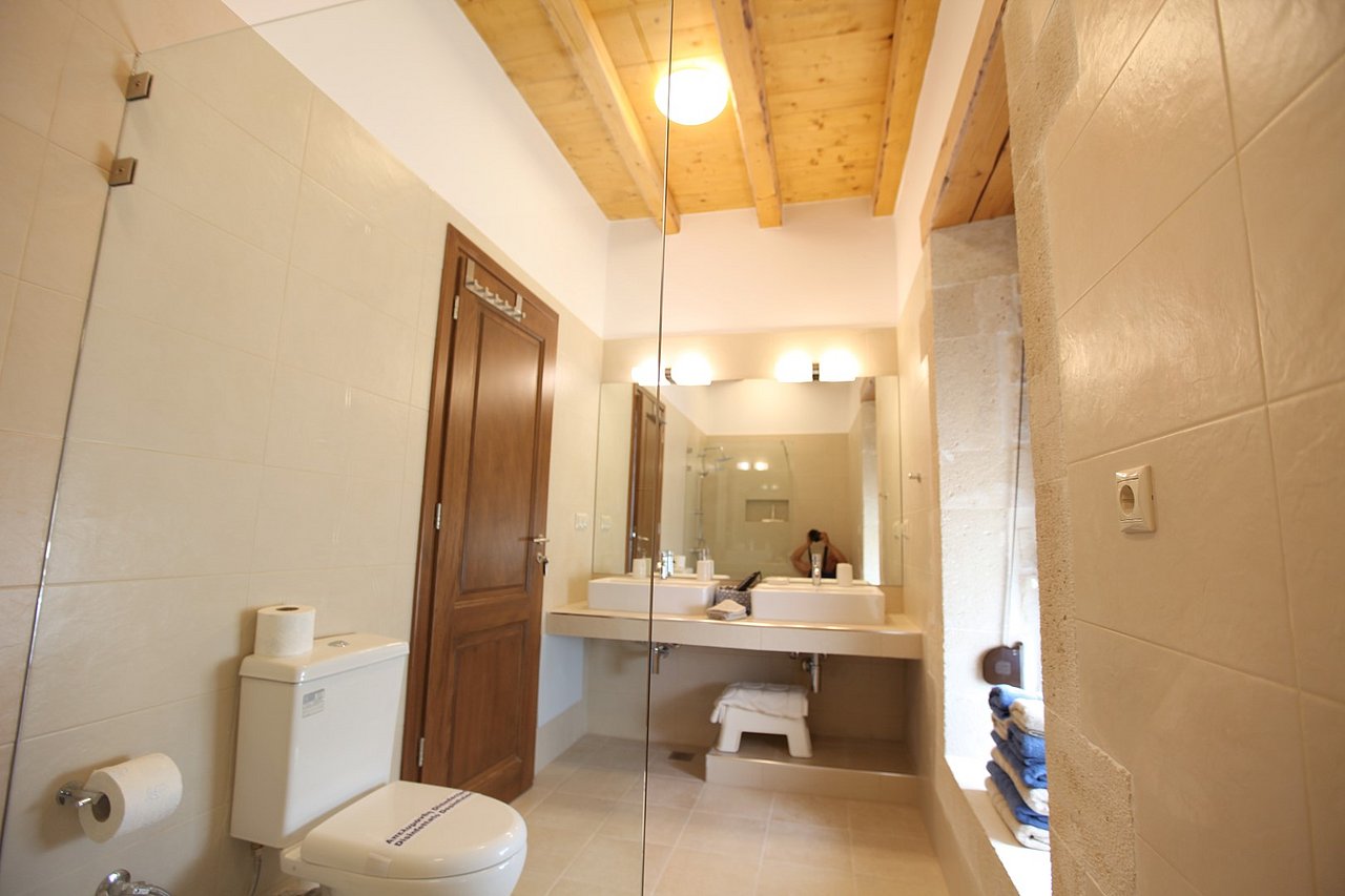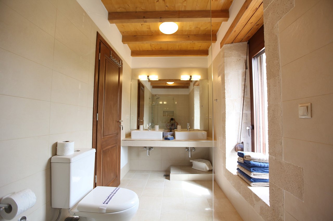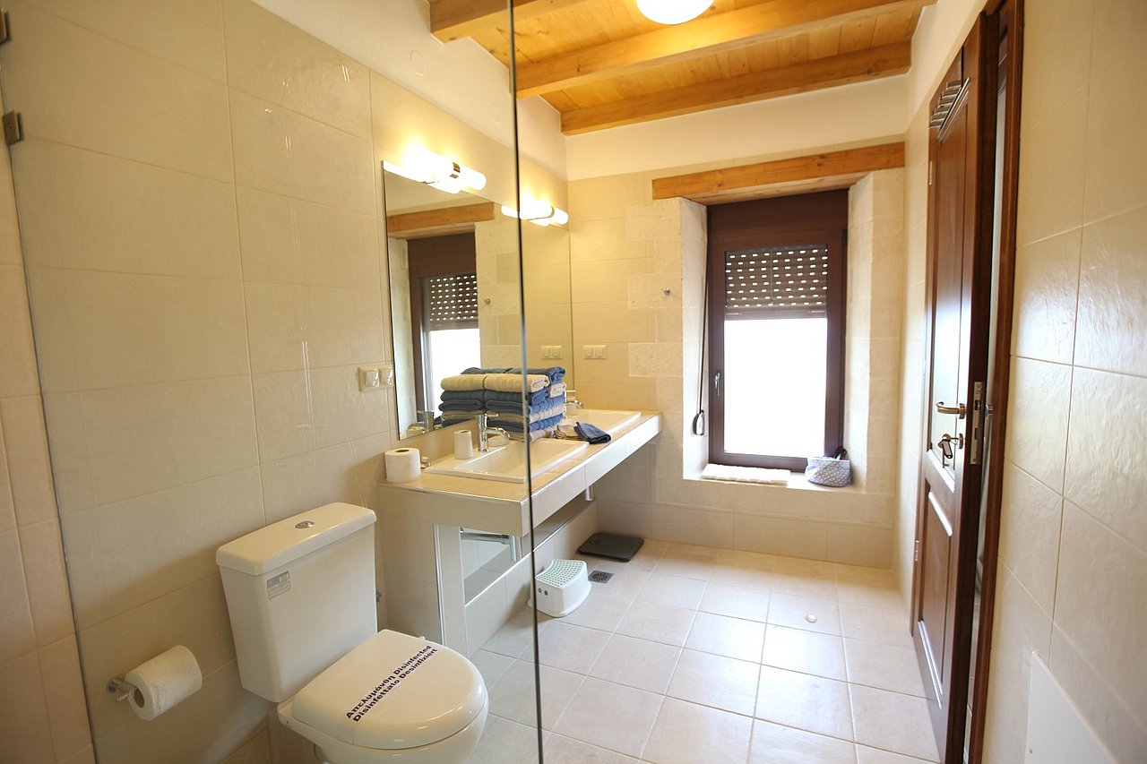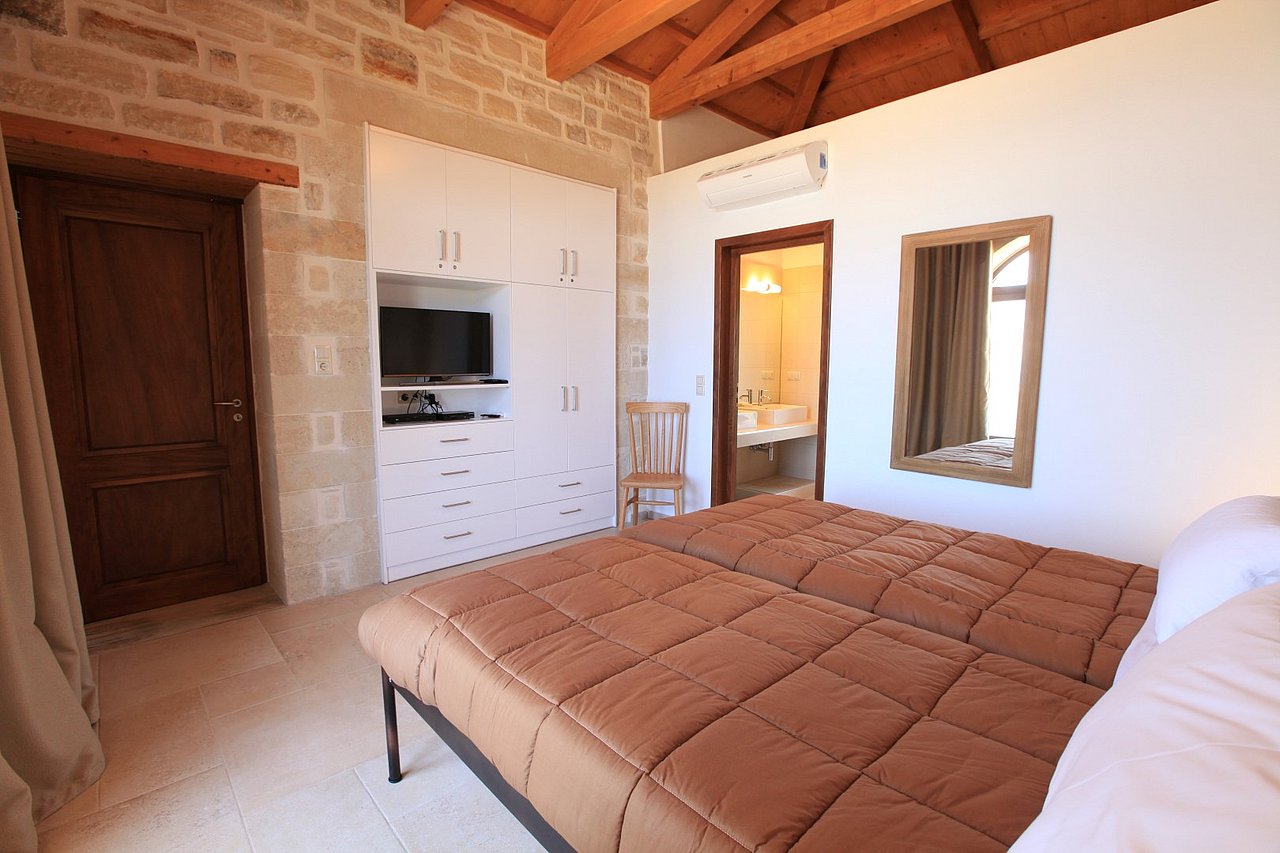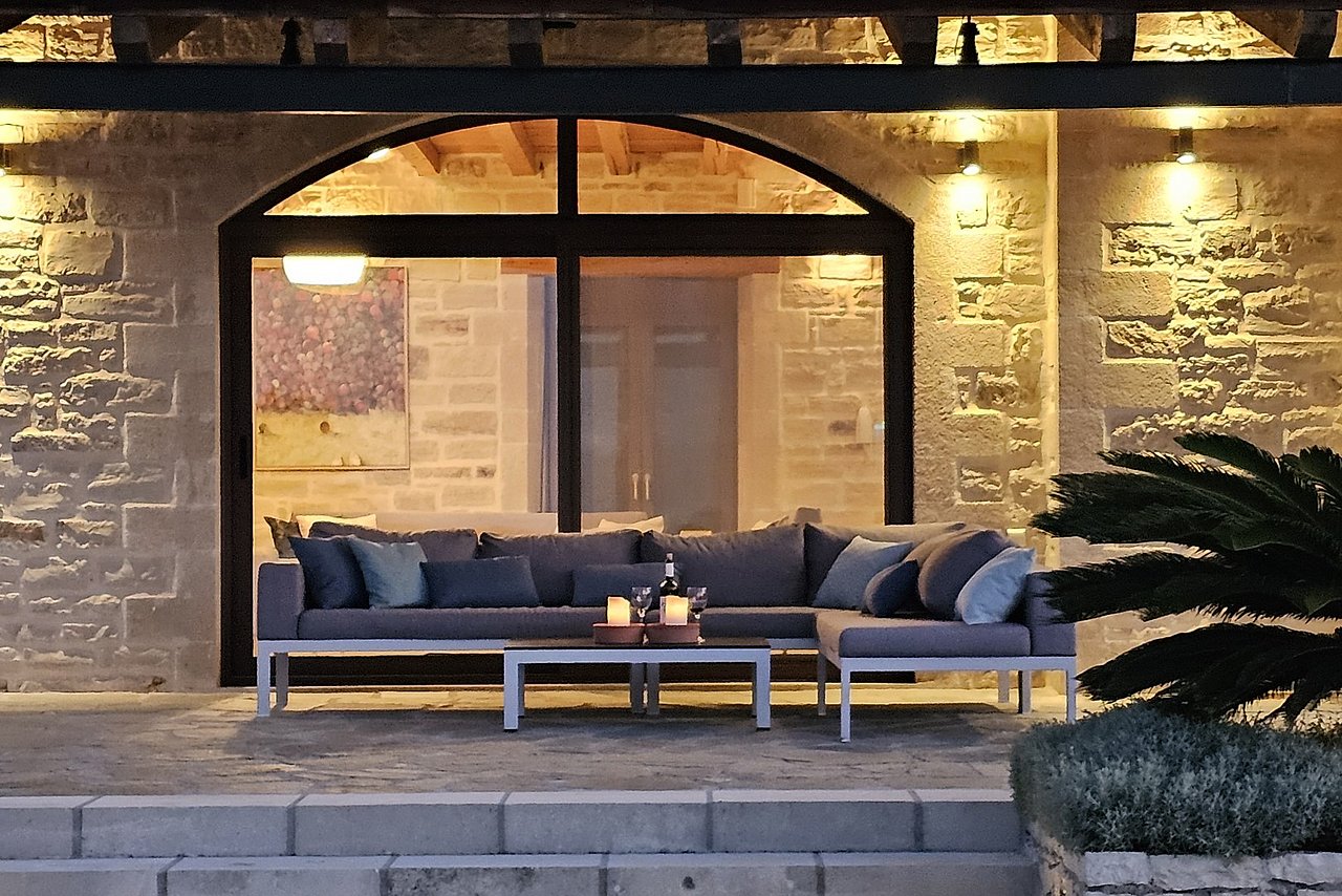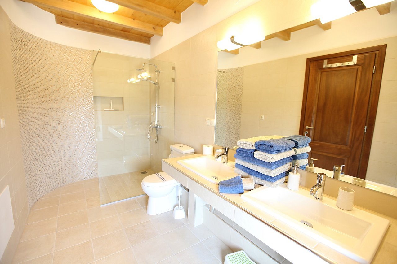 Beim Betreten der Villa gelangen Sie in den großen, lichtdurchfluteten Wohnbereich. Liebevolle Details und hochwertige Möbel erzeugen eine harmonische Mischung aus Moderne und Tradition und laden ein zum Wohlfühlen. Der offene Kamin mit Ventilationsheizung sorgt auch an kühleren Tagen für Gemütlichkeit und der 40 Zoll große internetfähige Ultra-HD-Smart-TV verspricht entspannte Fernsehabende.Von dem Wohnbereich aus gelangen Sie direkt in den Essbereich. In der offen gestalteten, voll ausgestatteten Küche macht ein langer traditioneller Holztisch mit viel Platz für alle Gäste Lust auf ausgiebige Dinner. Auch von hier aus können Sie den schönen Blick auf das Meer genießen.Im oberen Bereich der Villa befinden sich zwei Schlafzimmer. Das eine Zimmer verfügt über ein extralanges Kingsize-Bett mit 180x210cm, das andere Schlafzimmer hat zwei Einzelbetten (90x200cm). Im unteren Bereich befinden sich ebenfalls zwei Schlafzimmer. Davon ist das eine mit einem Kingsize-Bett (180x200cm) und das andere mit zwei Einzelbetten (90x200cm) ausgestattet. Zu jedem Zimmer gehört eine eigene, mit gemütlichen Sitz- und Liegemöglichkeiten möblierte Veranda bzw. Dachterrasse, die den Gästen Rückzugsmöglichkeiten und Entspannung pur garantieren. Die Schlafzimmer sind alle mit eigenem Ensuite-Bad, großen Panoramafenstern, internetfähigem Full-HD-Smart-TV und Klimaanlage ausgestattet, damit keine Wünsche offen bleiben.