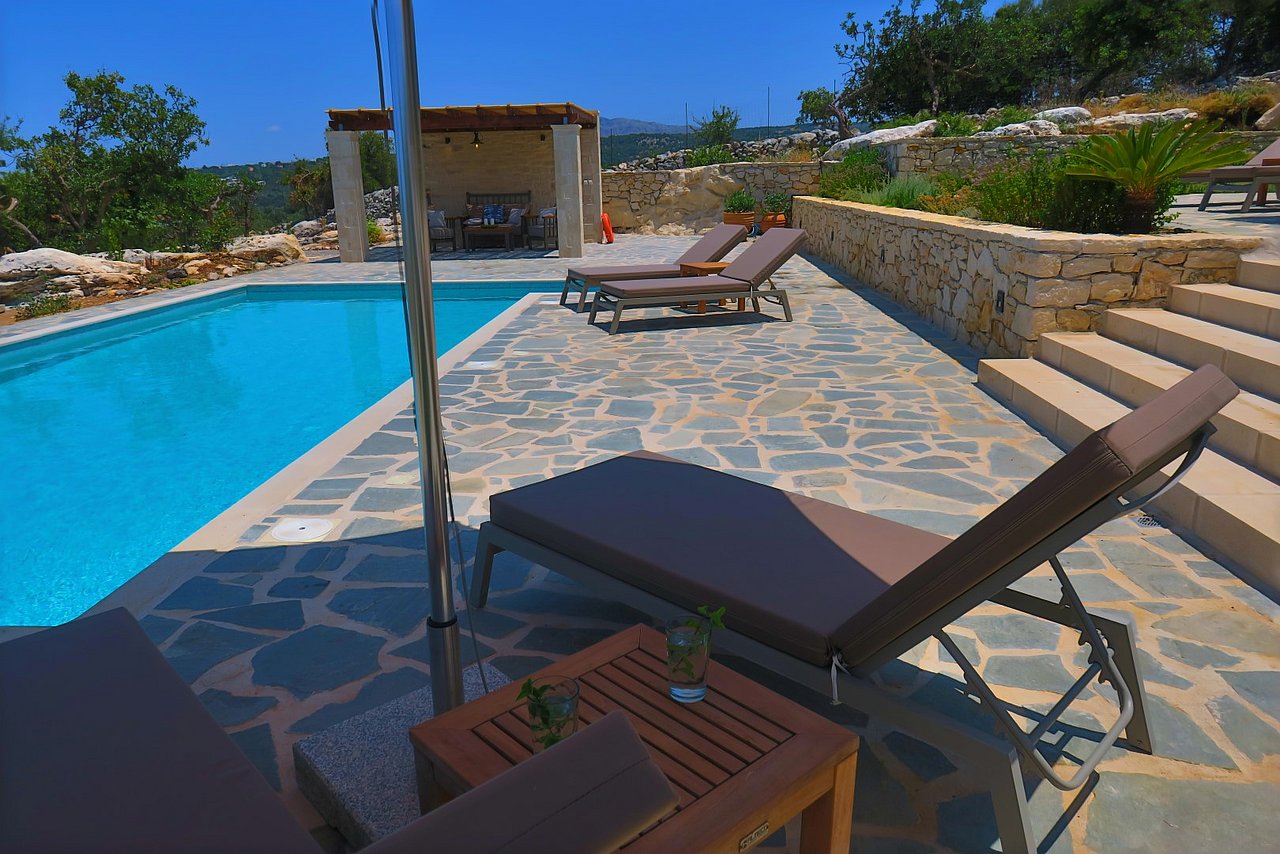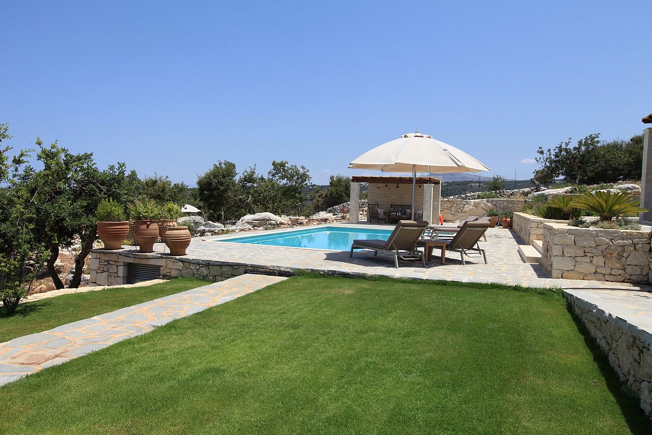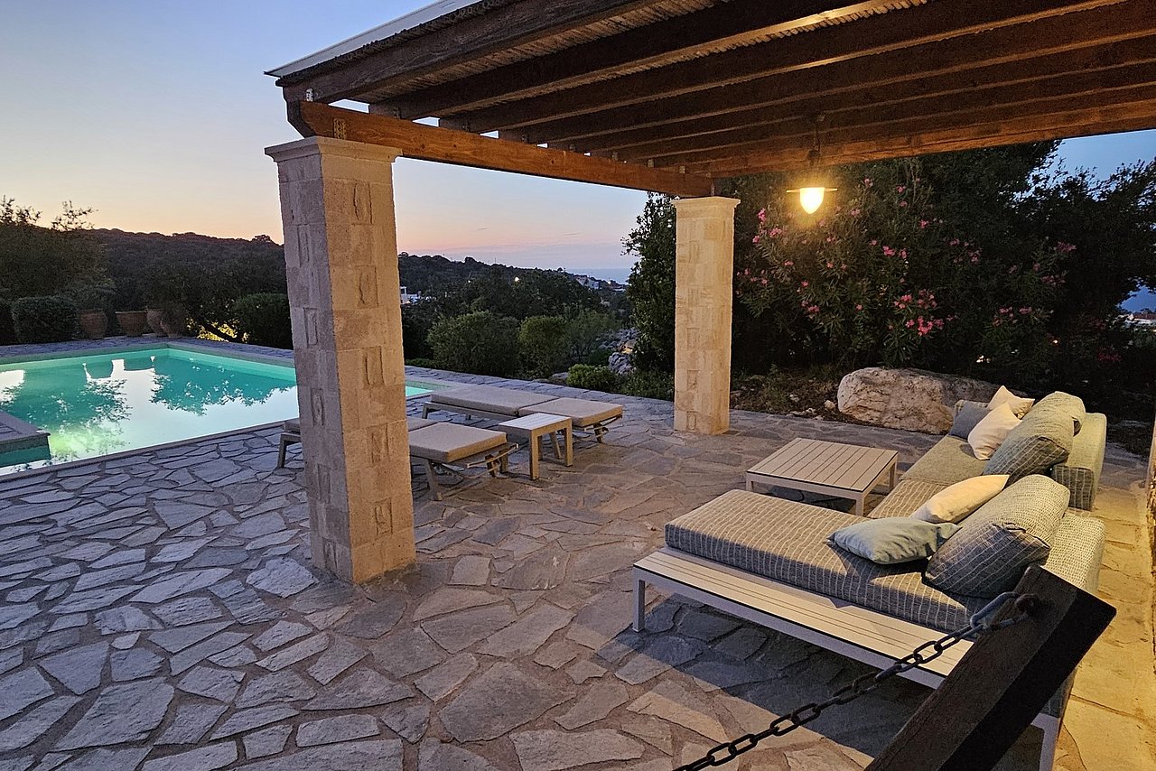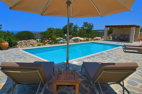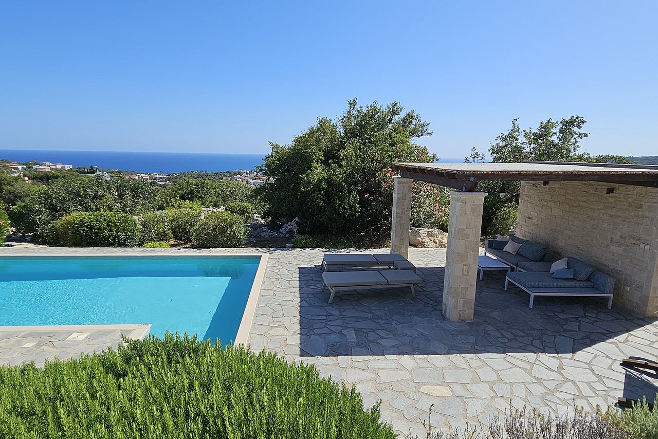 Der große Außenbereich der Villa Minea ist geprägt durch den ursprünglichen Baumbestand und die beim Bau der Villa erhalten gebliebenen Felsformationen, die das Bild der kretischen Landschaft prägen. Direkt vor der Villa genießen Sie vom überschatteten Essplatz oder vom gemütlichen Lounge-Bereich aus den herrlichen Blick über die liebevoll gestaltete Gartenanlage bis zum Meer. Auf dieser Ebene befindet sich auch die angrenzende Outdoor-Küche. Inmitten des Kräutergartens lässt sie den Grillfreunden die Wahl zwischen einem gemauertem Holzkohlegrill oder einem Gasgrill von Weber.Viele Liegemöglichkeiten mit schattenspendenden Sonnenschirmen und ein zusätzlich überdachtes Pooldeck mit Loungemöbeln rund um den Pool versprechen Badevergnügen und gemütliche Stunden.
