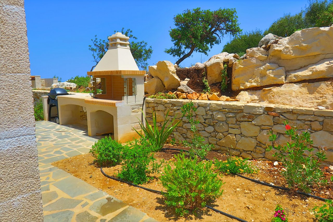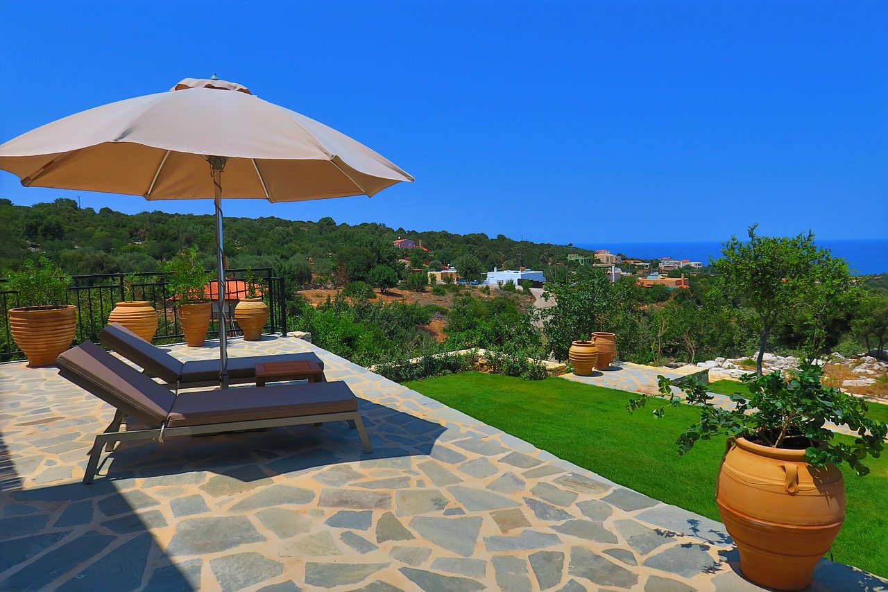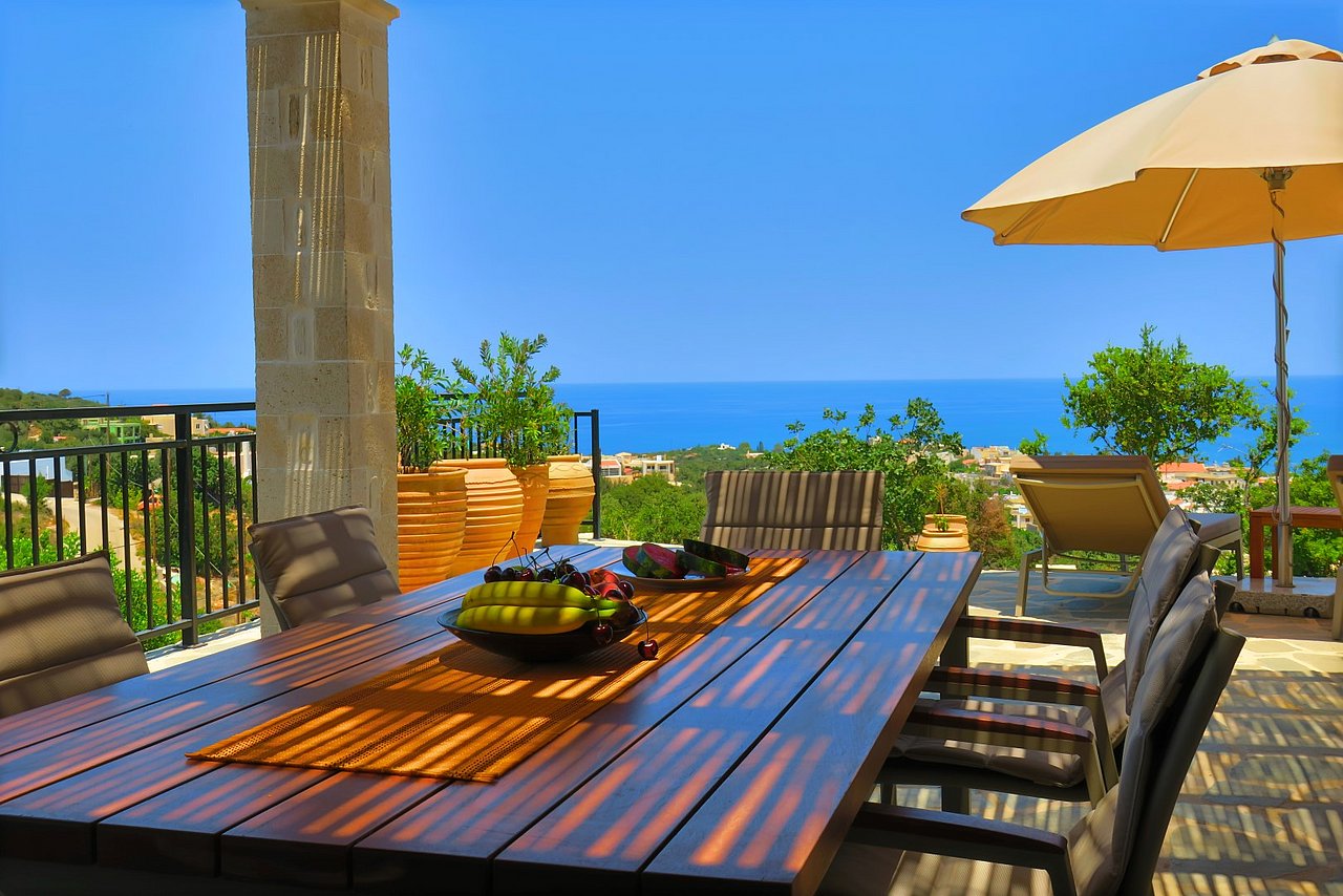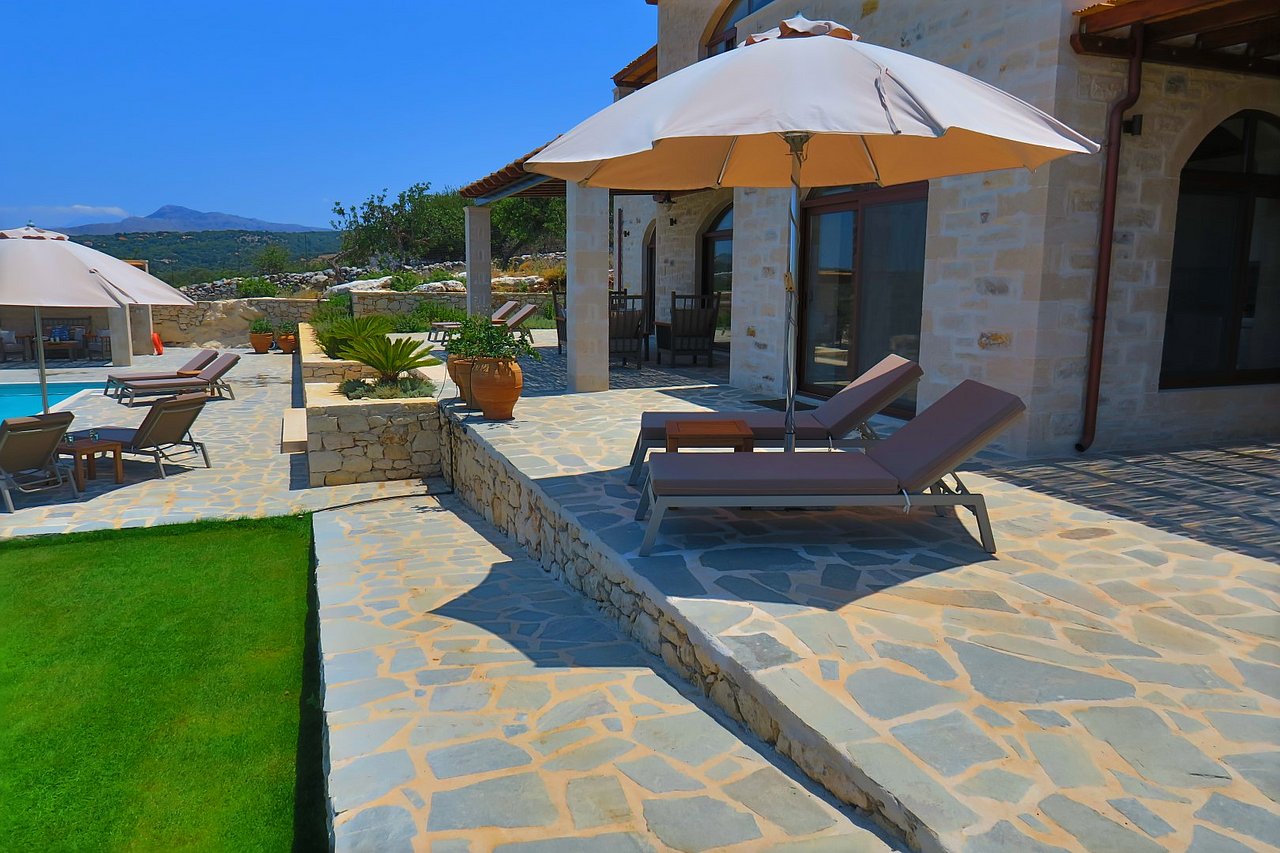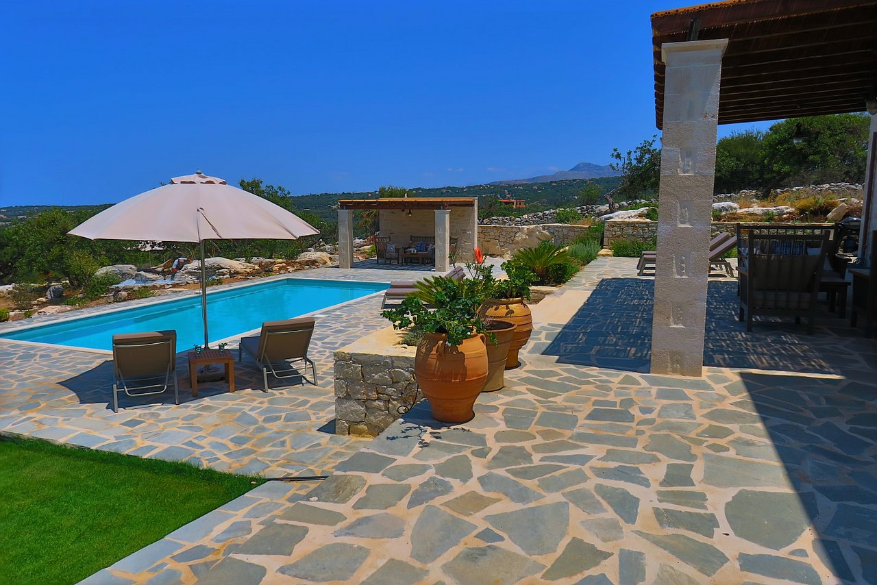 Der große Außenbereich der Villa Minea ist geprägt durch den ursprünglichen Baumbestand und die beim Bau der Villa erhalten gebliebenen Felsformationen, die das Bild der kretischen Landschaft prägen. Direkt vor der Villa genießen Sie vom überschatteten Essplatz oder vom gemütlichen Lounge-Bereich aus den herrlichen Blick über die liebevoll gestaltete Gartenanlage bis zum Meer. Auf dieser Ebene befindet sich auch die angrenzende Outdoor-Küche. Inmitten des Kräutergartens lässt sie den Grillfreunden die Wahl zwischen einem gemauertem Holzkohlegrill oder einem Gasgrill von Weber.Viele Liegemöglichkeiten mit schattenspendenden Sonnenschirmen und ein zusätzlich überdachtes Pooldeck mit Loungemöbeln rund um den Pool versprechen Badevergnügen und gemütliche Stunden.