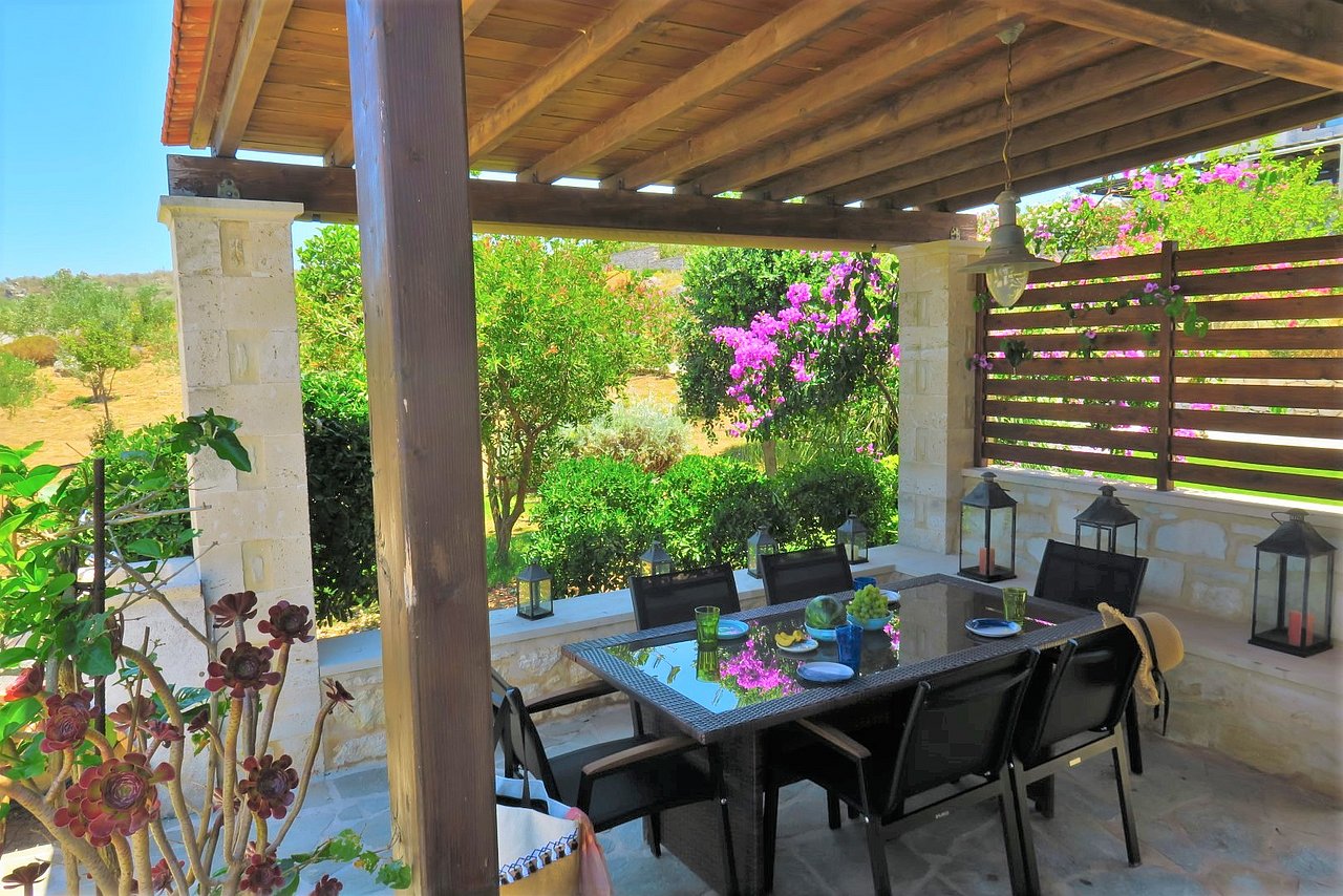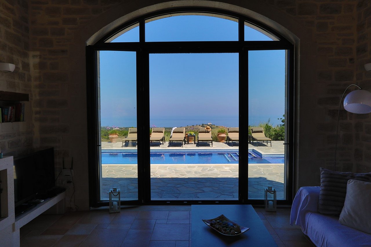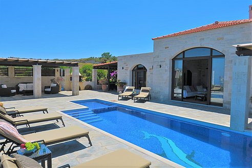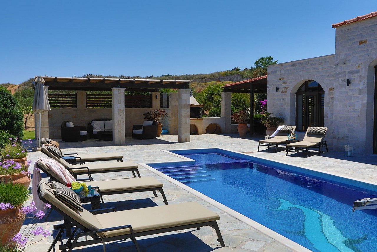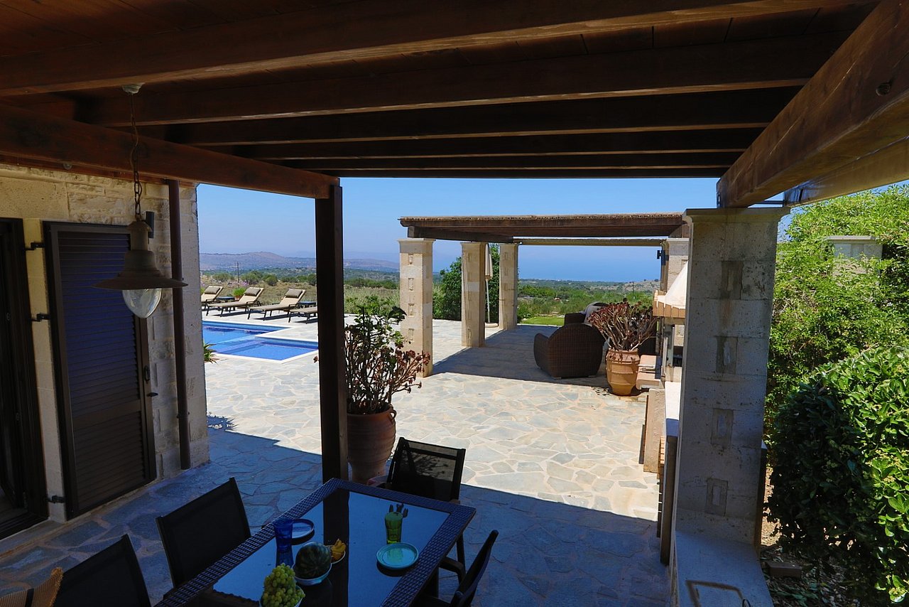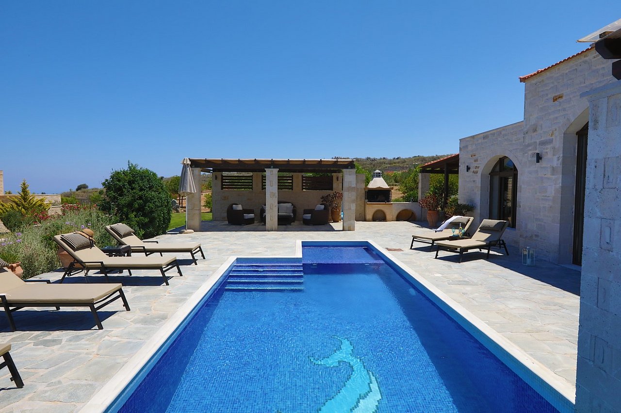 Die Villa liegt auf einem Hügel zwischen Atsipopoulo und Castellos und wurde im traditionellen kretischen Stil aus massivem Stein gebaut. Sie verfügt über einen grandiosen Blick auf die Berge und das Meer, und ist umgeben von einem 4.000qm großen Grundstück mit schönem, mediterranen Garten.