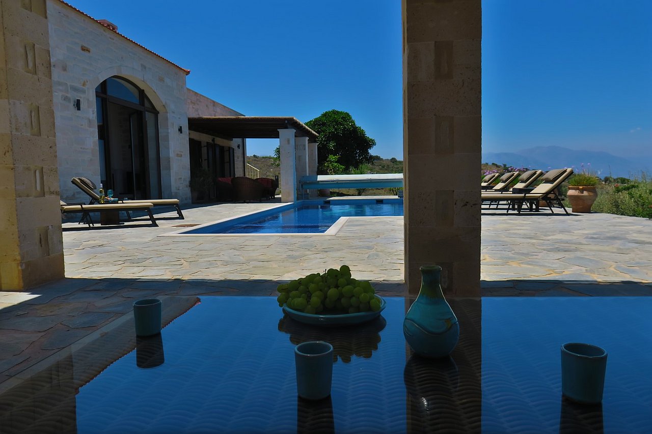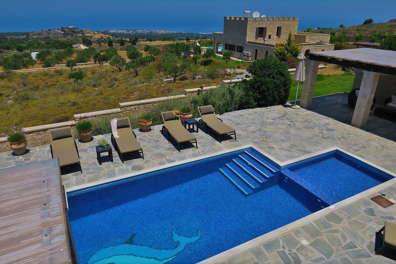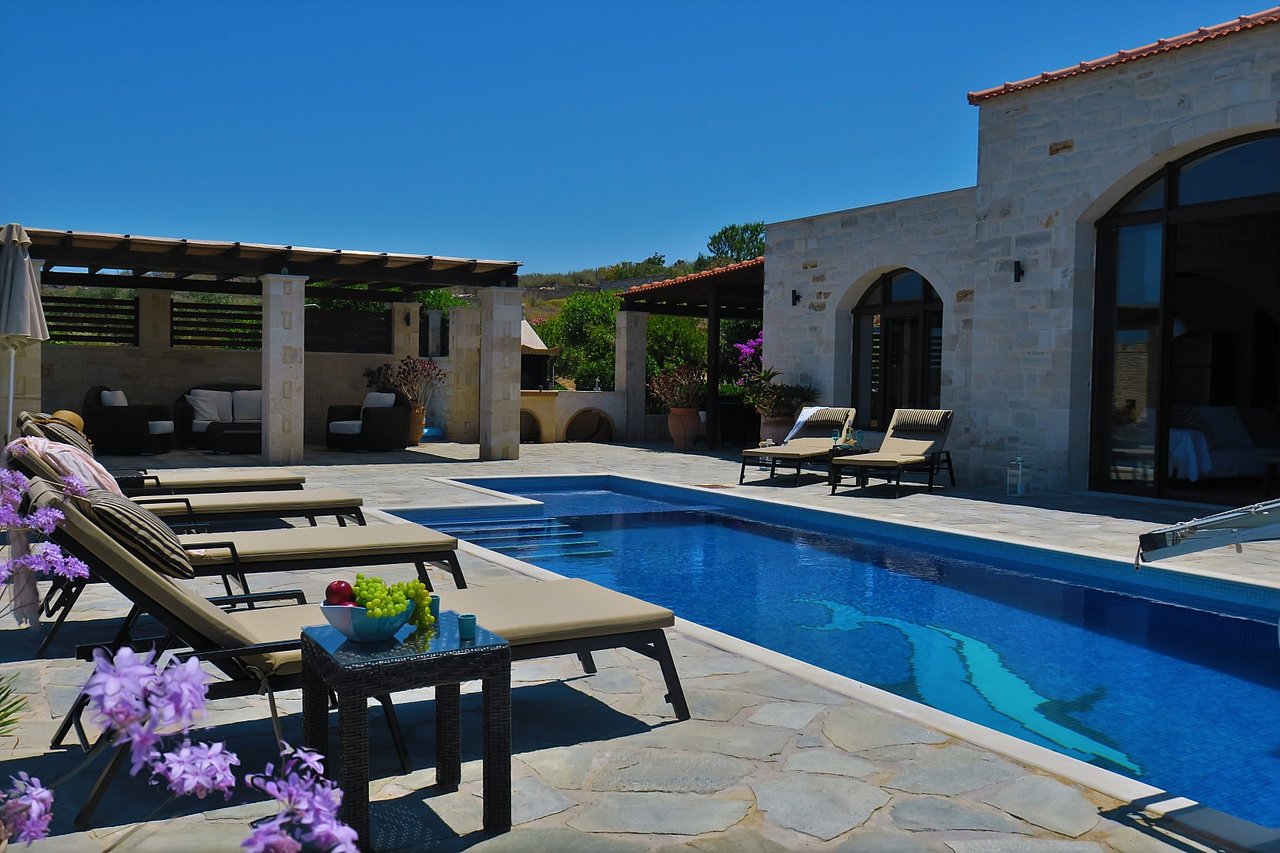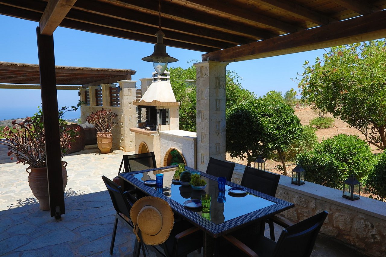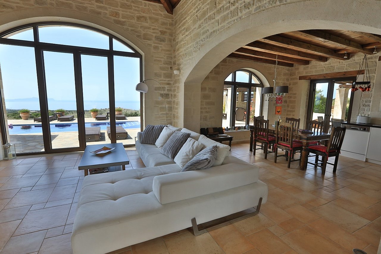 Die Villa liegt auf einem Hügel zwischen Atsipopoulo und Castellos und wurde im traditionellen kretischen Stil aus massivem Stein gebaut. Sie verfügt über einen grandiosen Blick auf die Berge und das Meer, und ist umgeben von einem 4.000qm großen Grundstück mit schönem, mediterranen Garten.