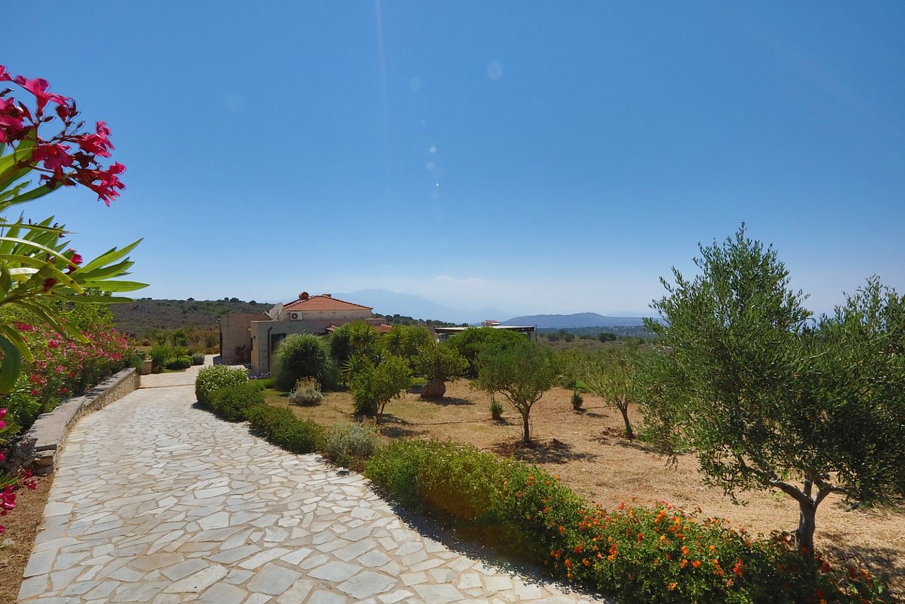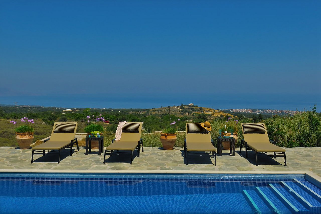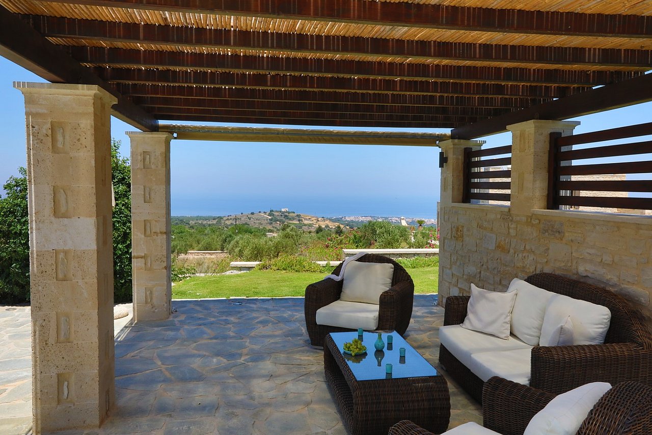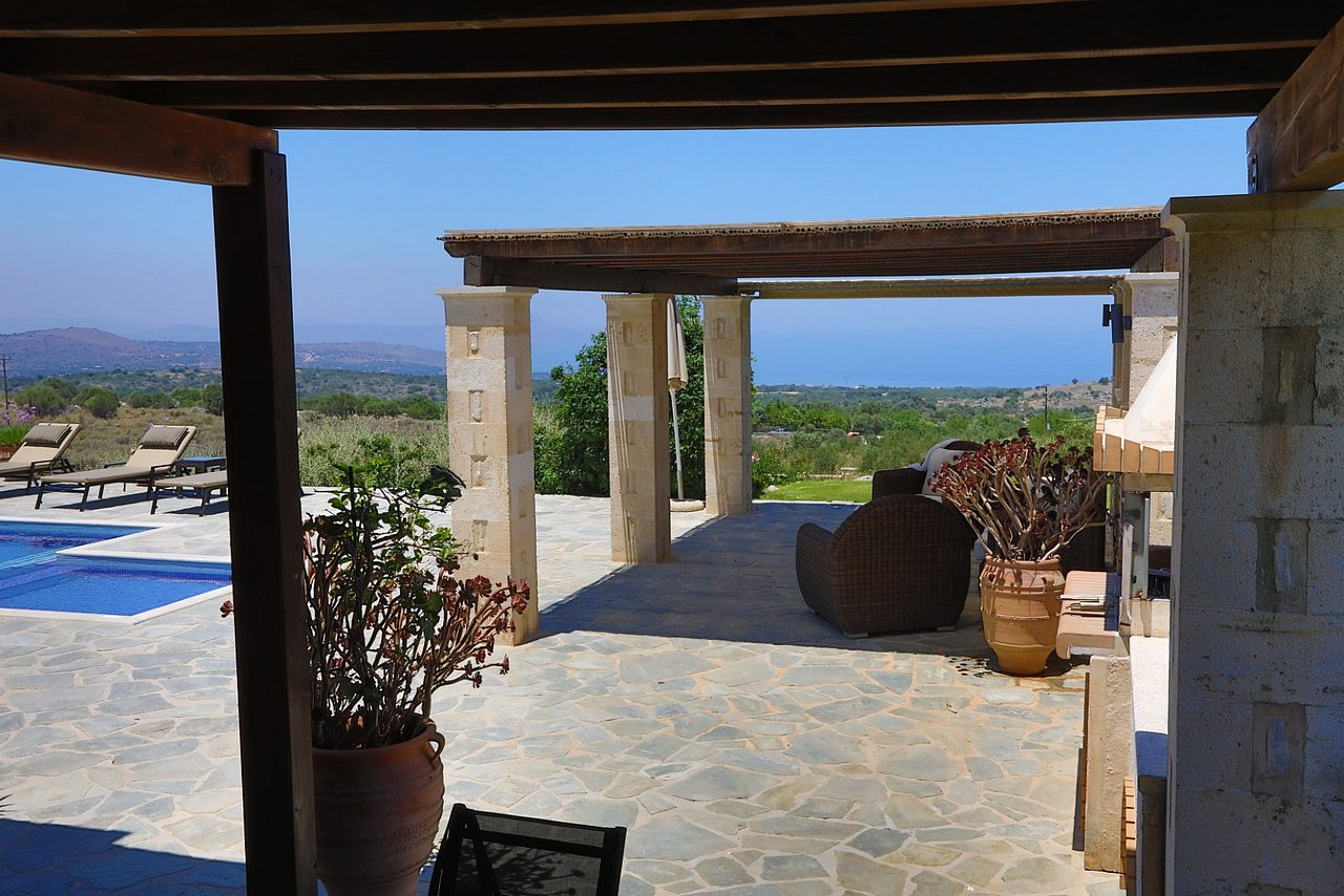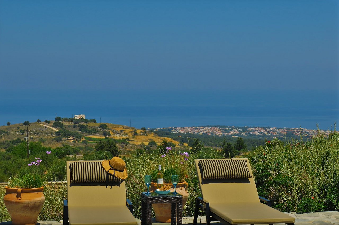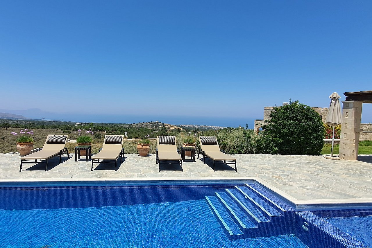 Die Villa liegt auf einem Hügel zwischen Atsipopoulo und Castellos und wurde im traditionellen kretischen Stil aus massivem Stein gebaut. Sie verfügt über einen grandiosen Blick auf die Berge und das Meer, und ist umgeben von einem 4.000qm großen Grundstück mit schönem, mediterranen Garten.