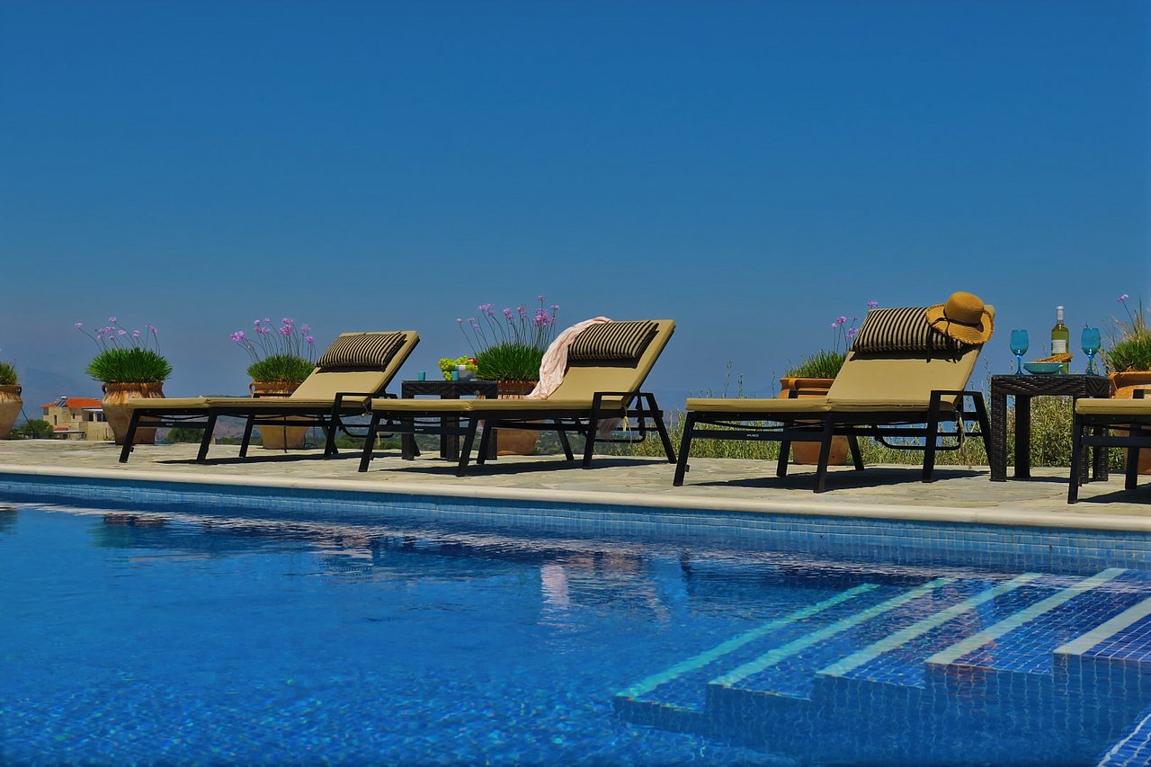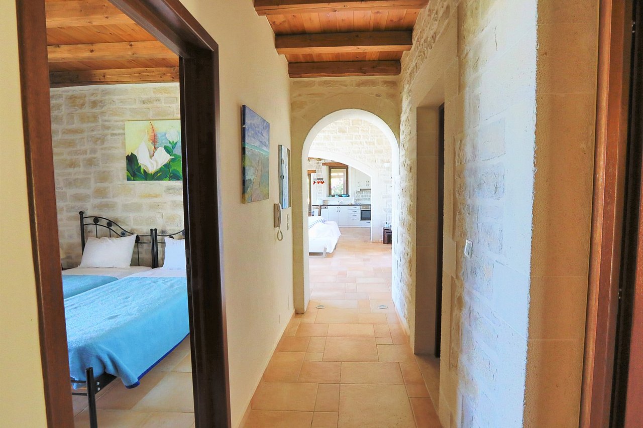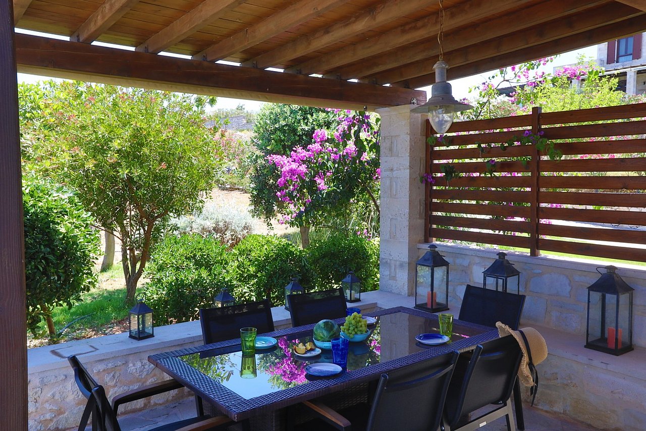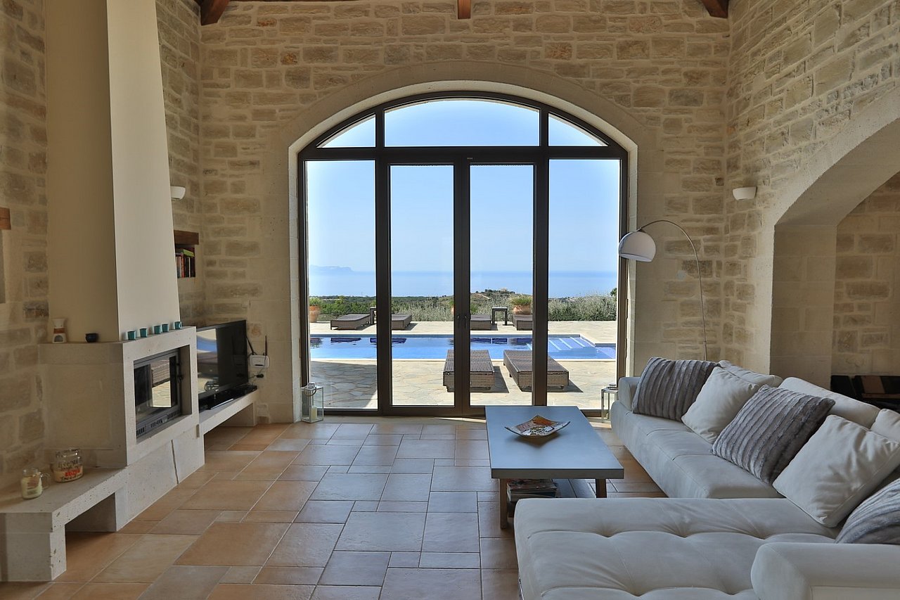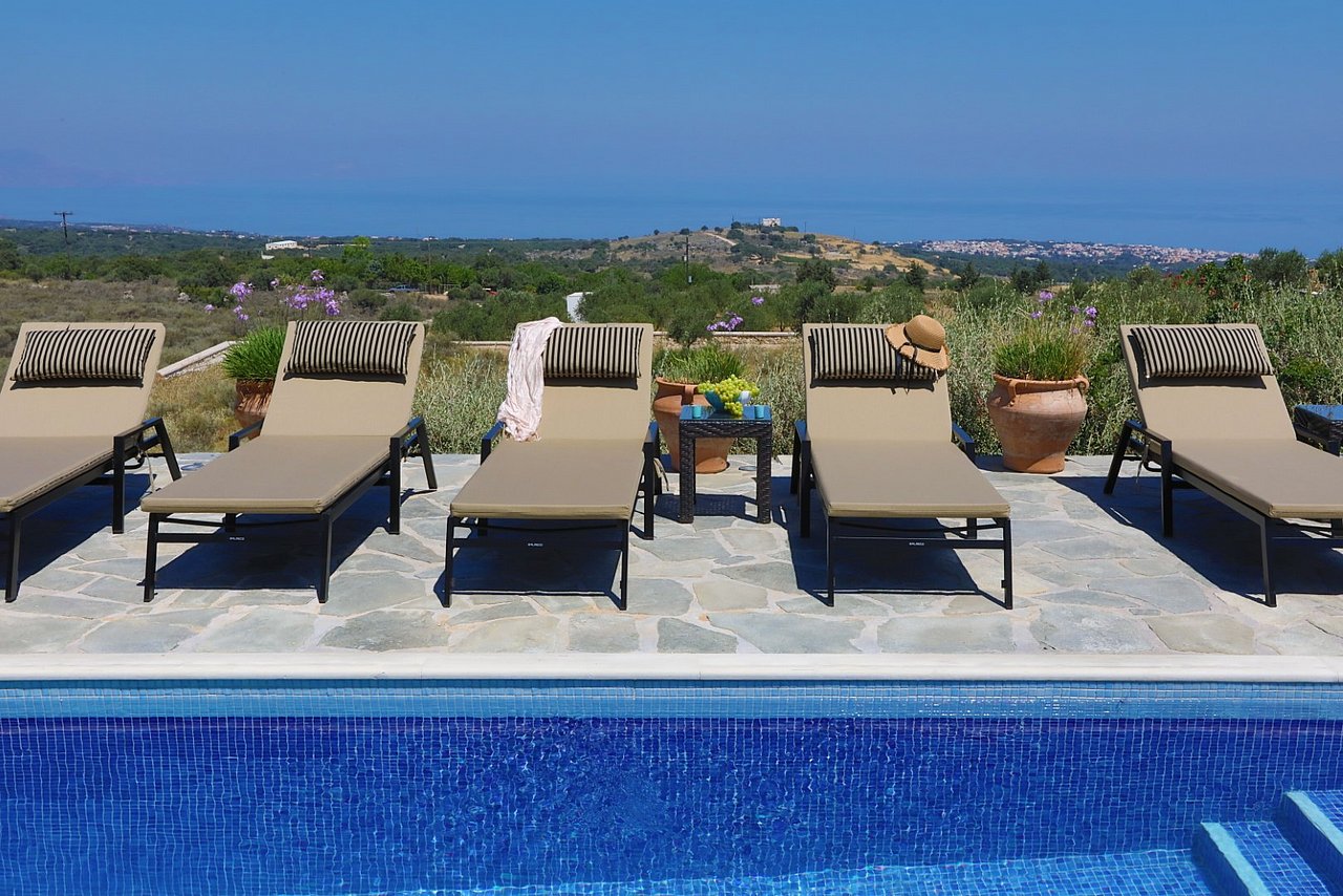 Die Villa liegt auf einem Hügel zwischen Atsipopoulo und Castellos und wurde im traditionellen kretischen Stil aus massivem Stein gebaut. Sie verfügt über einen grandiosen Blick auf die Berge und das Meer, und ist umgeben von einem 4.000qm großen Grundstück mit schönem, mediterranen Garten.