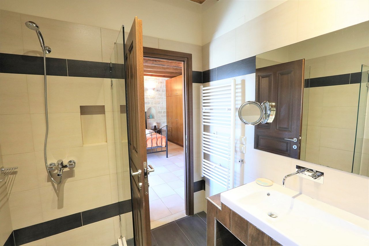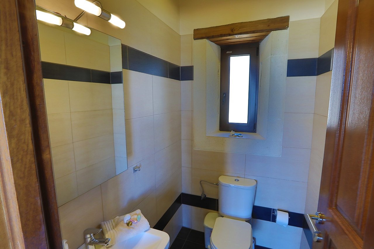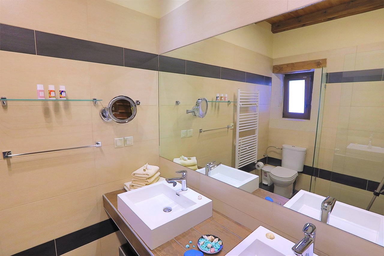 Die Villa verfügt über 3 Schlafzimmer mit handgearbeiteten Betten, sowie 2 Bädern und ein Gäste WC. Ein Schlafzimmer mit Doppelbett und direktem Zugang zum Bad mit großem Waschbecken und Dusche, sowie ein Schlafzimmer mit Doppelbett und ein Schlafzimmer mit 2 Einzelbetten. Das 2. Bad ist vom Flur aus zu erreichen und verfügt über 2 separate Waschbecken und eine Dusche.