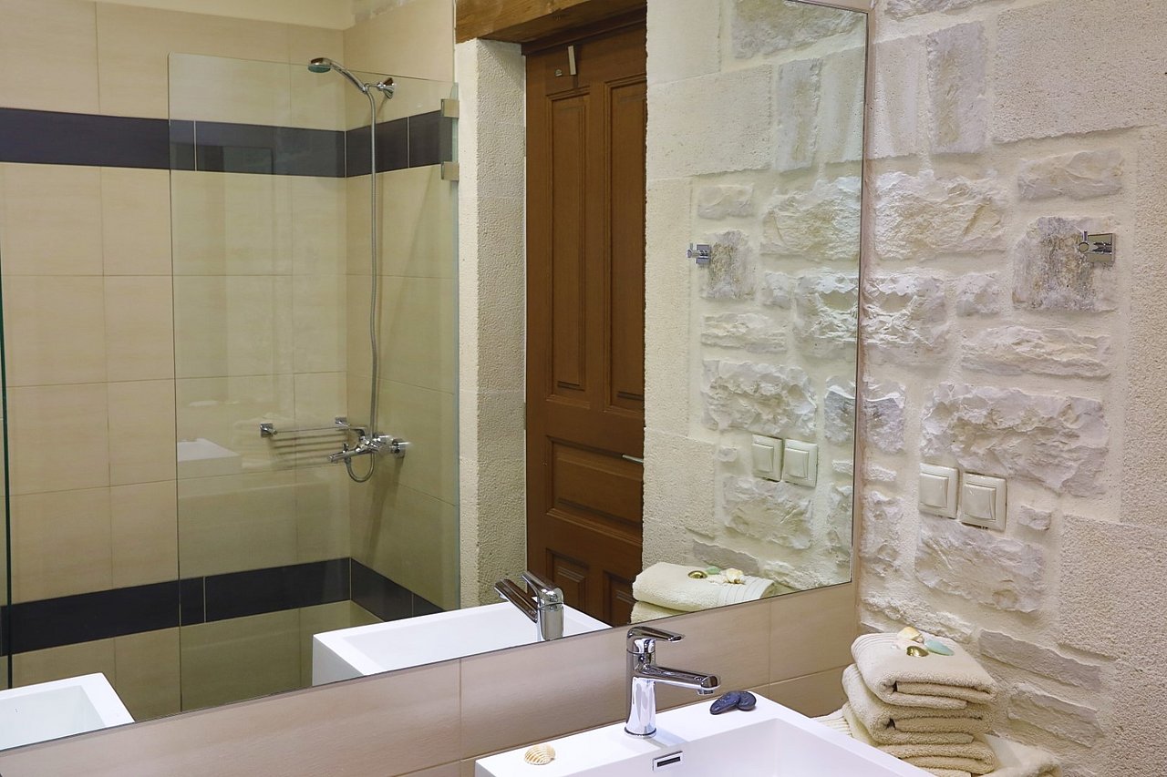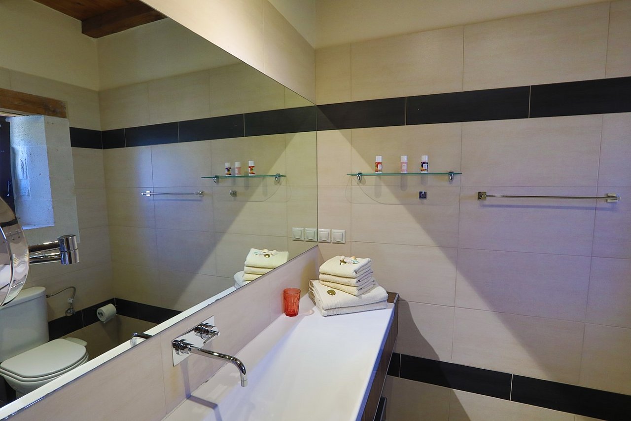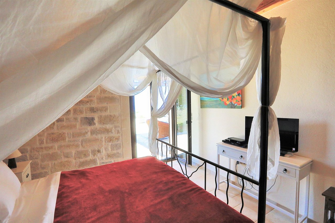 Die Villa verfügt über 3 Schlafzimmer mit handgearbeiteten Betten, sowie 2 Bädern und ein Gäste WC. Ein Schlafzimmer mit Doppelbett und direktem Zugang zum Bad mit großem Waschbecken und Dusche, sowie ein Schlafzimmer mit Doppelbett und ein Schlafzimmer mit 2 Einzelbetten. Das 2. Bad ist vom Flur aus zu erreichen und verfügt über 2 separate Waschbecken und eine Dusche.
