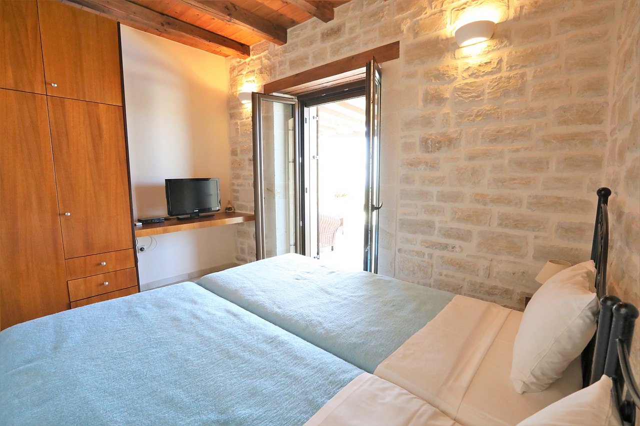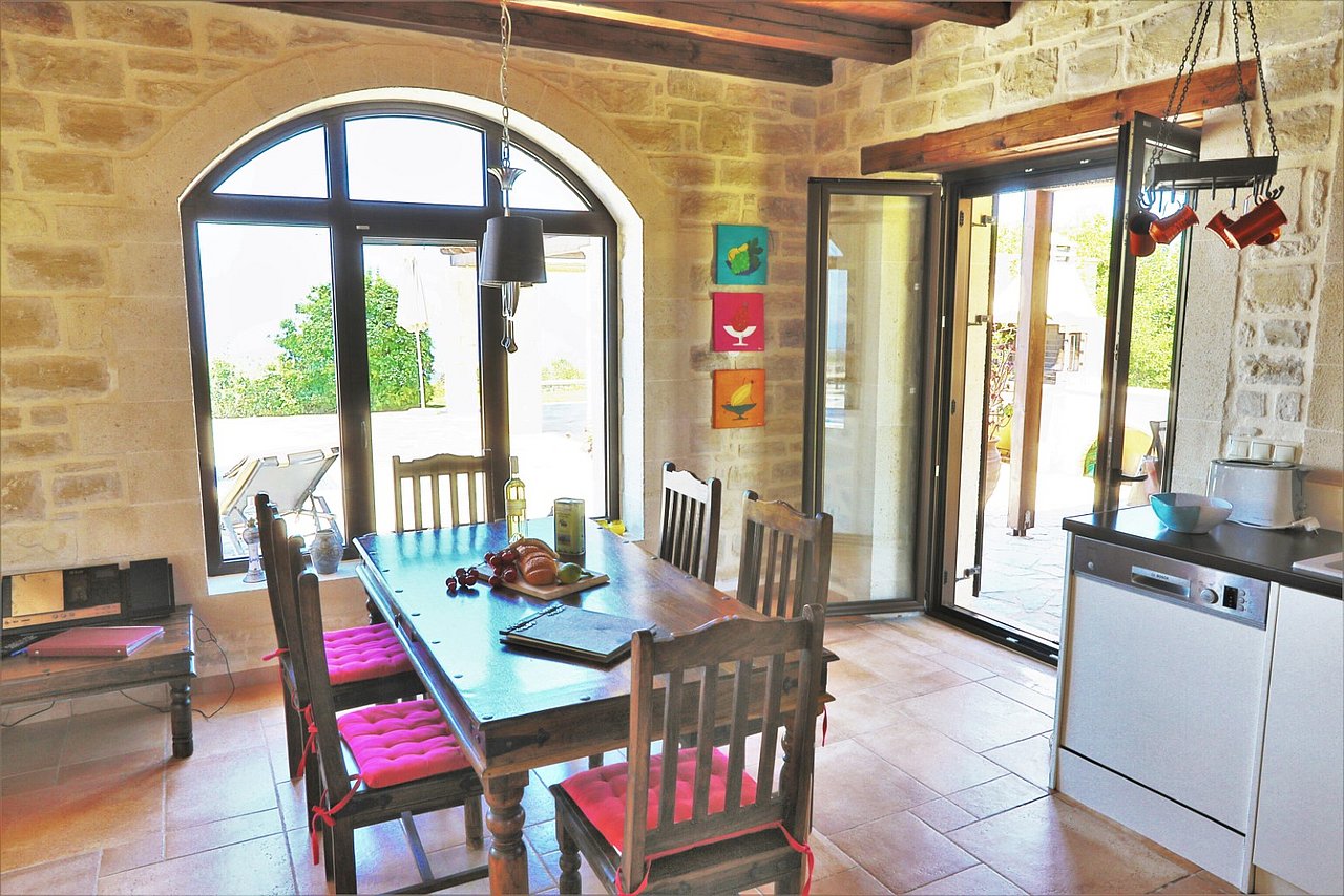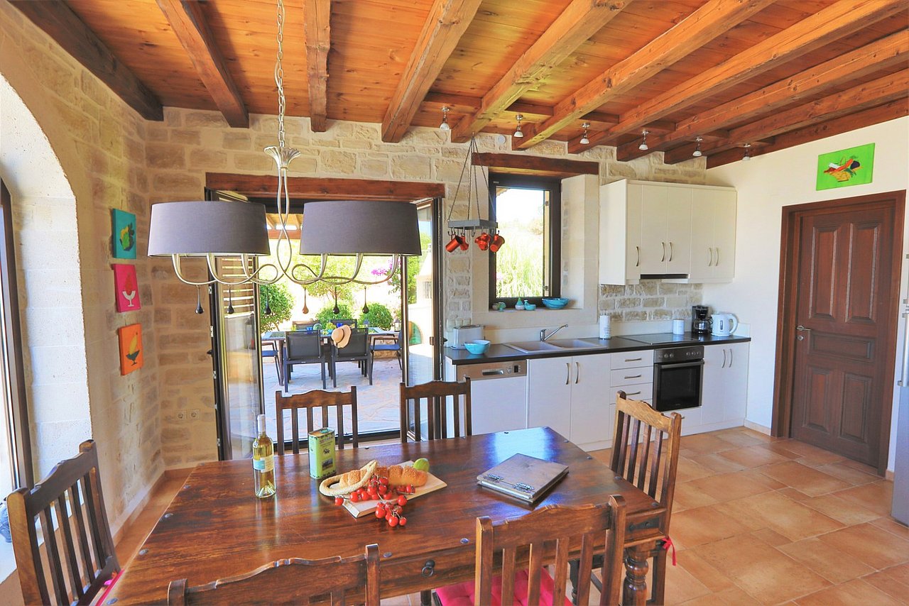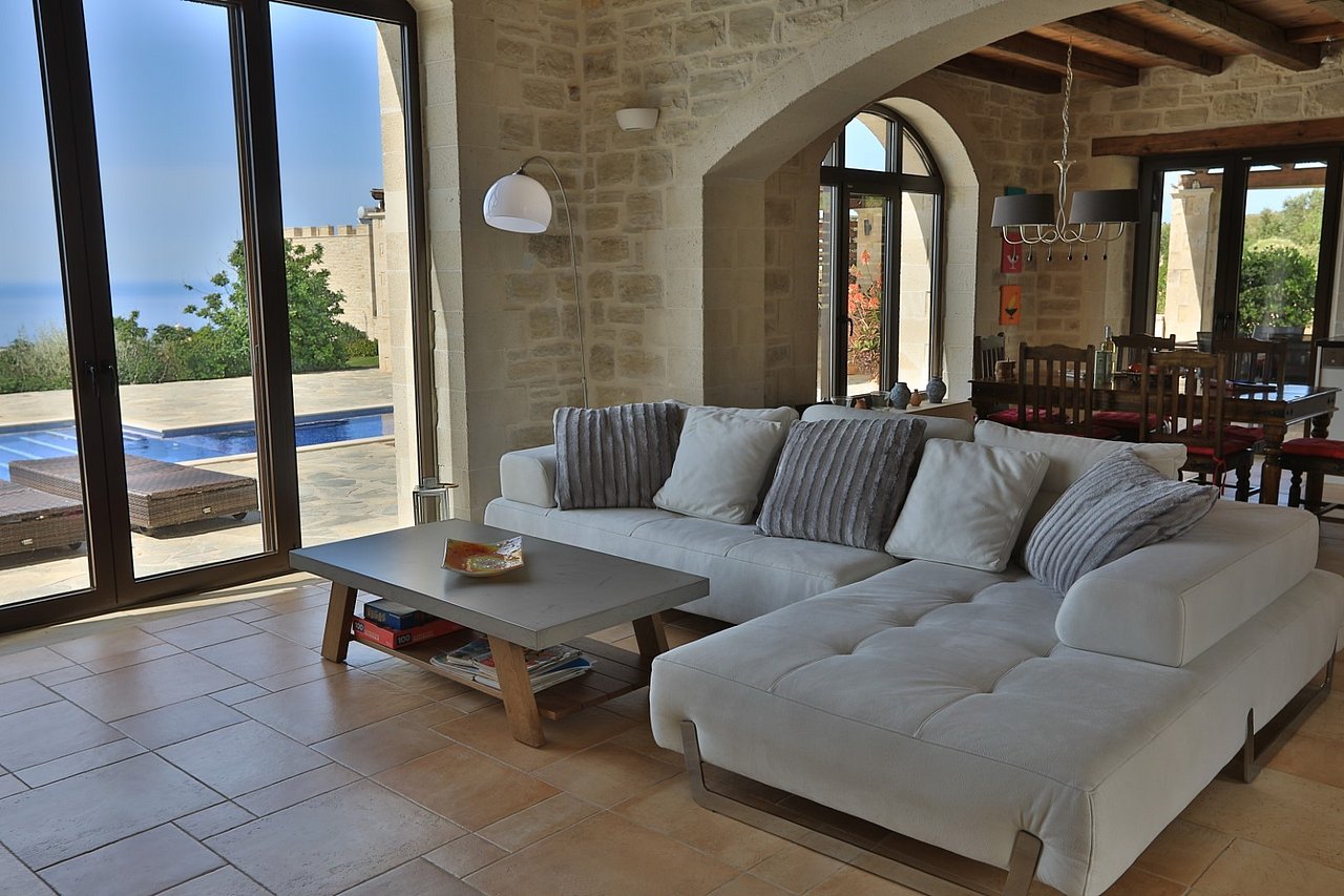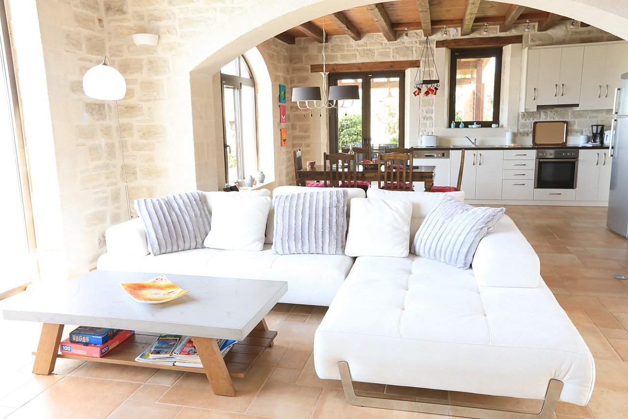 Der großzügige Wohnbereich ist das Herzstück der Villa, denn vom Eingang breitet sich ein unbeschreiblicher Blick auf das Meer aus, welches man durch die großen Panoramafenster aus sieht. Die hohe Decke mit Holzbalken unterstreicht die Weite und Großzügigkeit, genau wie die 2 Rundbögen, die den Wohnbereich von Küche und Schlafzimmer trennen. Die Villa wurde mit viel Liebe zum Detail eingerichtet.