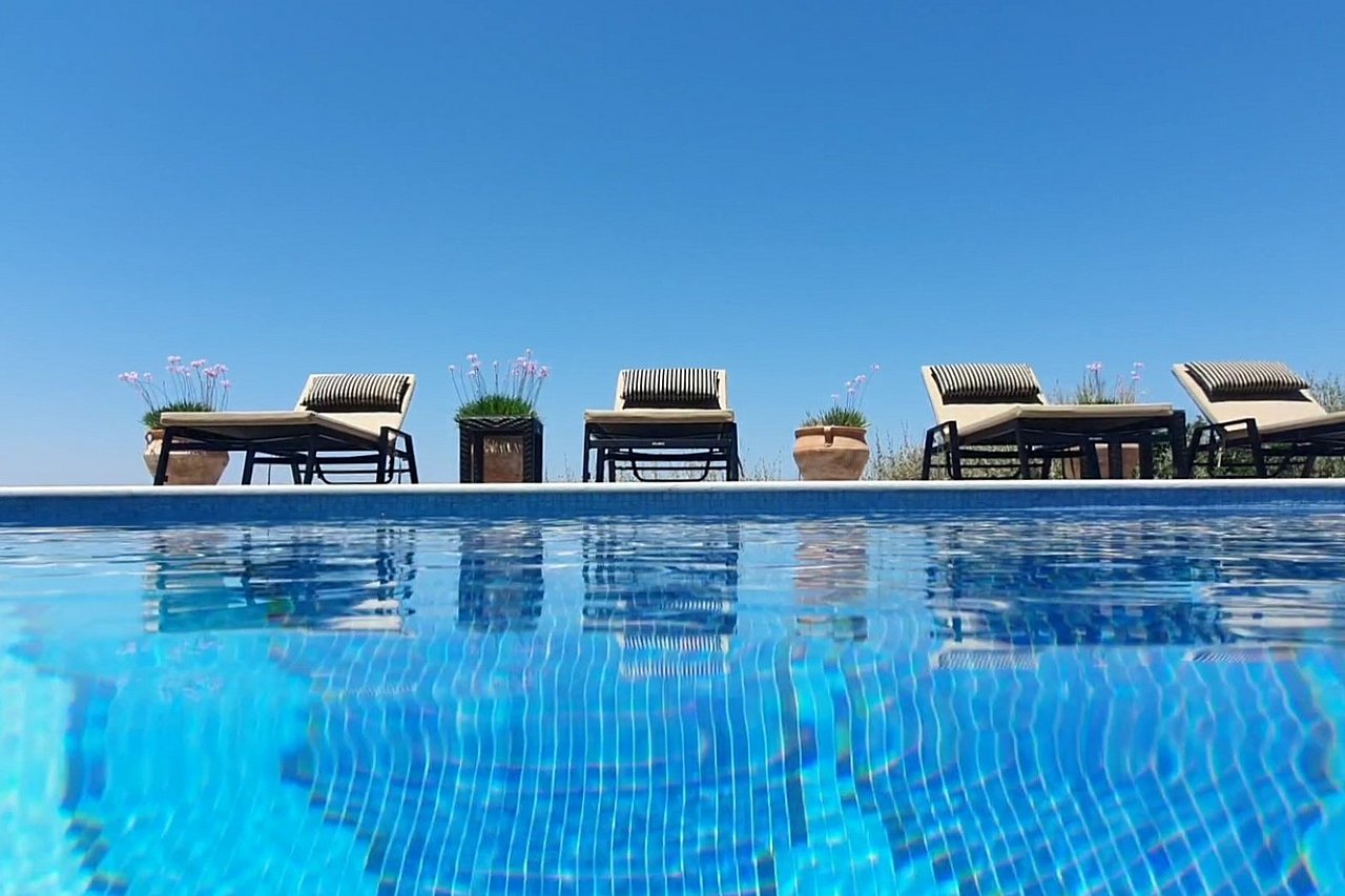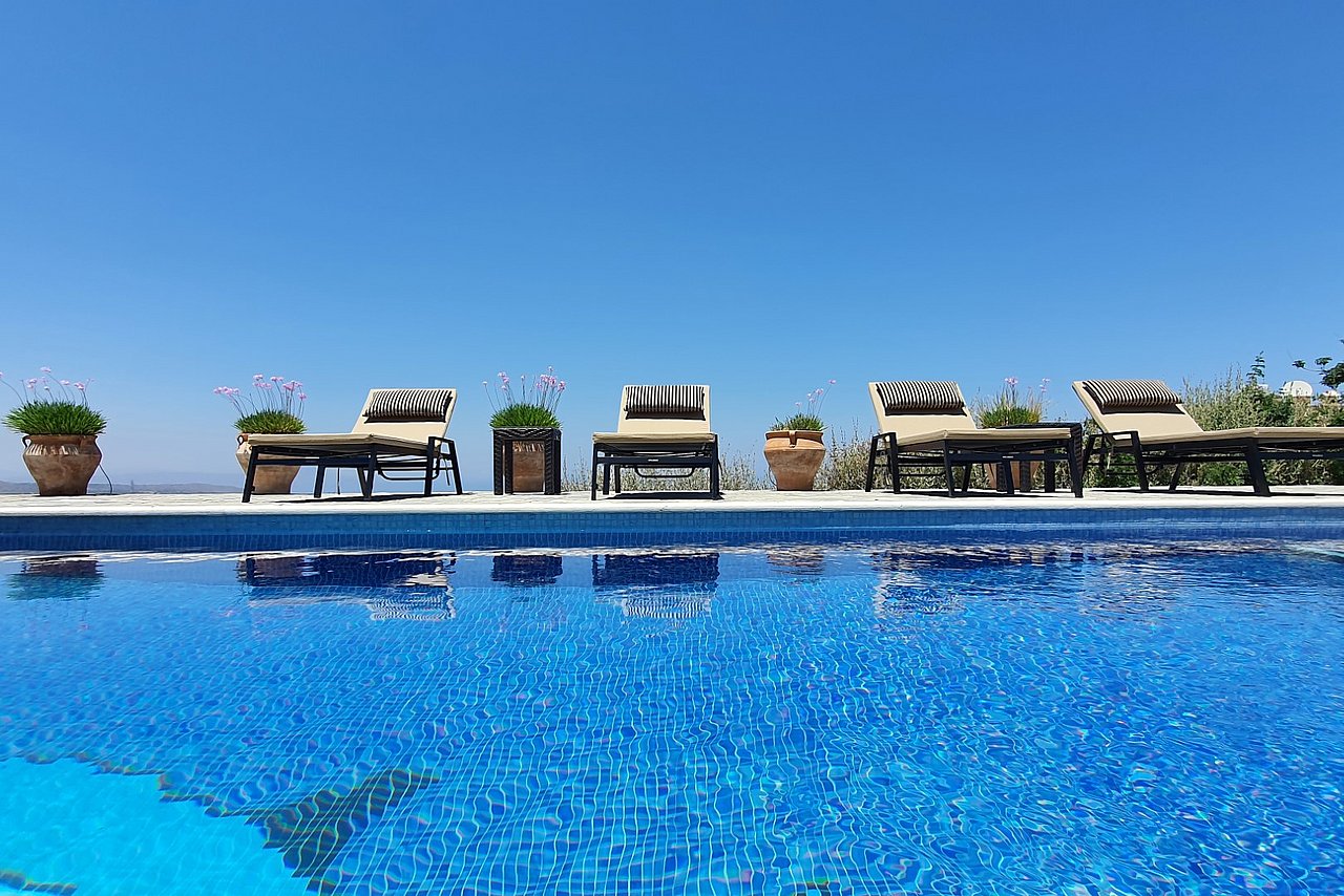 Der großzügige Außenbereich verfügt über 2 überdachte Schattenplätze, sowie einen beheizbaren 4 x 8m Pool plus abgesetztem Kinderbecken, alles mit Meerblick.