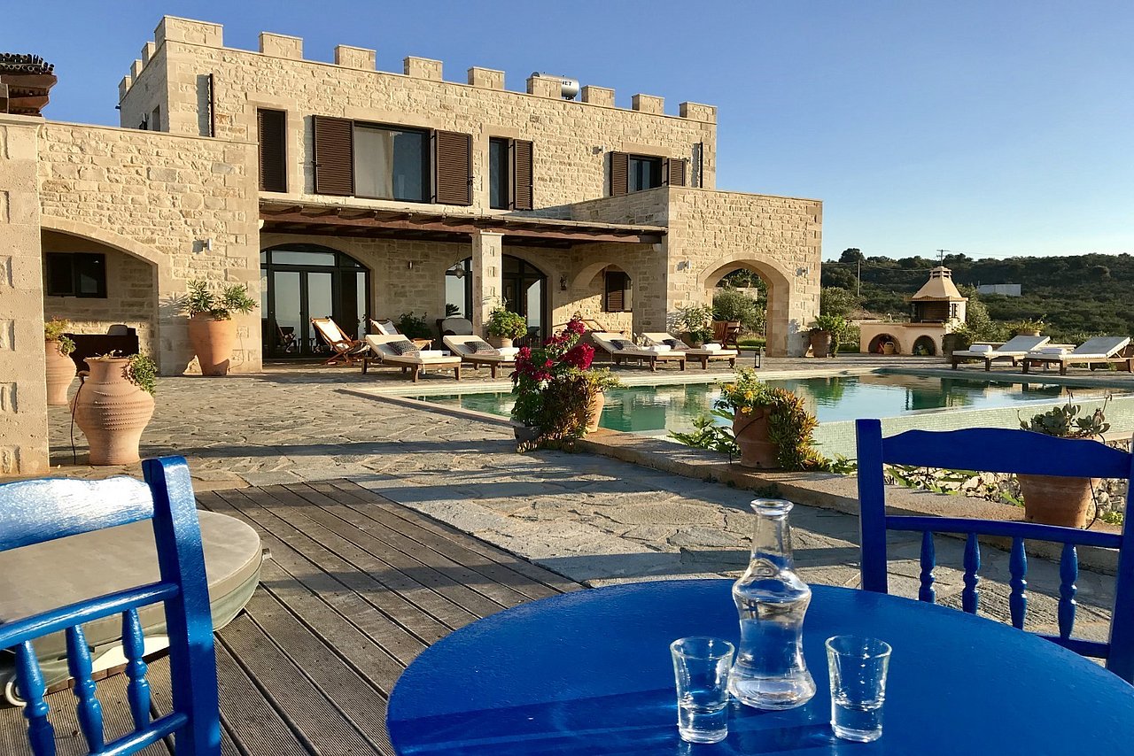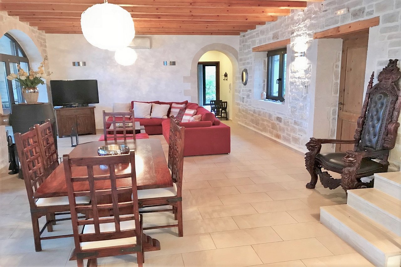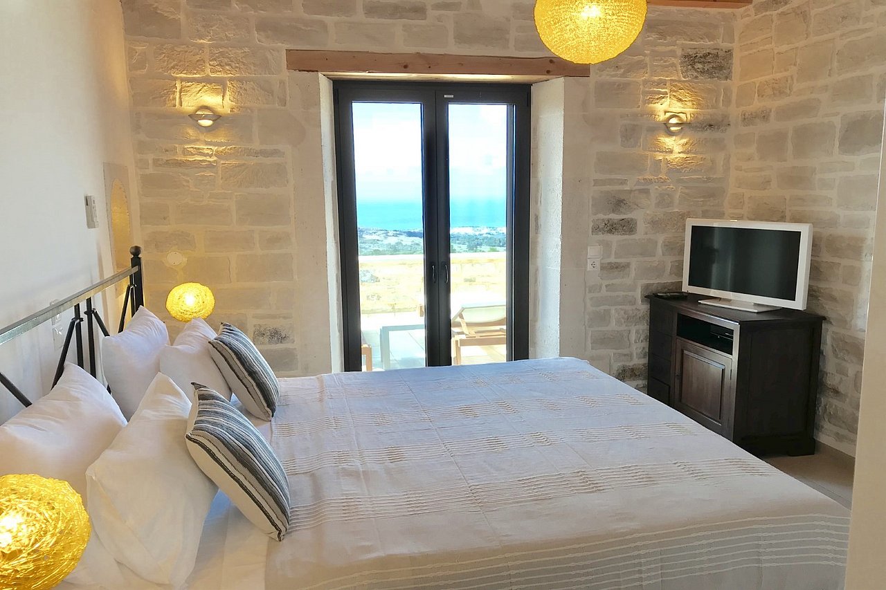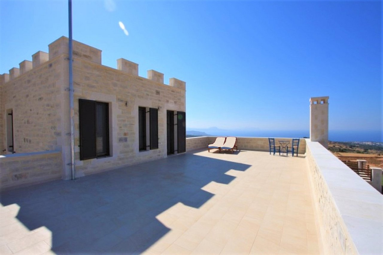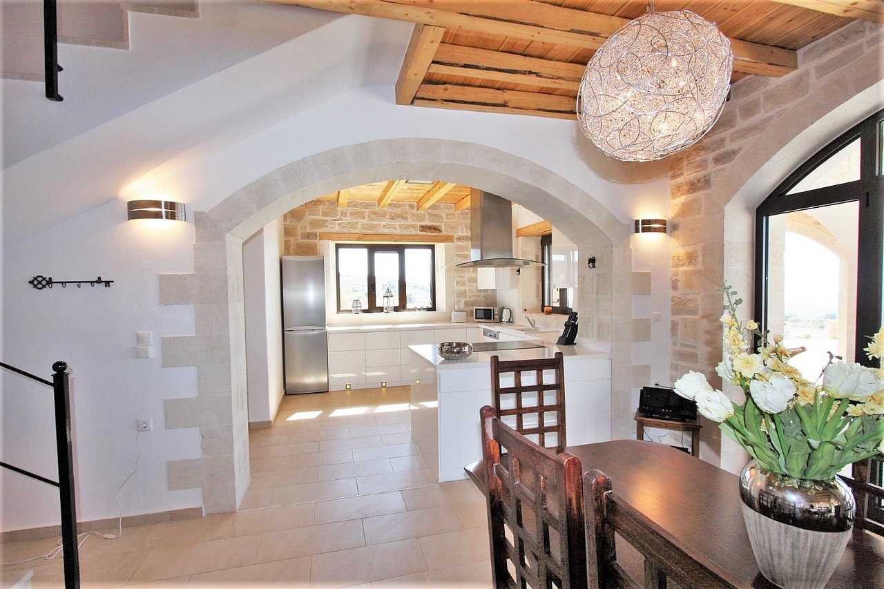 Auf einer Bergkuppe, ca. 3 Km vom Dorf Prines entfernt, thront diese extravagante 240qm-Luxusvilla mit atemberaubenden Weitblick auf Meer und Berge. Mit viel Gespür für Design und Stil wurde hier 2013 ein außergewöhnliches Anwesen in Natur-Steinbauweise erschaffen, das seines Gleichen auf Kreta sucht. Die Idee des Architekten war es, ein traditionelles kretisches Steinhaus mit venezianischen Einflüssen zu kombinieren, das an die Sommervillen des 16. Jahrhunderts auf Kreta erinnert.