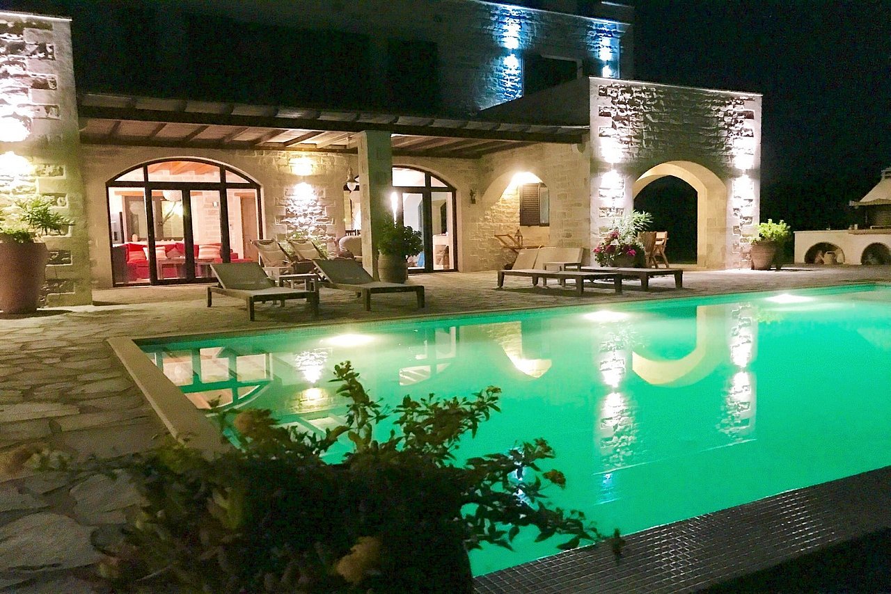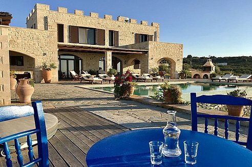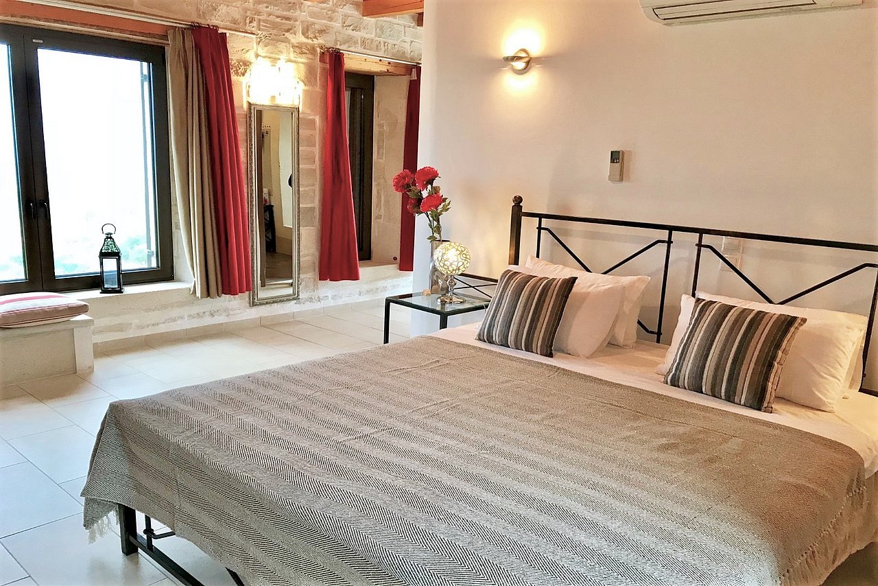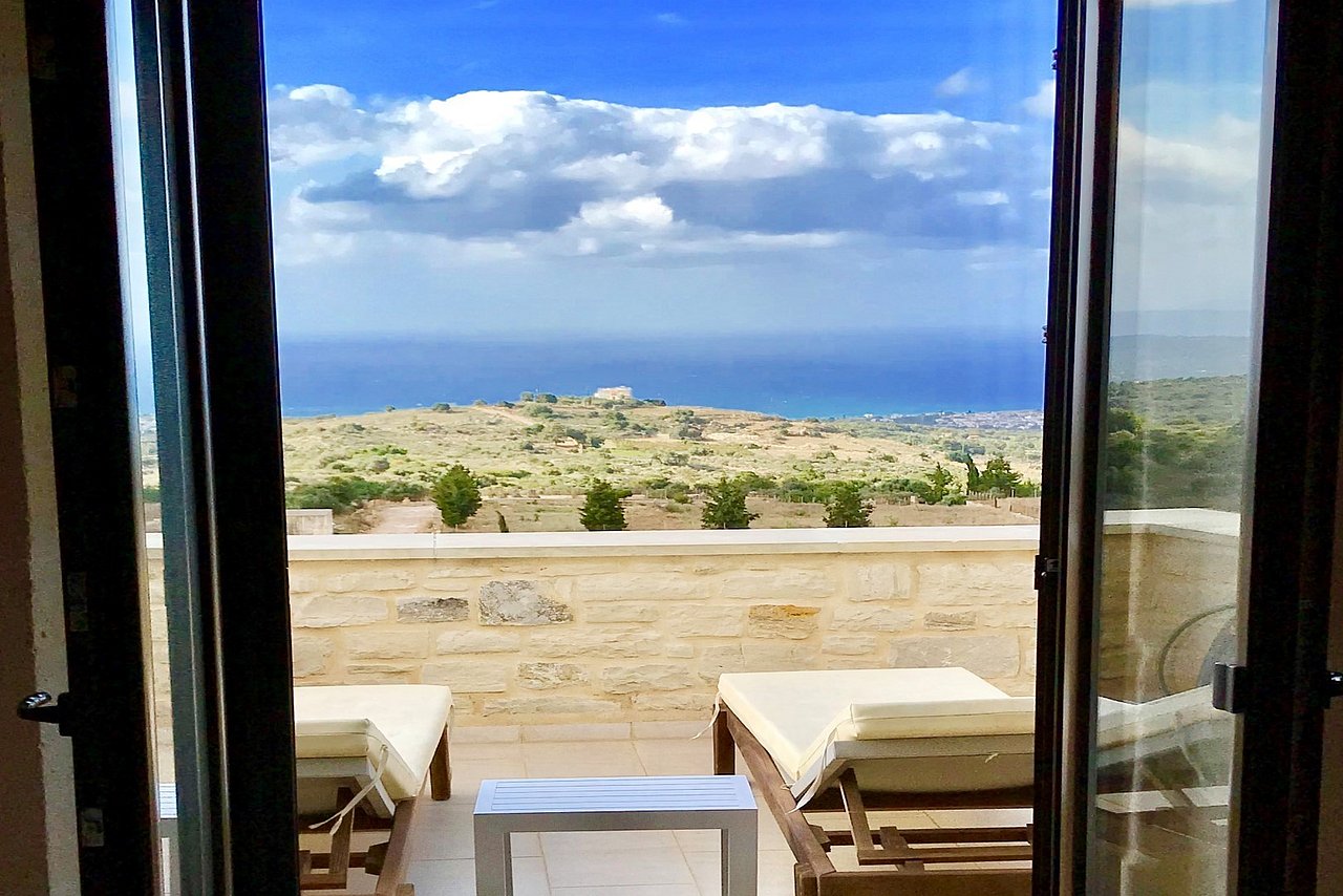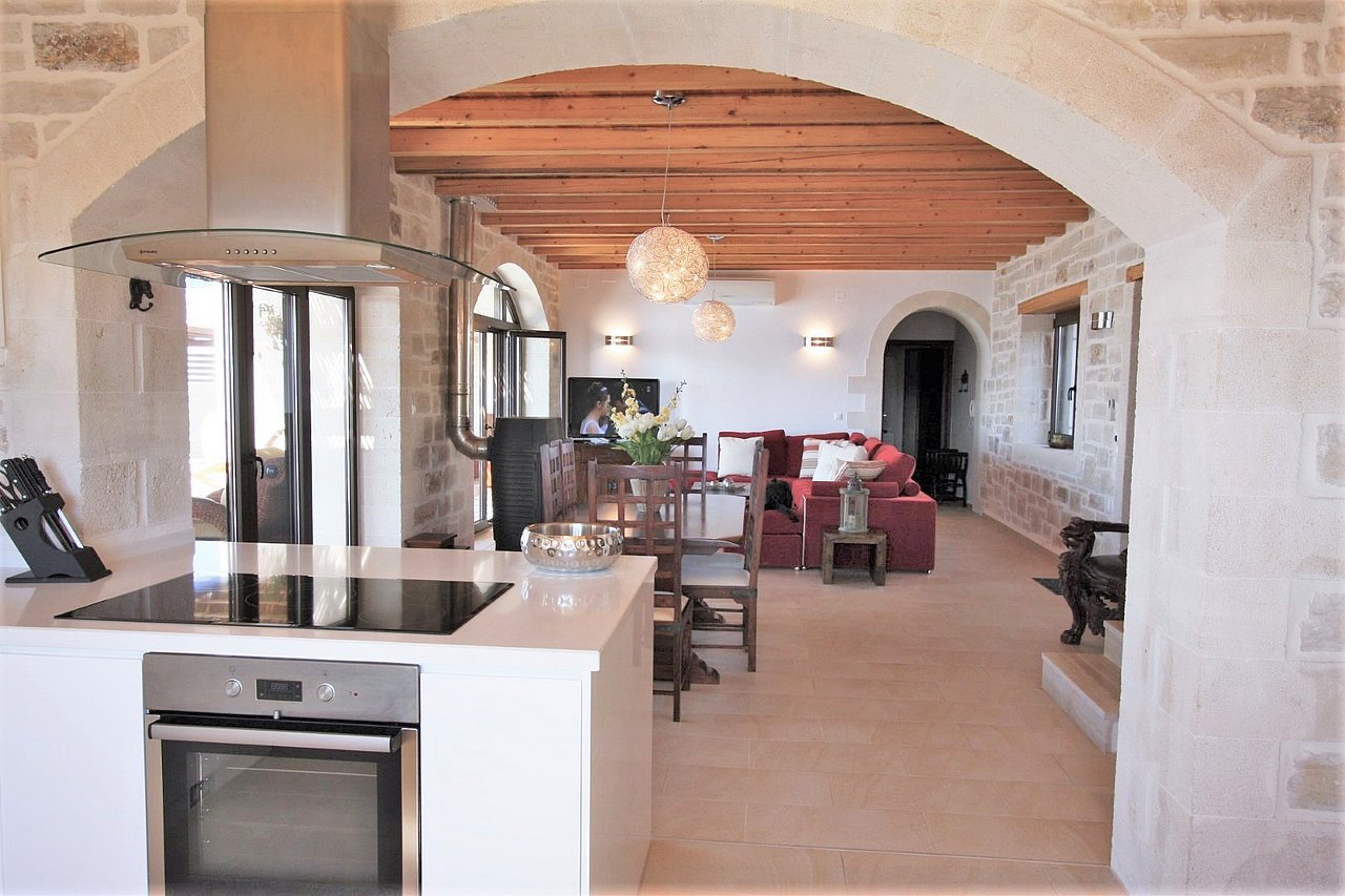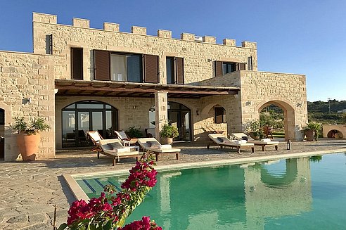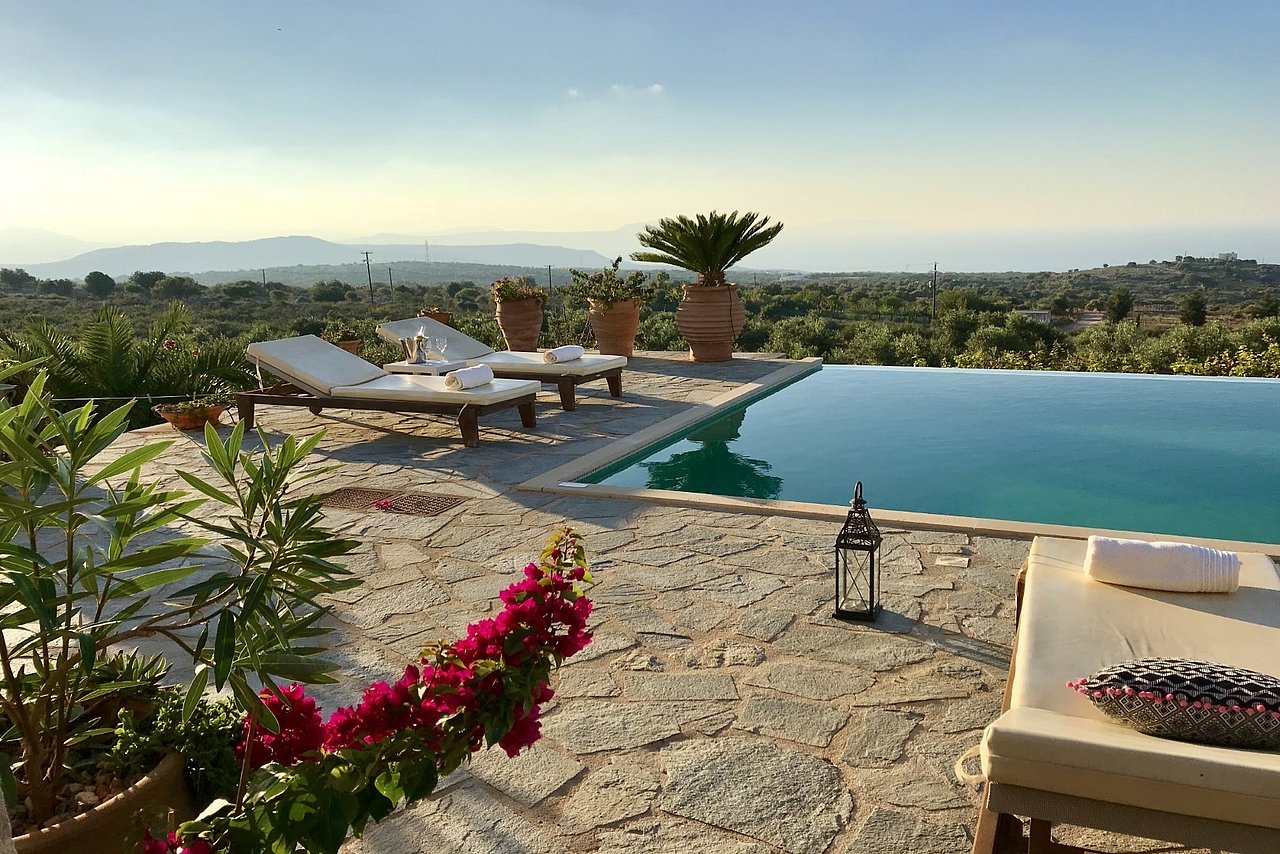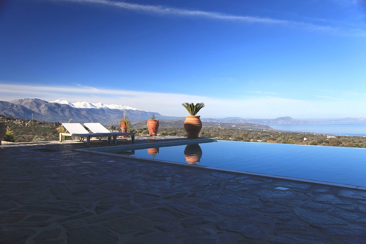 Auf einer Bergkuppe, ca. 3 Km vom Dorf Prines entfernt, thront diese extravagante 240qm-Luxusvilla mit atemberaubenden Weitblick auf Meer und Berge. Mit viel Gespür für Design und Stil wurde hier 2013 ein außergewöhnliches Anwesen in Natur-Steinbauweise erschaffen, das seines Gleichen auf Kreta sucht. Die Idee des Architekten war es, ein traditionelles kretisches Steinhaus mit venezianischen Einflüssen zu kombinieren, das an die Sommervillen des 16. Jahrhunderts auf Kreta erinnert.