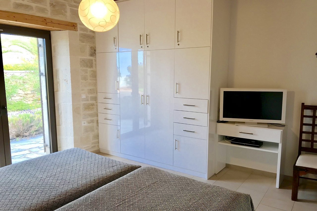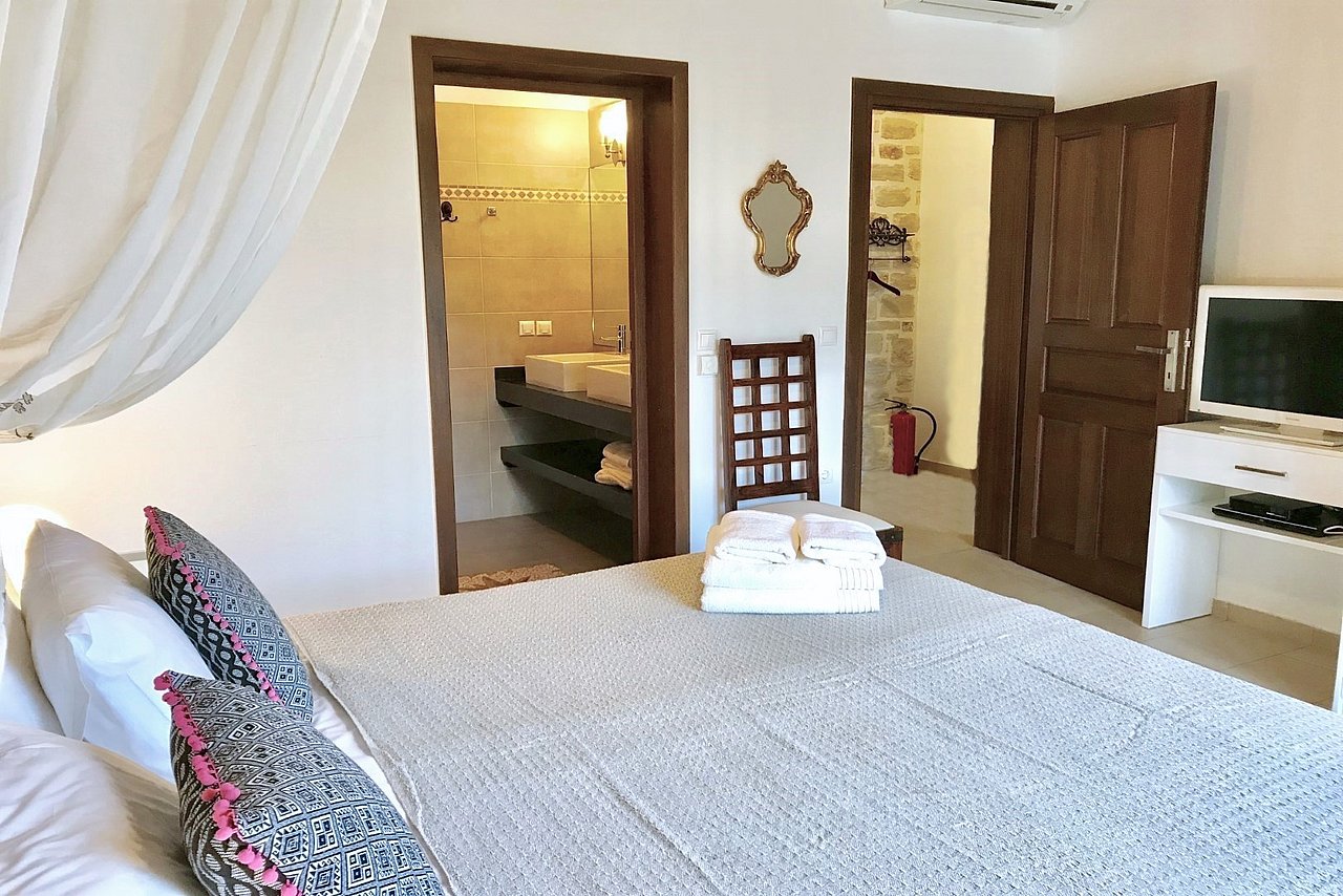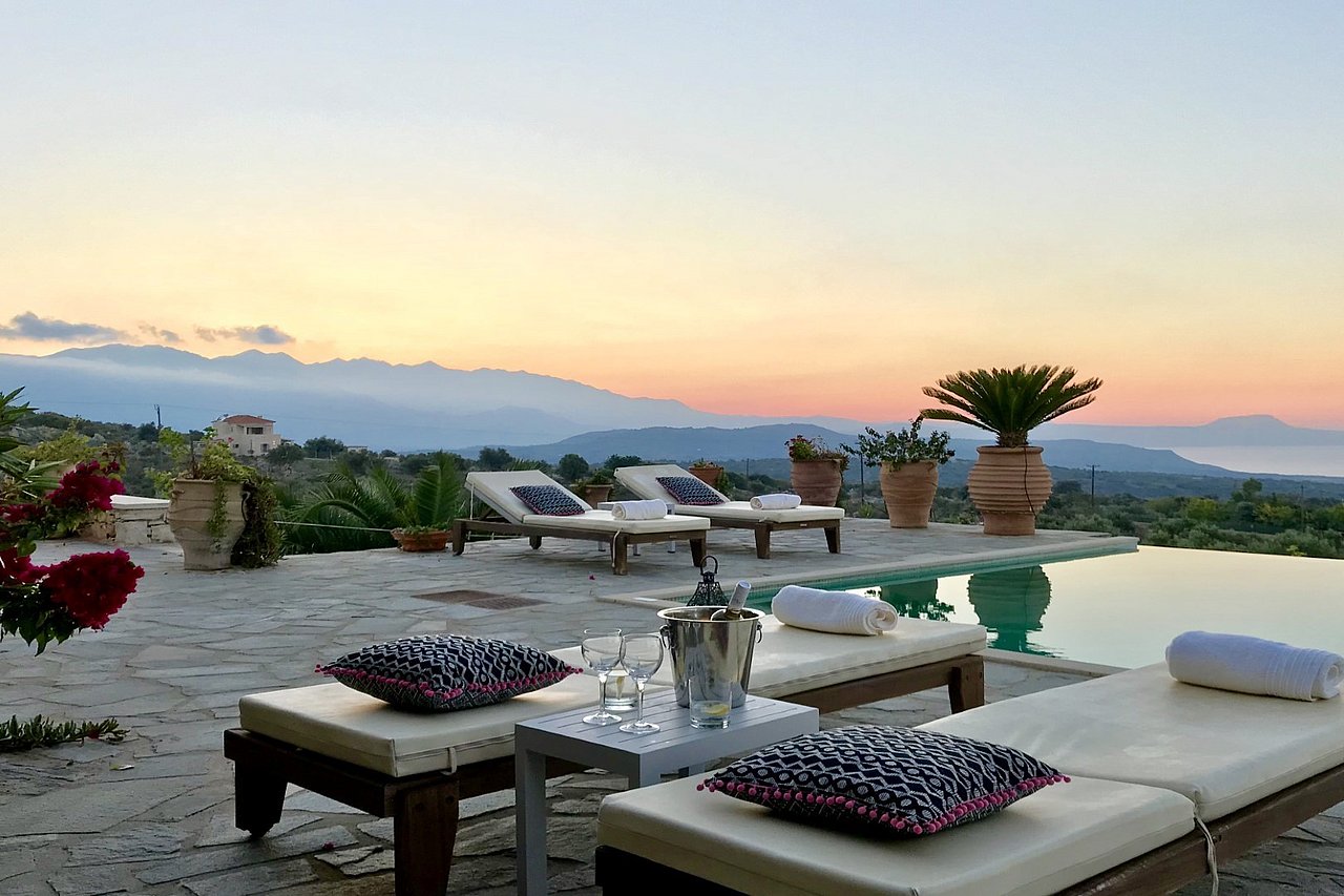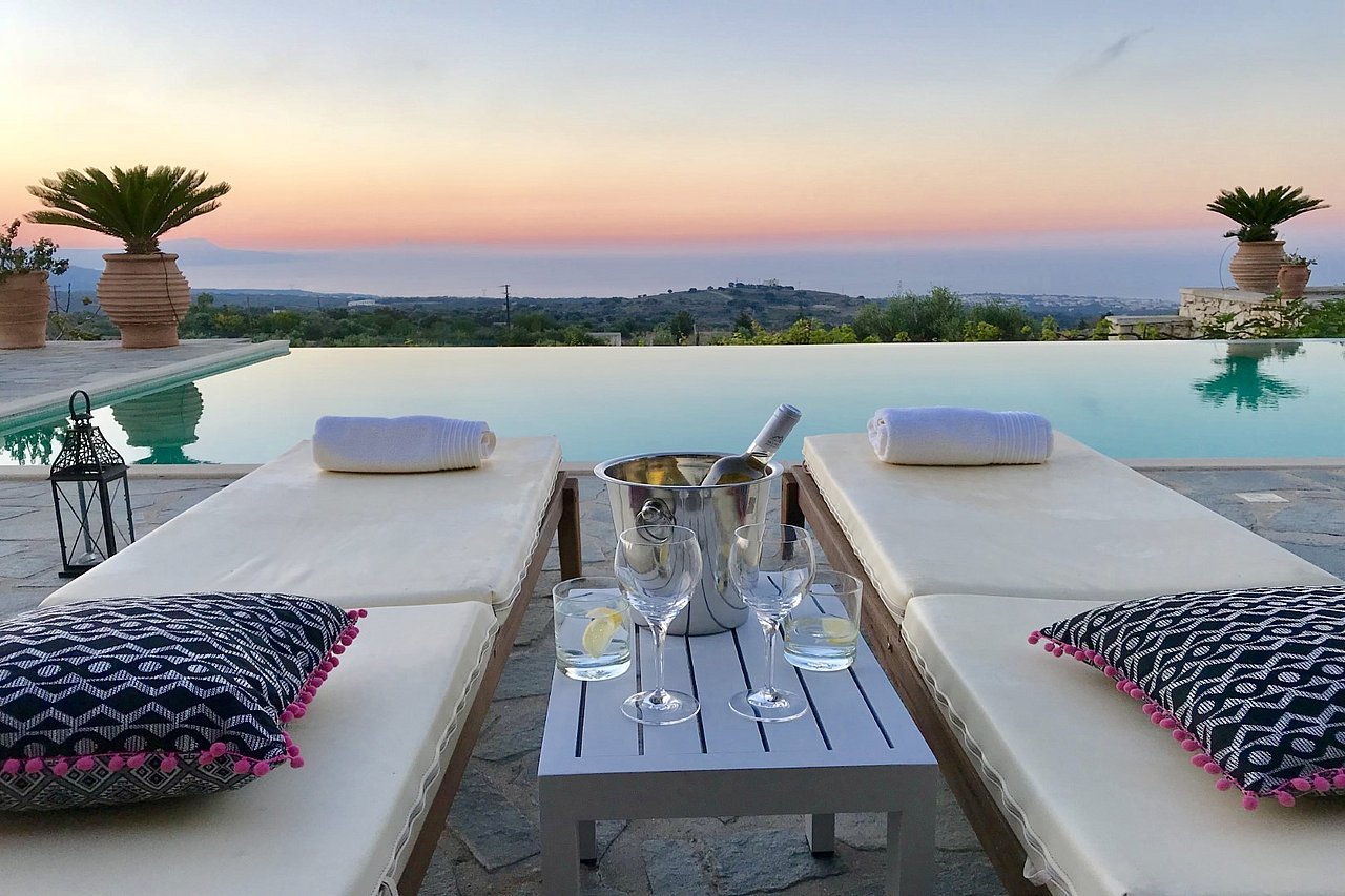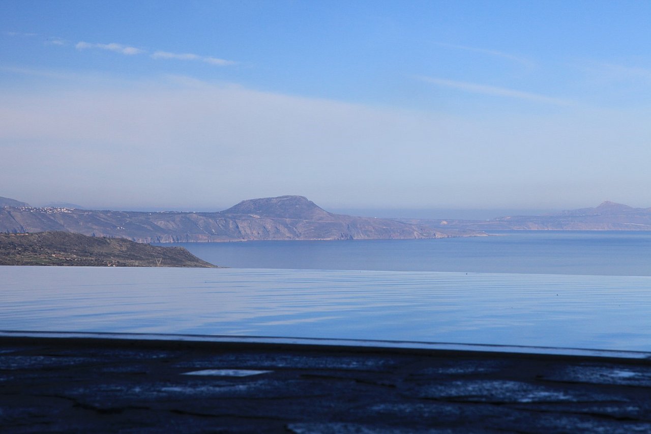 Im Hintergrund plätschert leise ein Venezianischer Brunnen für Sie, der dem berühmten Rimondi-Brunnen aus der Provinzhauptstadt Rethymnon nachempfunden ist. Durch die verzierte Eichenholztür betreten Sie den großzügigen Wohnraum und durch die hohen Panoramabögen öffnet sich für Sie ein unvergesslicher Blick über den Infinitypool, der mit Meer und Landschaft zu verschmelzen scheint. Von der modernen offenen Küche aus wird Ihr Blick abwechselnd auf die Weißen Berge im Westen und das Meer im Norden schweifen– entscheiden Sie selbst, was reizvoller ist.