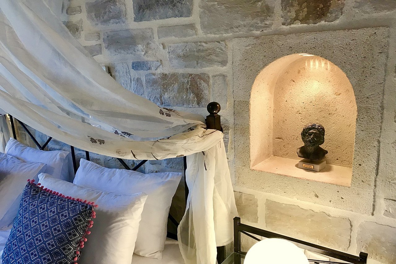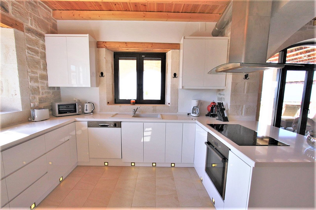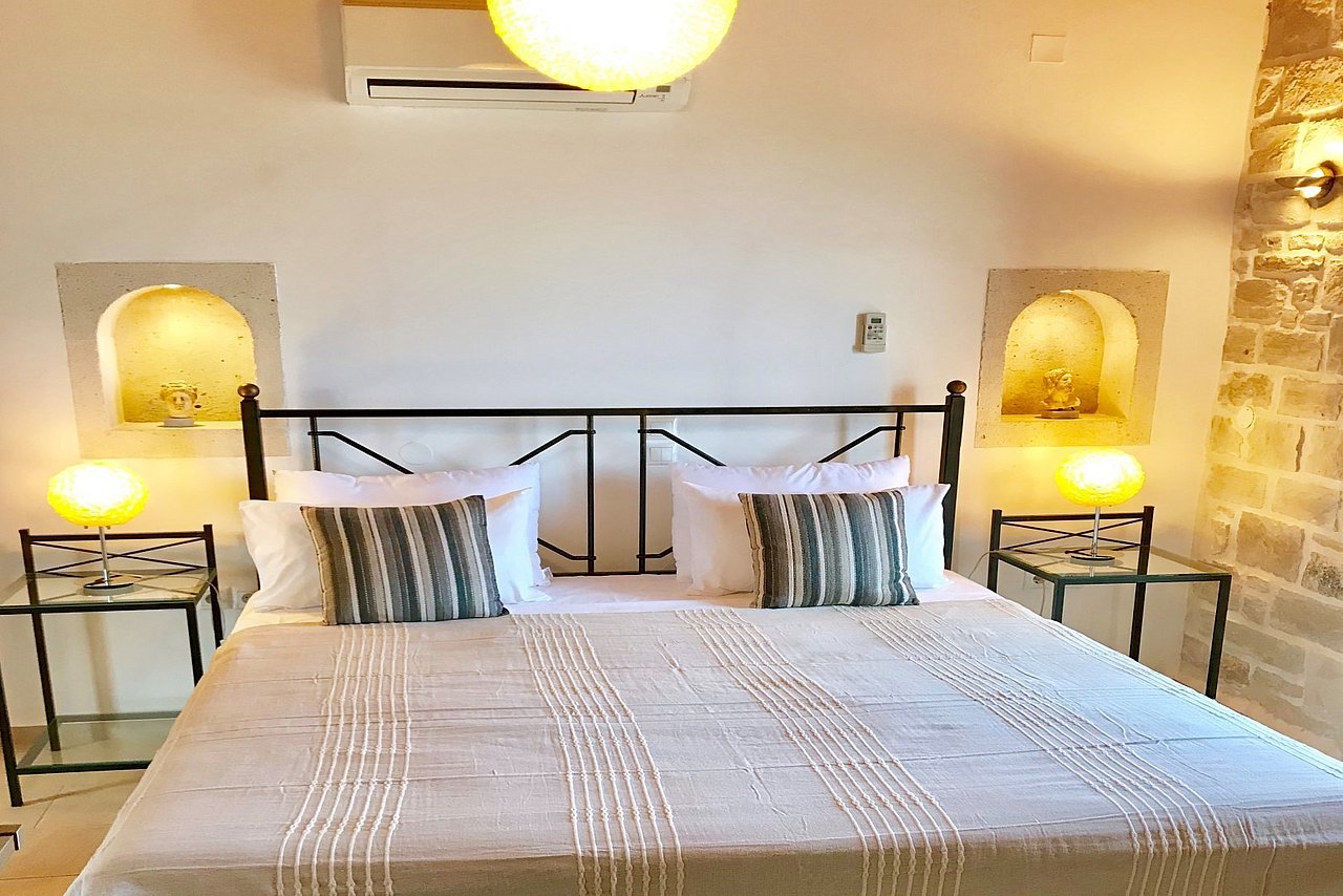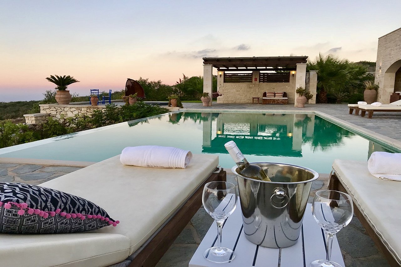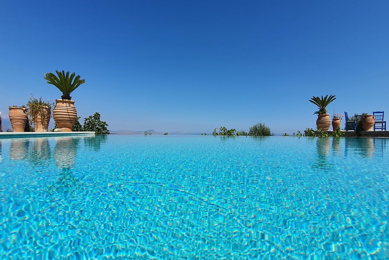 Im Hintergrund plätschert leise ein Venezianischer Brunnen für Sie, der dem berühmten Rimondi-Brunnen aus der Provinzhauptstadt Rethymnon nachempfunden ist. Durch die verzierte Eichenholztür betreten Sie den großzügigen Wohnraum und durch die hohen Panoramabögen öffnet sich für Sie ein unvergesslicher Blick über den Infinitypool, der mit Meer und Landschaft zu verschmelzen scheint. Von der modernen offenen Küche aus wird Ihr Blick abwechselnd auf die Weißen Berge im Westen und das Meer im Norden schweifen– entscheiden Sie selbst, was reizvoller ist.
