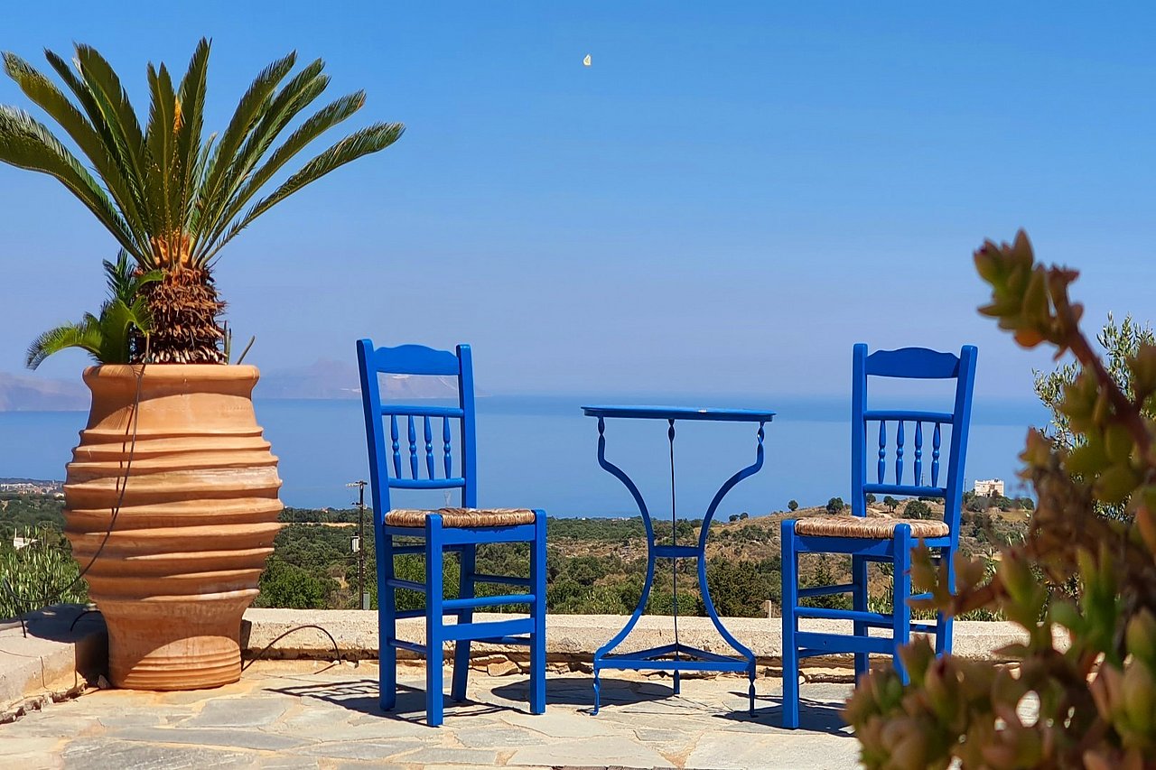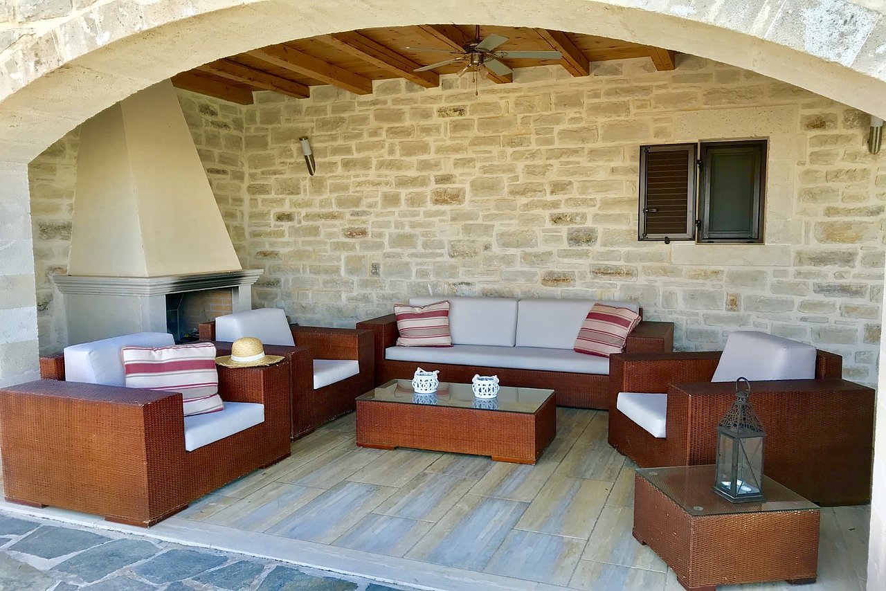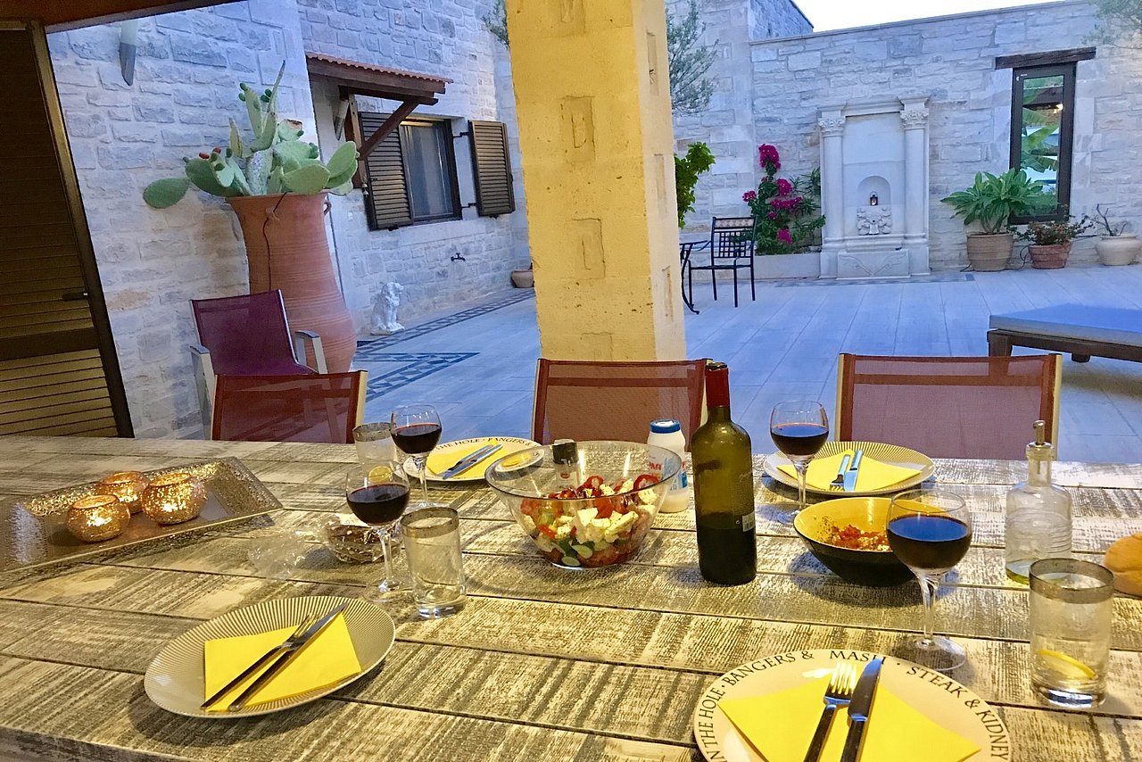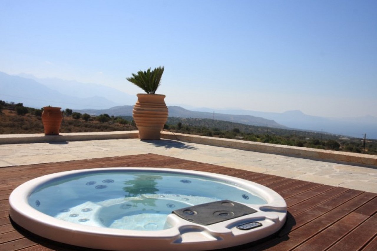 Ausgesucht bequeme und hochwertige Möbel im Haus, im Atrium und auf der Panoramaterrasse bieten Relaxmöglichkeiten für bis zu 8 Personen. Genießen Sie vom beheiztem Jacuzzi (ohne Sprudelfunktion ) aus die blutroten Sonnenutergänge und freuen Sie sich auf kühle Drinks unter dem großen Schatten spendenden Pool-Deck. Und wenn Sie sich satt gesehen haben am grenzenlosen Meerblick sind wir sicher, dass der malerische Innenhof einen ganz besonderen Zauber auf Sie ausüben wird. Ob eine verträumte Siesta auf dem großen kretischen Holzsofa oder ein abendliches Grillfest mit Freunden und Familie an der großen Tafel unterm Sternenhimmel. Das Atrium bietet Ihnen alle Optionen: Sonne, Schatten und bei Bedarf auch Schutz vor Wind und – theoretisch – sogar vor einem Regenschauer.