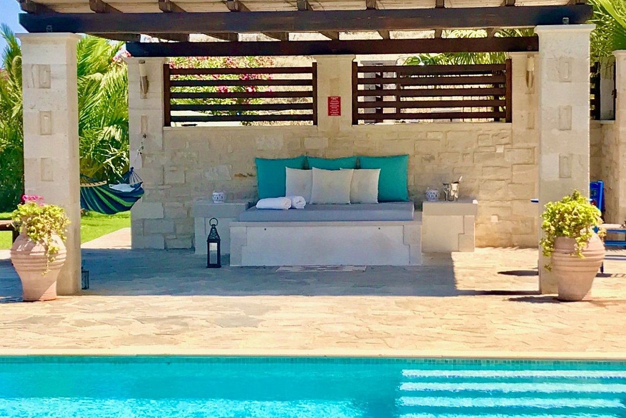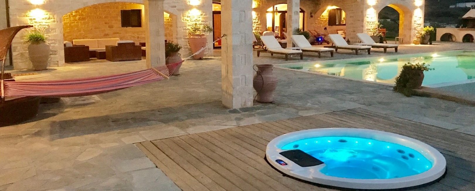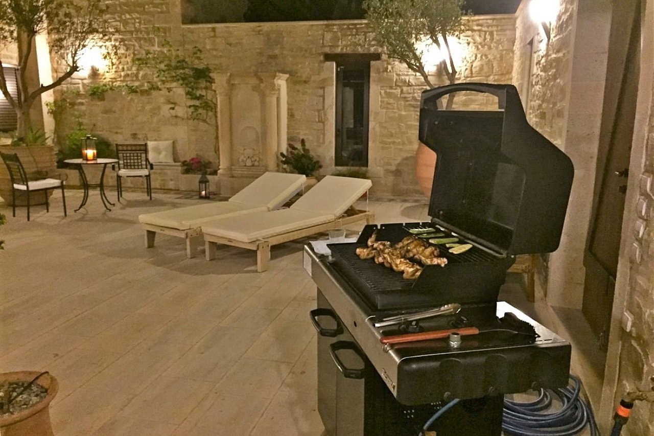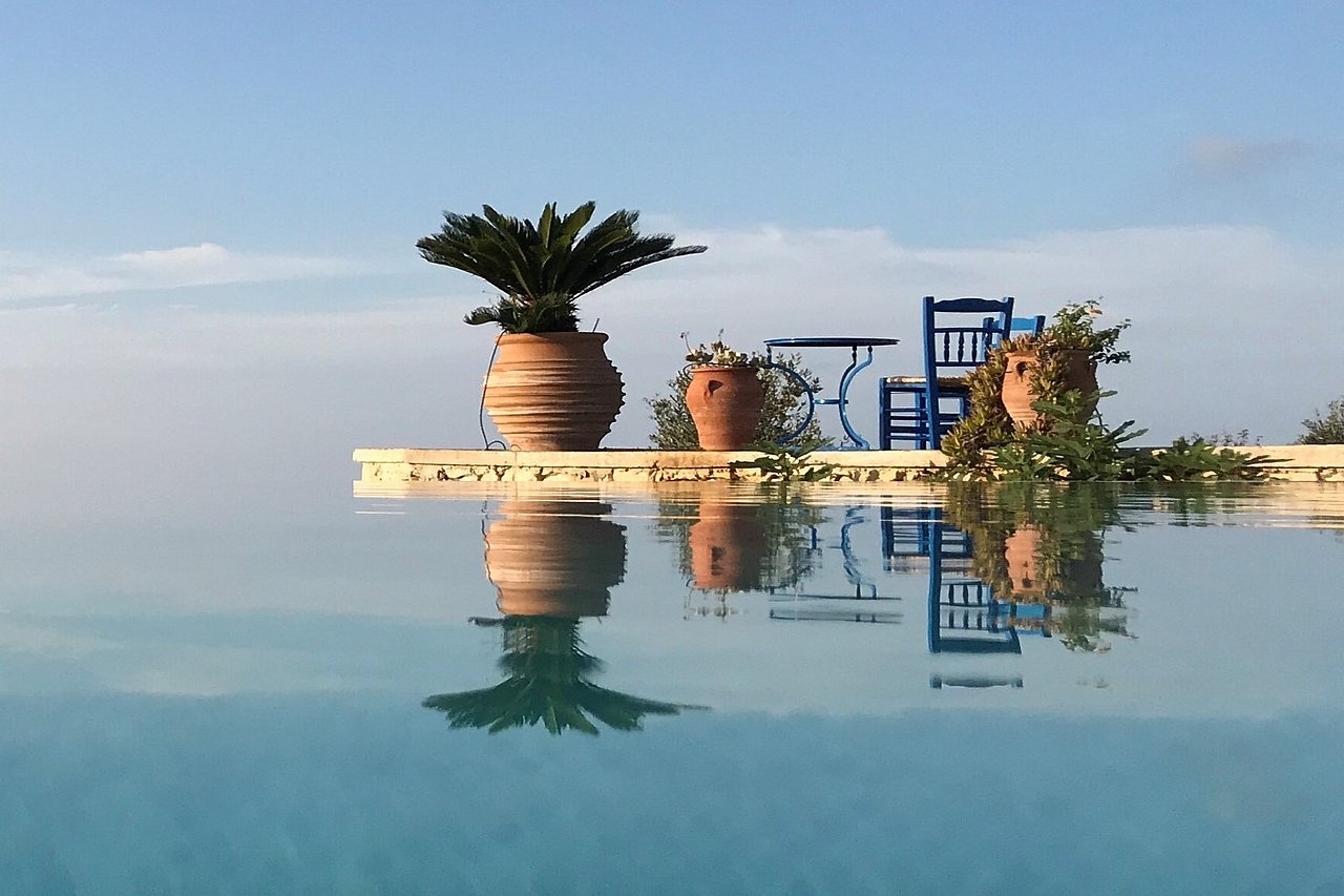 Ausgesucht bequeme und hochwertige Möbel im Haus, im Atrium und auf der Panoramaterrasse bieten Relaxmöglichkeiten für bis zu 8 Personen. Genießen Sie vom beheiztem Jacuzzi (ohne Sprudelfunktion ) aus die blutroten Sonnenutergänge und freuen Sie sich auf kühle Drinks unter dem großen Schatten spendenden Pool-Deck. Und wenn Sie sich satt gesehen haben am grenzenlosen Meerblick sind wir sicher, dass der malerische Innenhof einen ganz besonderen Zauber auf Sie ausüben wird. Ob eine verträumte Siesta auf dem großen kretischen Holzsofa oder ein abendliches Grillfest mit Freunden und Familie an der großen Tafel unterm Sternenhimmel. Das Atrium bietet Ihnen alle Optionen: Sonne, Schatten und bei Bedarf auch Schutz vor Wind und – theoretisch – sogar vor einem Regenschauer.