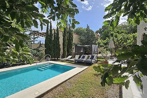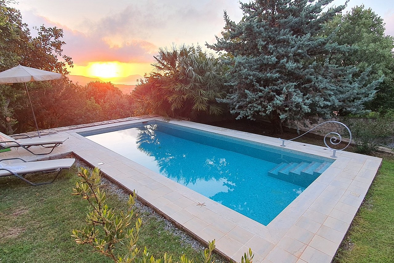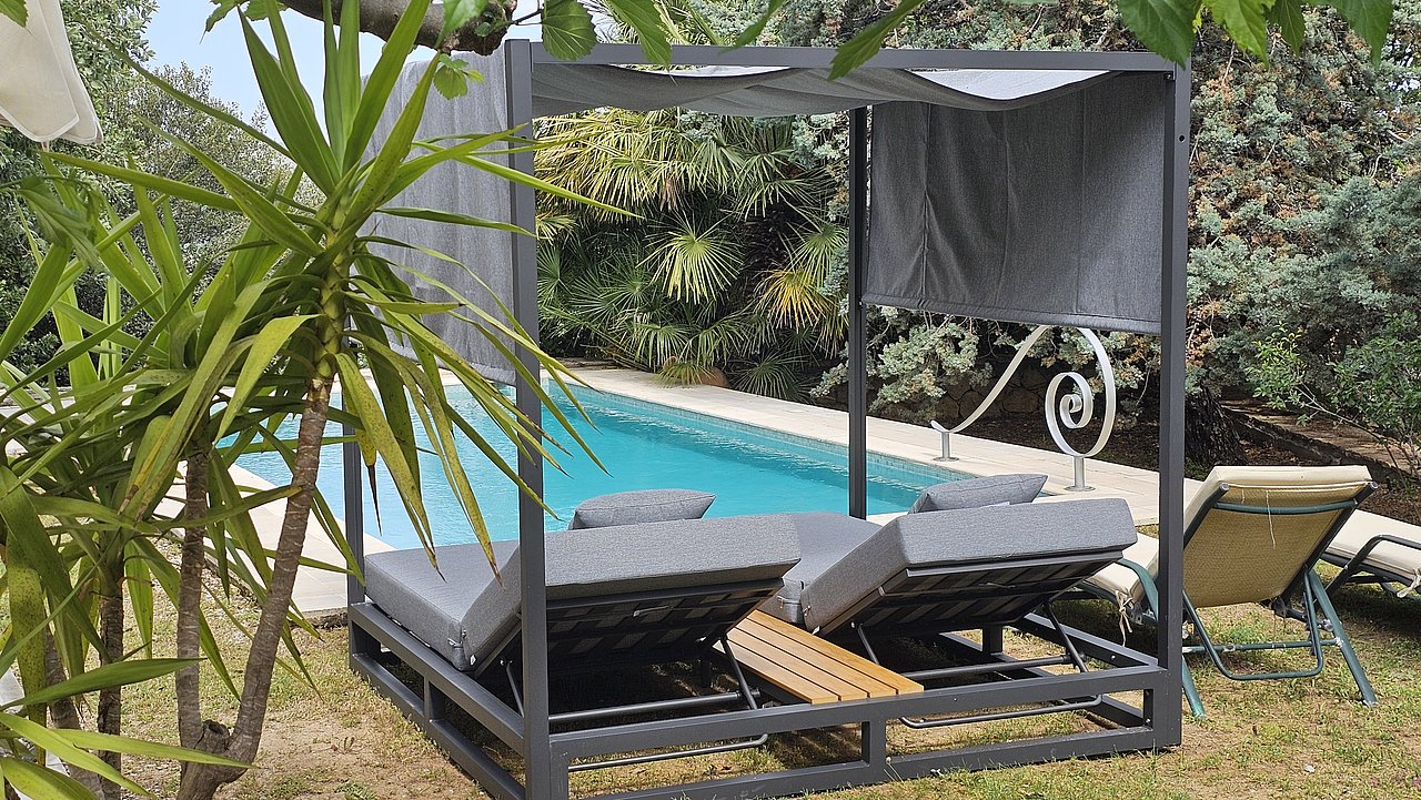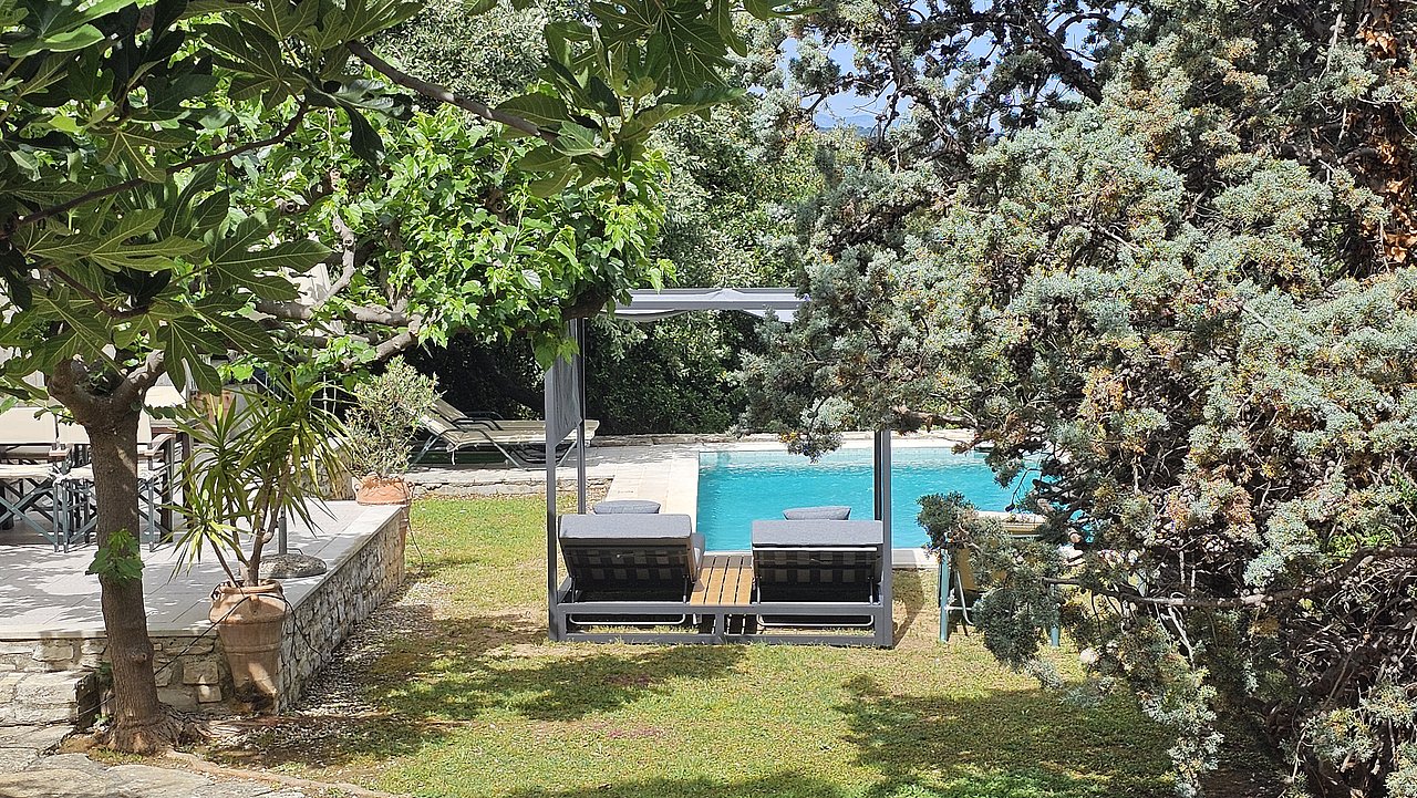 Im Garten befindet sich ein ca. 35 m² großer Swimmingpool mit Liegen, Sonnenschirmen und eine Terrasse mit Gartenmöbeln, sowie eine Außendusche.