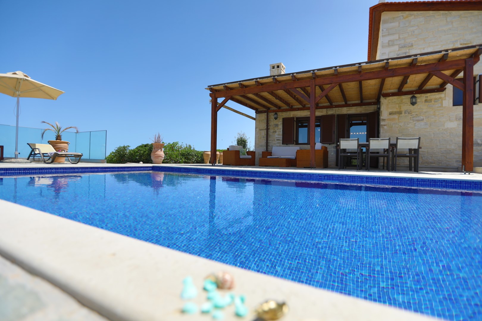 Draußen erwarten Sie der schöne große Pool und die große Terrasse mit Schatten spendender Pergola.