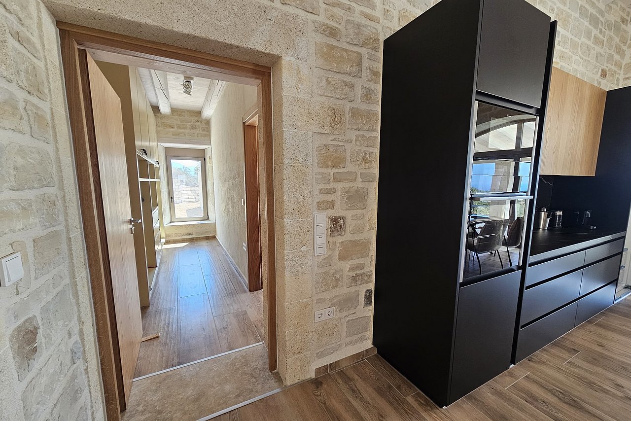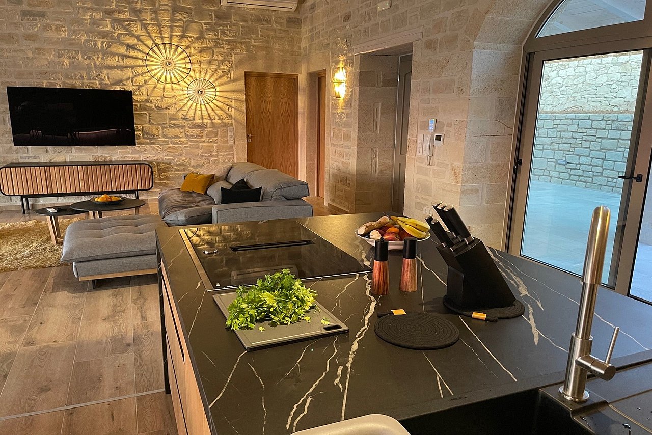 Der Innenbereich strahlt eine behagliche Atmosphäre aus, dominiert von einer exquisiten, offen gestalteten Küche, die nahtlos in den Wohn- und Essbereich übergeht. Die Küche überzeugt durch hochwertige Materialien und moderne Geräte, während der angrenzende Essbereich mit einem großen Tisch und bequemen Sitzgelegenheiten zum Verweilen einlädt. Komfortable Möbel und dezente Beleuchtung im Wohnbereich schaffen eine gemütliche Oase, die zum Entspannen und Genießen einlädt.