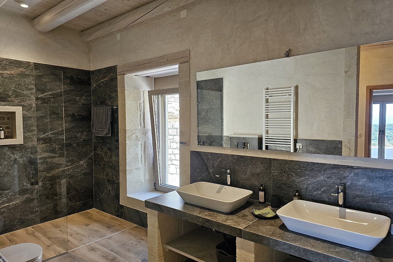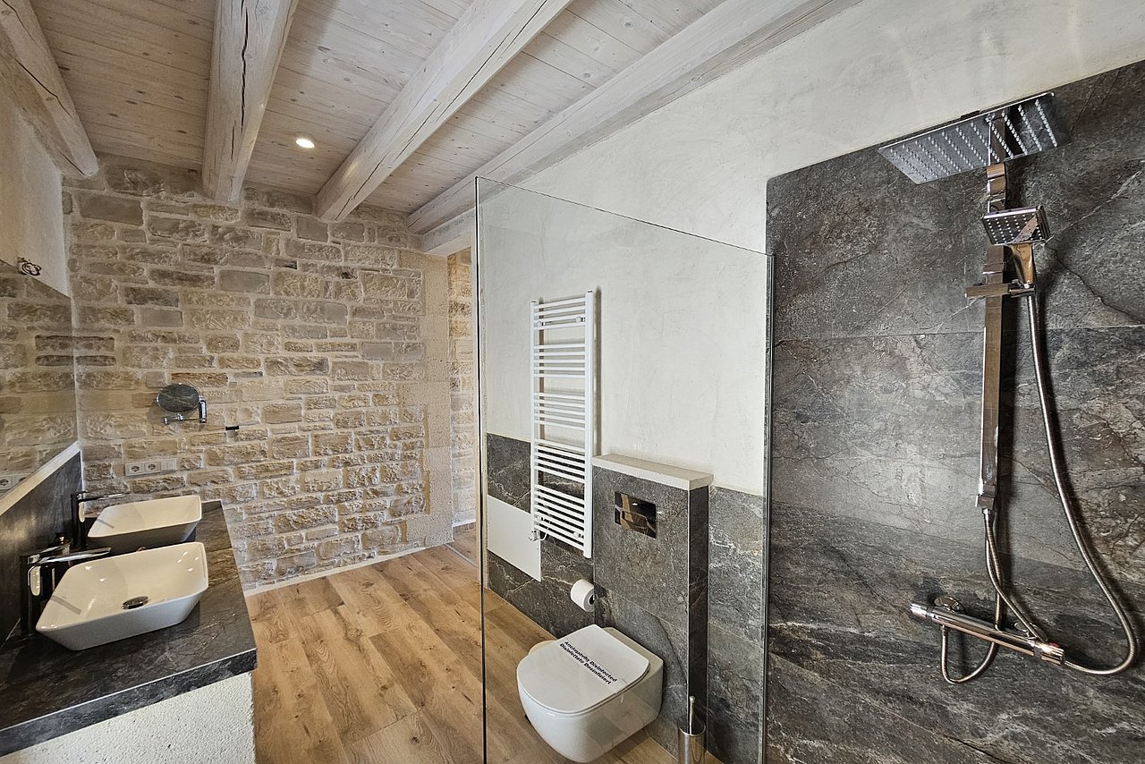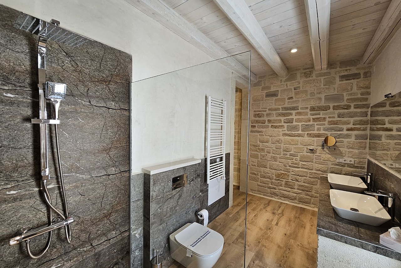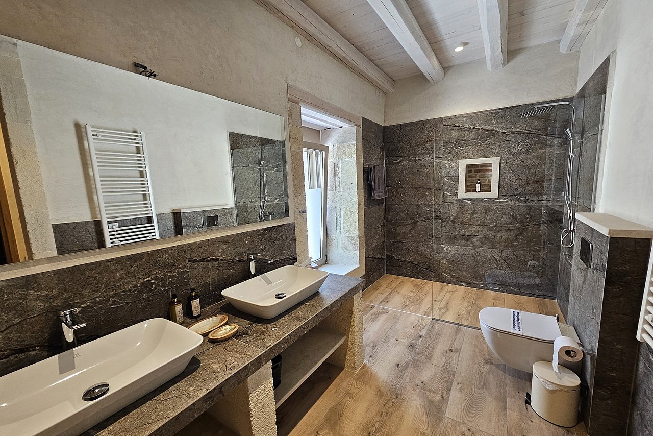 2 Bäder mit je 2 Waschbecken, offene große Dusche mit rutschfesten Boden, Föhn, Lockenstab, Schminkspiegel,